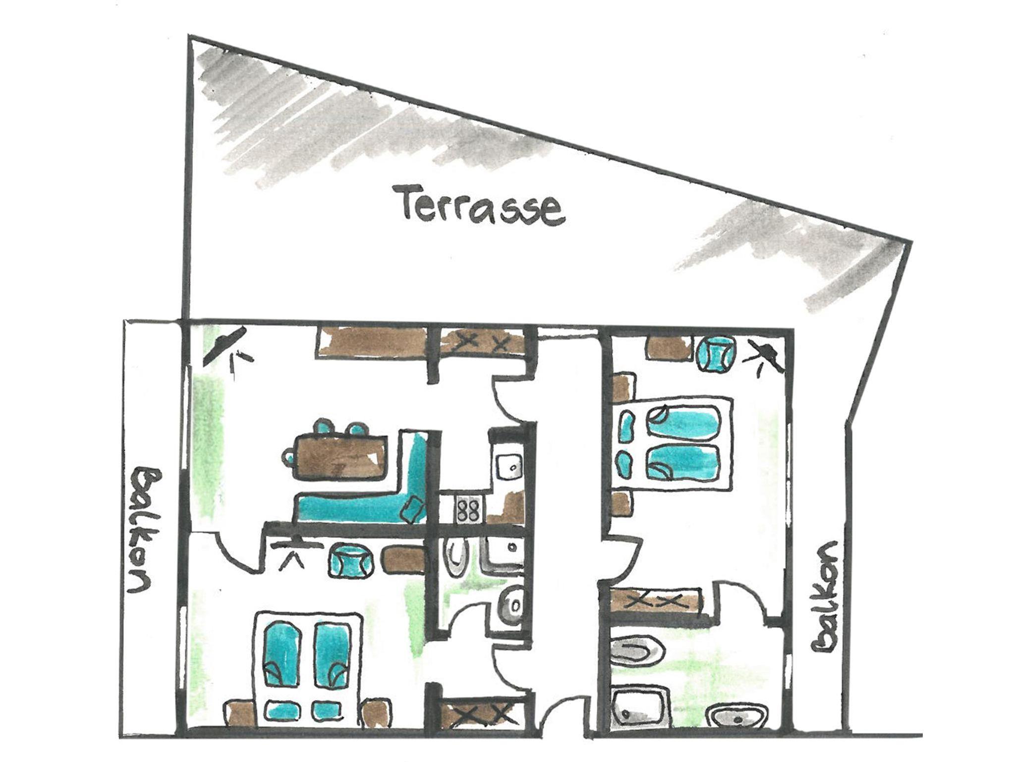 Die Wohnküche ist für maximal 8 Personen ausgelegt. Bei Bedarf kann die Wohnung um ein angrenzendes Doppelzimmer erweitert werden. Das Zimmer verfügt über DU/WC, Kabel Flat-TV 32“, gratis W-LAN sowie einen Balkon.