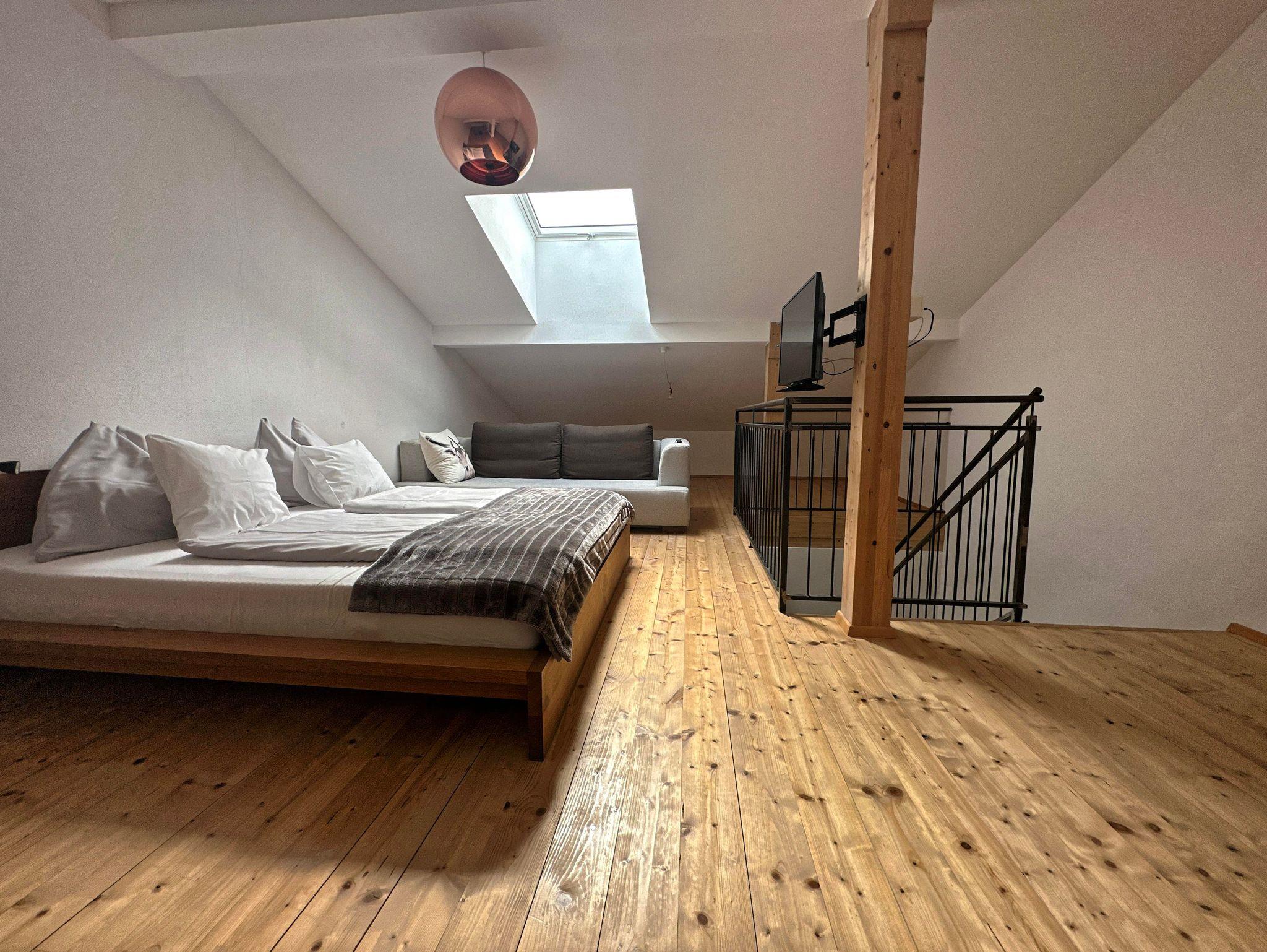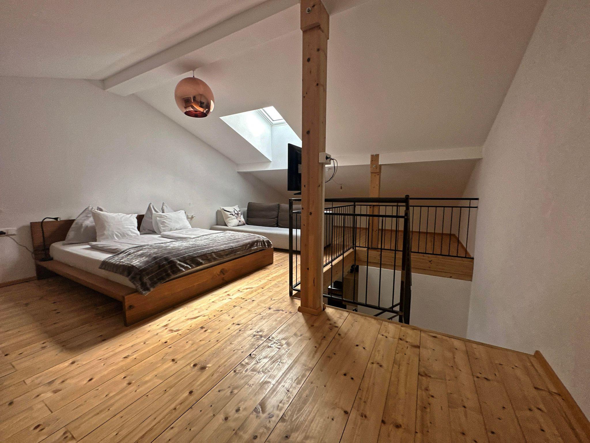 Die Ferienwohnung Hochsitz ist über eine Außentreppe im ersten Stock zu erreichen. Die Gesamtfläche der Ferienwohnung Hochsitz ist ca. 100qm. Über einen eigenen Eingang gelangt man in den Vorraum mit genügend Platz für Jacken und Schuhe. Unter der Sitzbank befindet sich auch ein Schuhtrockner für nasse Wander- oder Schischuhe. Danach betritt man den geräumigen Wohnraum mit Essecke, Küchenzeile und großem Wohnzimmerbereich. Vom Wohnzimmer gelangt man auf die große, westseitige Terrasse. Schlafzimmer und ein Badezimmer befinden sich auch noch auf dieser Ebene. In der Ferienwohnung Hochsitz gibt es zwei Schlafzimmer. Wobei eines ein Galeriezimmer ist, welches über eine Treppe vom Wohnzimmer aus erreichbar ist.