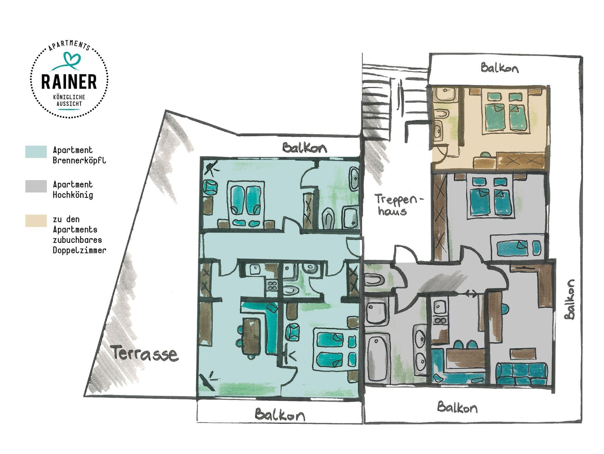 Appartement Brennerköpfl (68m² - 2 bis 5 Personen) Das Appartement „Brennerköpfl“ bietet 2 bis 5 Personen eine moderne top ausgestattete Wohnküche, wahlweise buchbar mit 1 oder 2 Schlafzimmern. Die Schlafzimmer verfügen über DU/WC, Kabel Flat-TV 32“, gratis W-LAN, Balkon und eine große Sonnenterrasse mit Grillplatz. Die Wohnküche ist für maximal 8 Personen ausgelegt. Bei Bedarf kann die Wohnung um ein angrenzendes Doppelzimmer erweitert werden. Das Zimmer verfügt über DU/WC, Kabel Flat-TV 32“, gratis W-LAN sowie einen Balkon. Die Preise richten sich nach Personenanzahl und Reisezeit.