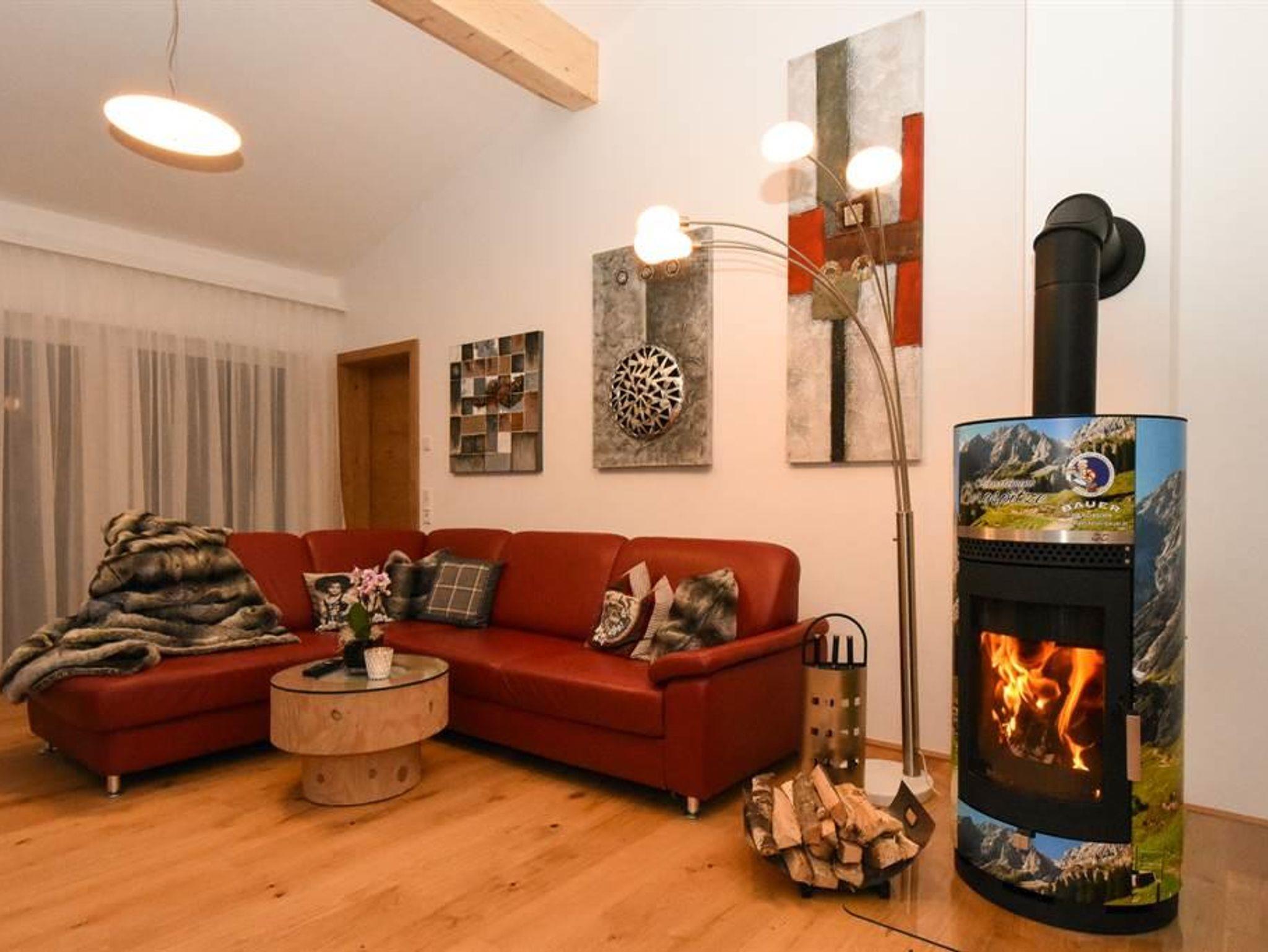 Ein Schlafzimmer mit Kingsize-Boxspringbetten mit großem Badezimmer mit Dusche, getrenntem WC, Radio, Kosmetikspiel, Fön und Infrarotkabine. Zweites Schlafzimmer mit Kingsize-Boxspringbetten, einer gemütlichen Couch (Zusatzbett) westseitig gelegenem Balkon und eigenem Badezimmer mit Dusche, WC, Radio, Kosmetikspiel und Fön. Sehr großzügiger Lebensraum mit Kaminofen, Kuschelecke mit Ausziehcouch (Zusatzbett) und großem Mühlsteintisch, großer Flatscreen mit Kabel-TV, komplett ausgestatteter Küche mit Esstisch. Großer Balkon mit Blick auf den Hochkönig und das Gartenhaus. Genügend Platz für ein Gitterbett.