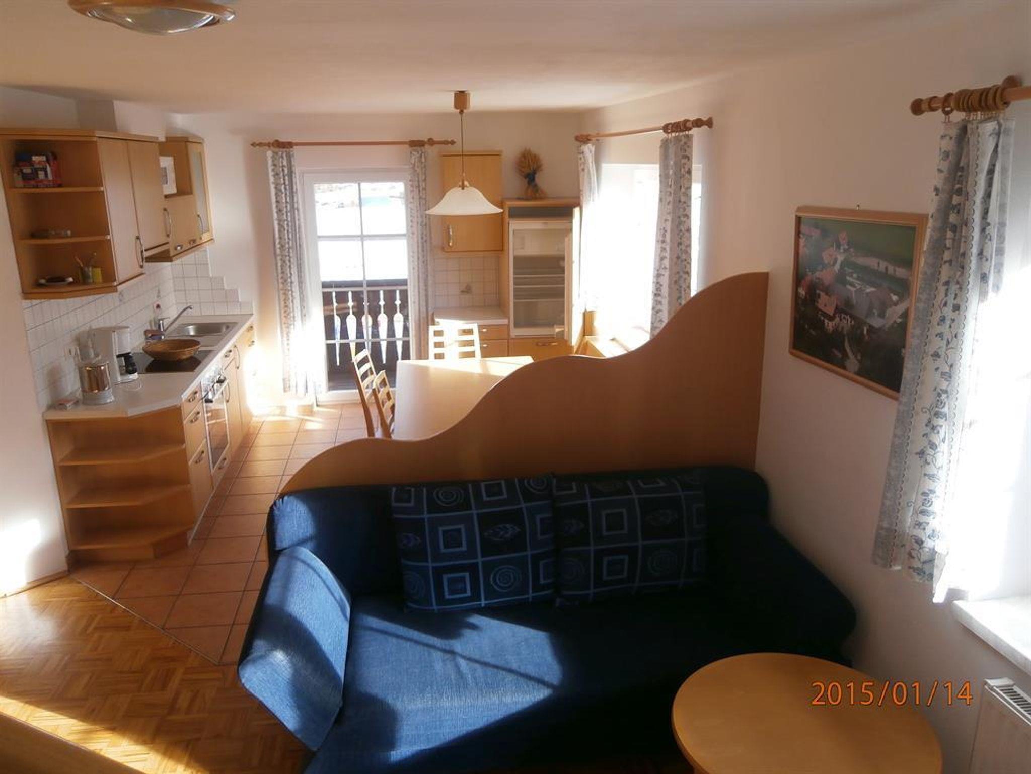 75 m² Wohnung auf 2 Etagen, in einem Nebengebäude direkt am Bauernhof, mit geräumiger Wohnküche mit E-Herd mit Backrohr, Kühlschrank mit Gefrierfach, Mikrowelle, Filterkaffeemaschine, Wasserkocher, Koch-und Essgeschirr, Eckbank mit Esstisch, Sitzgruppe mit Couch, SAT-TV und WLAN, 2 Schlafzimmer, Badezimmer mit Eckbadewanne, WC und Balkon. In den Schlafzimmern Vollholzmöbel aus Fichte und Parkettböden.