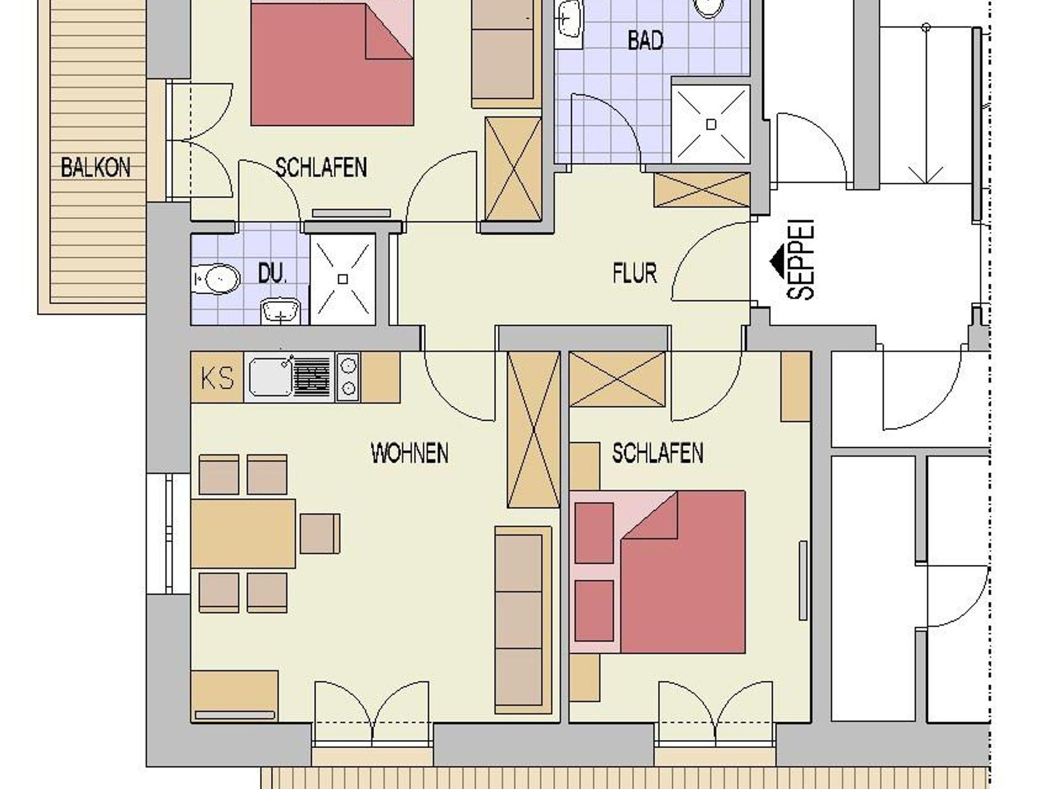 Das Apartment ist für 2 bis 6 Personen gedacht. Es liegt im 1. Stock und hat 2 Balkone mit herrlichem Blick auf die umliegende Bergwelt. Im Sommer können Sie die angenehme Abendsonne genießen.