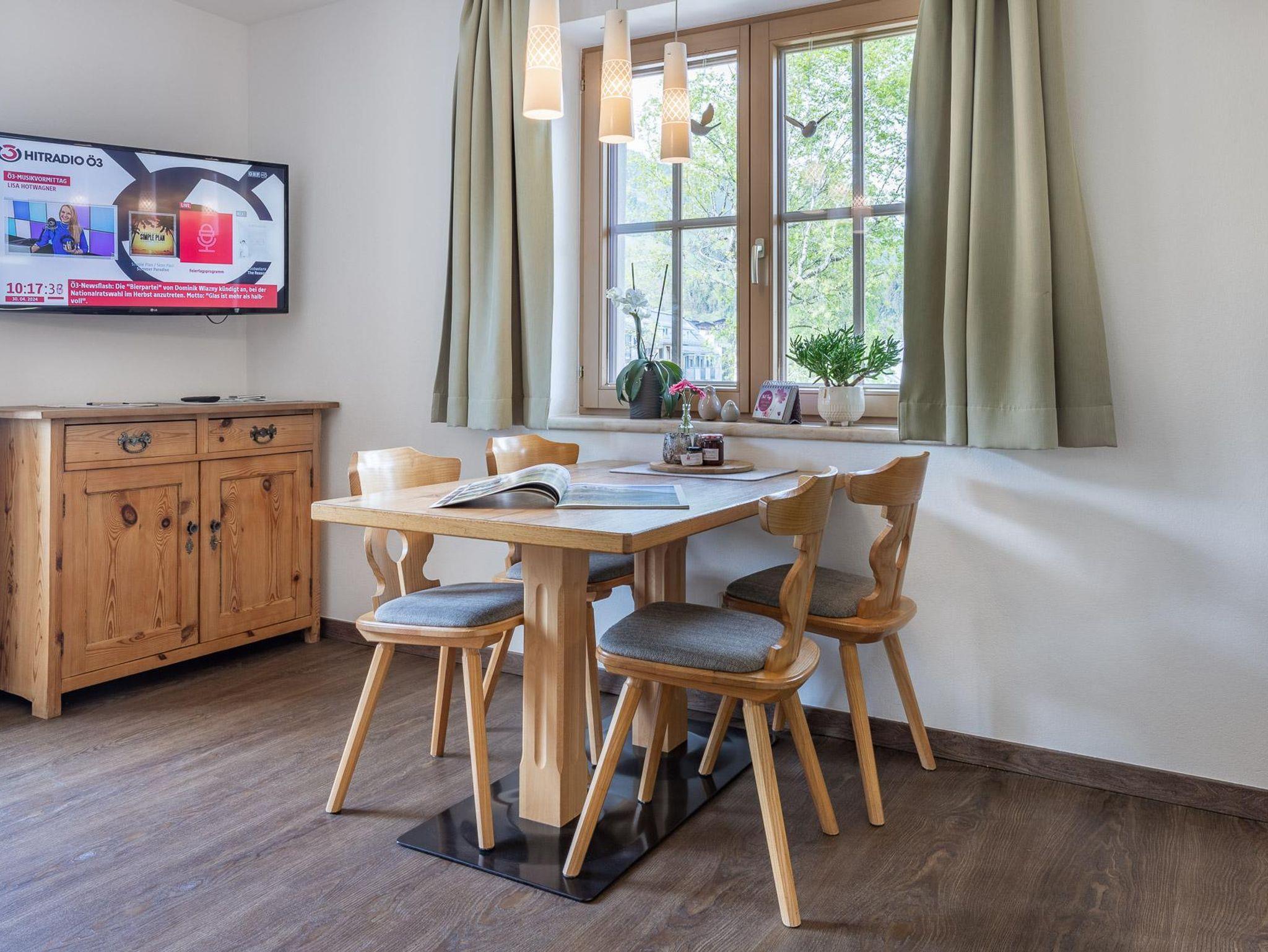 Großzügiger Wohn-Küche-Essraum - hochwertige Einrichtung mit Möbeln im modern-alpinen Stil. Gemütliche Ausziehcouch + Flat-TV, Küchenzeile mit allen Kochutensilien; einer Caffissimo-Kaspel-Cafemaschine und einer Filterkaffeemaschine