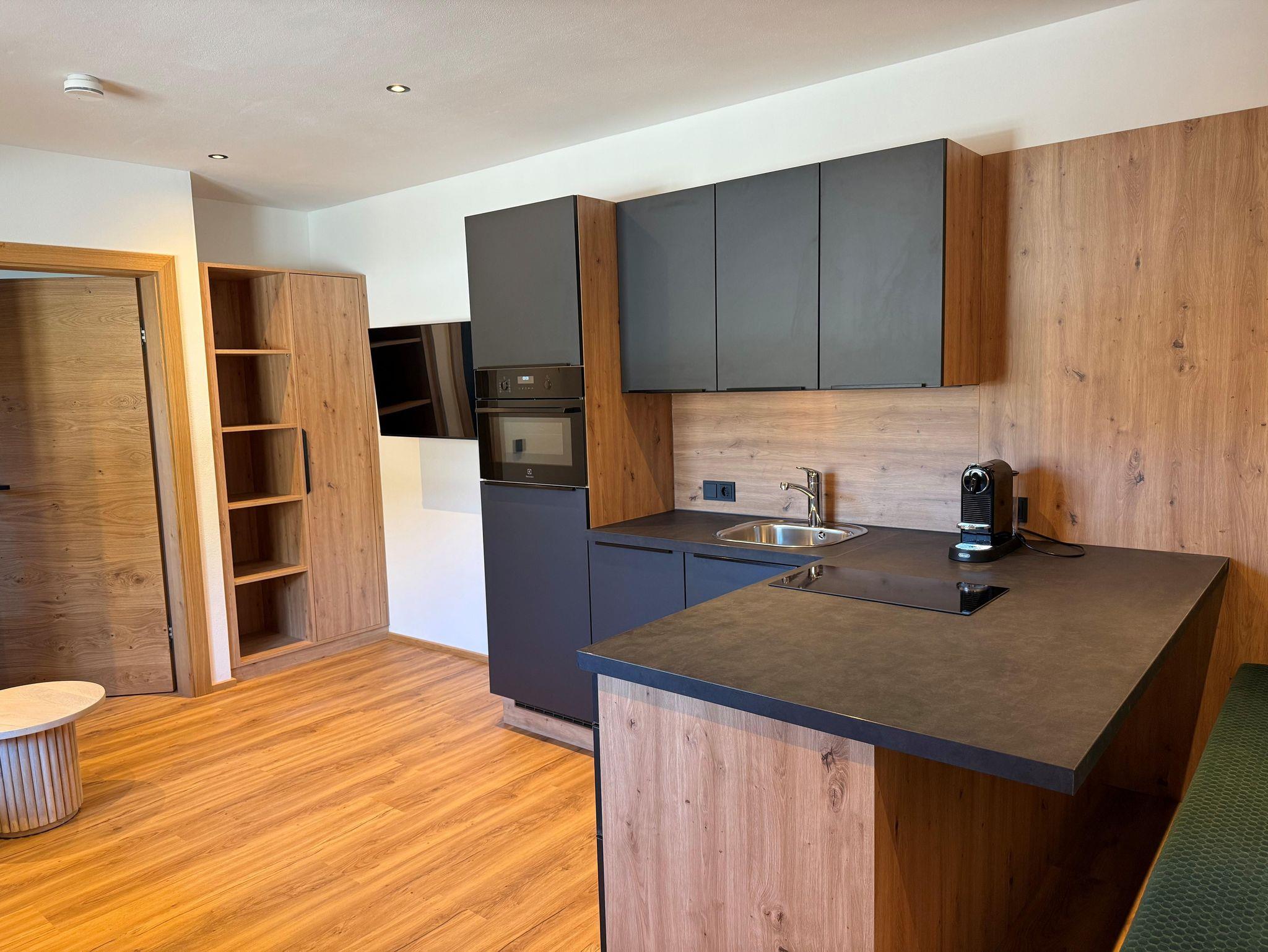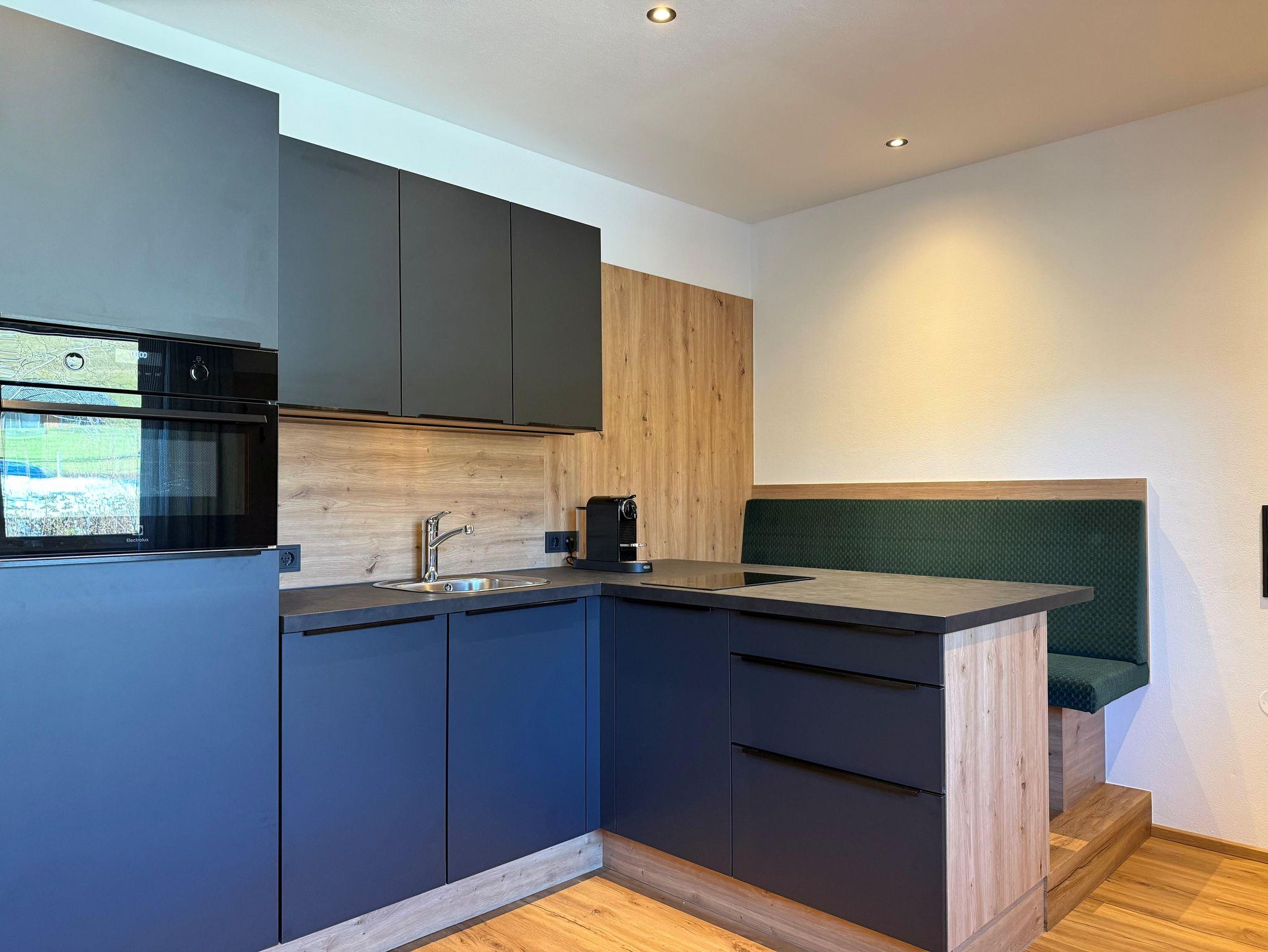 Die 35 m² große Ferienwohnung bietet einen komfortablen und funktionalen Wohnraum für einen angenehmen Aufenthalt. Der offen gestaltete Wohnbereich verfügt über eine gut ausgestattete Küche mit integrierter Sitzgelegenheit, die Platz zum Kochen und Verweilen bietet.