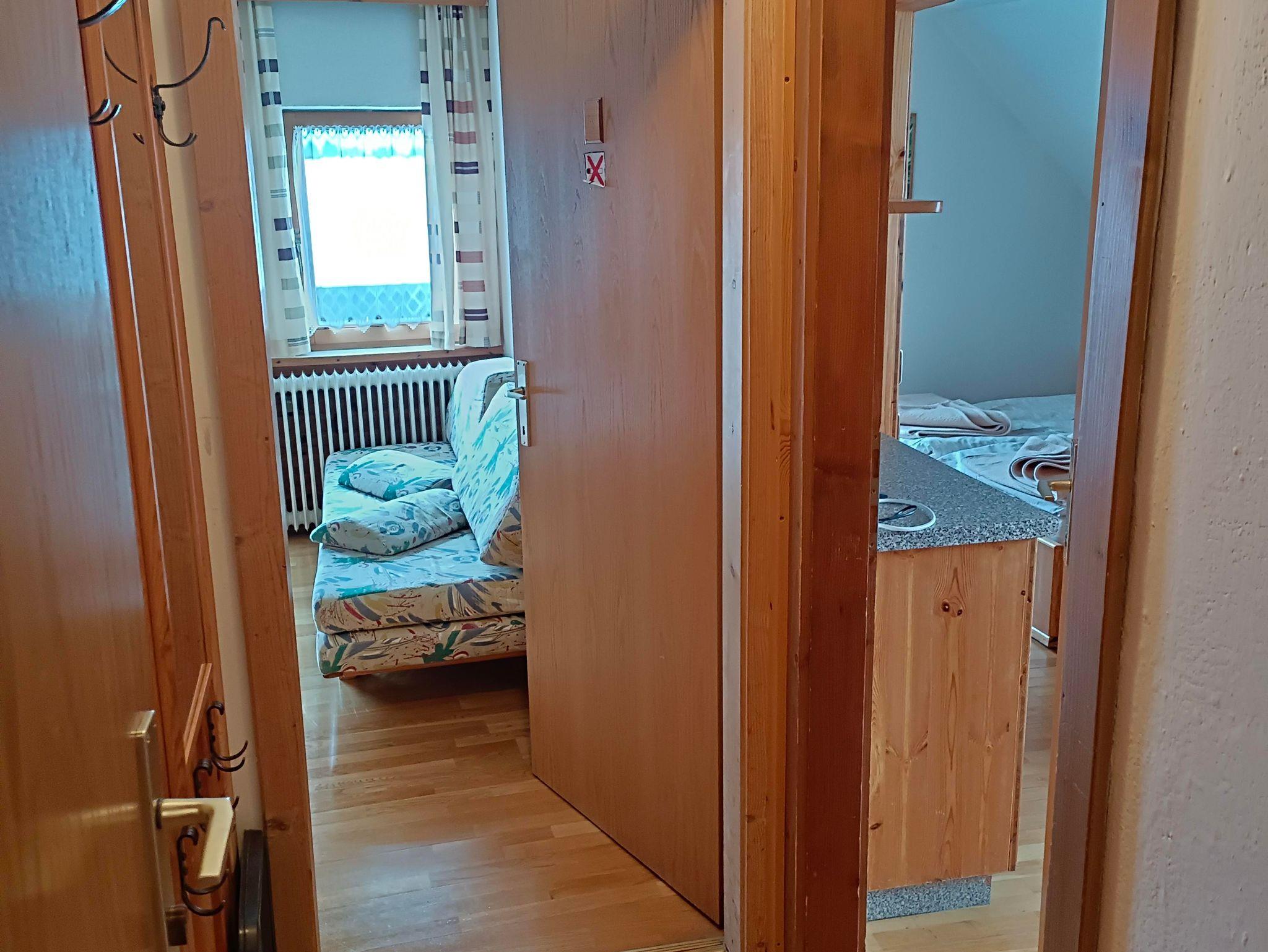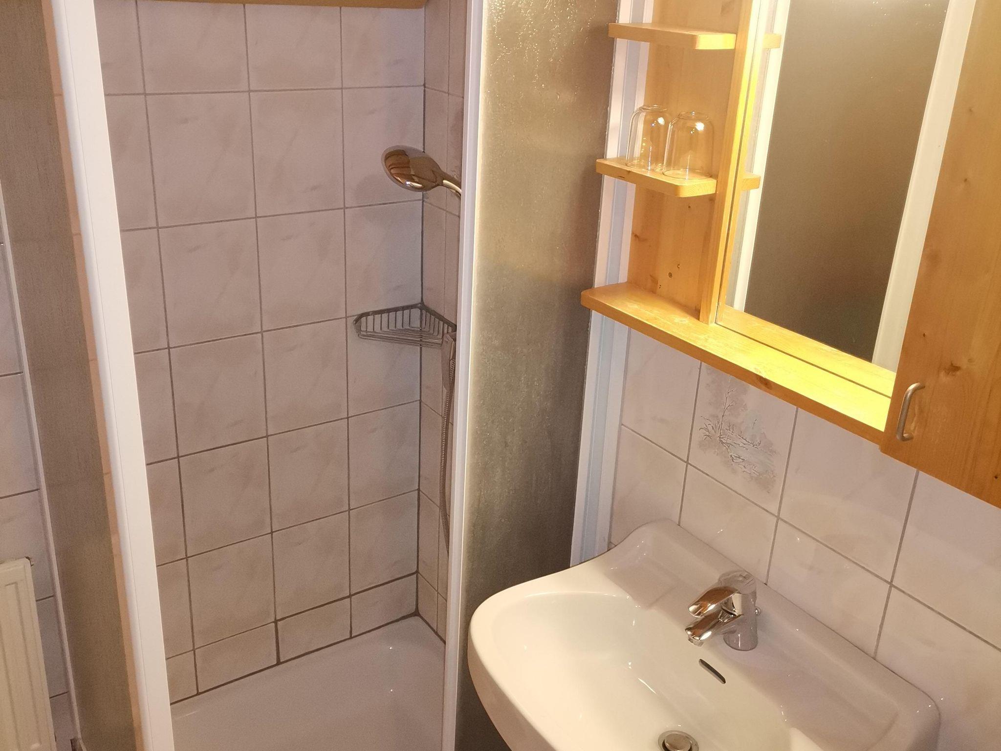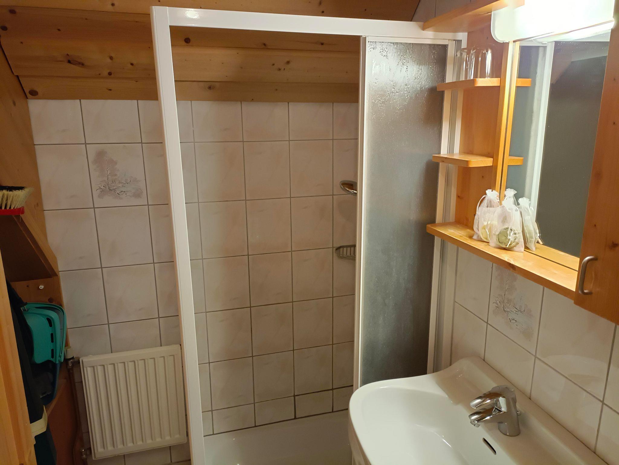 Die Ferienwohnung mit Fichten- und Kiefernholz verfügt über einen Balkon, 2 Duschen, 2 WCS, eine hell gehaltene Wohnküche mit Schlafzimmer, 2. getrenntes Schlafzimmer und Vorraum.
