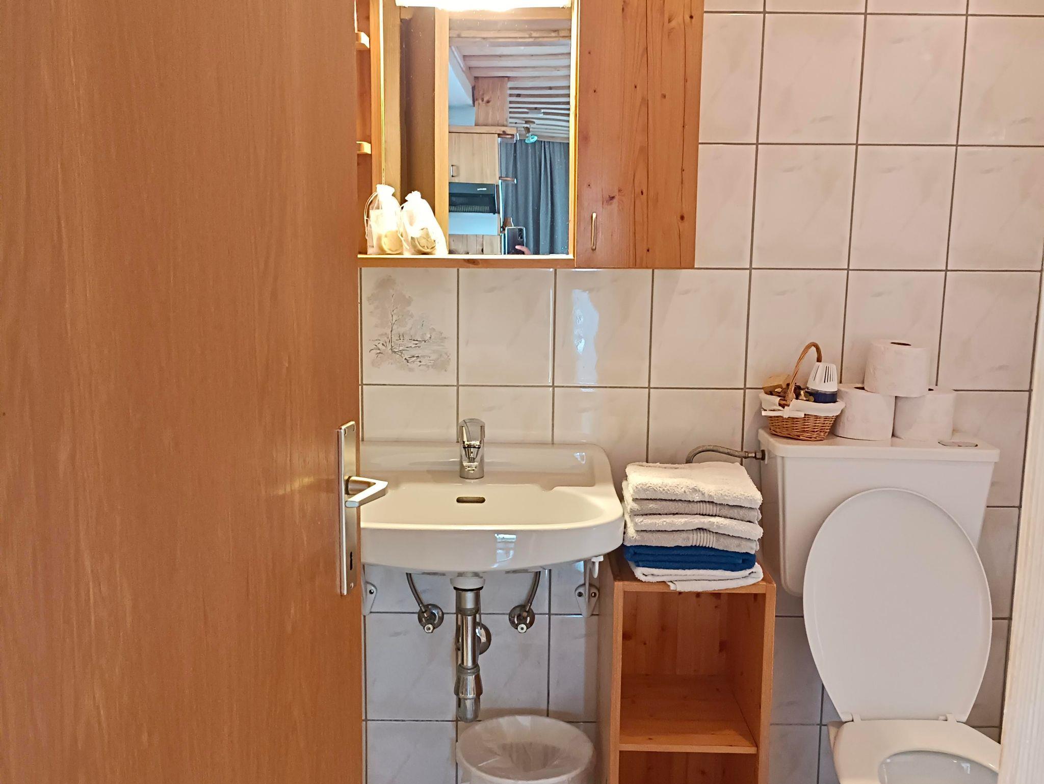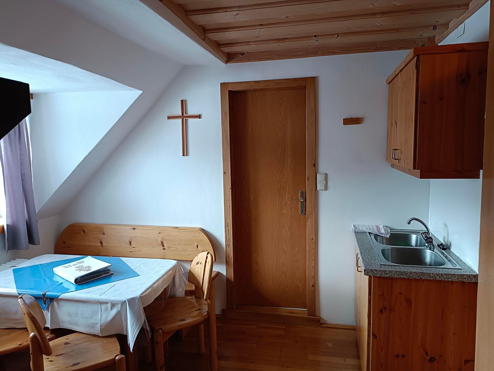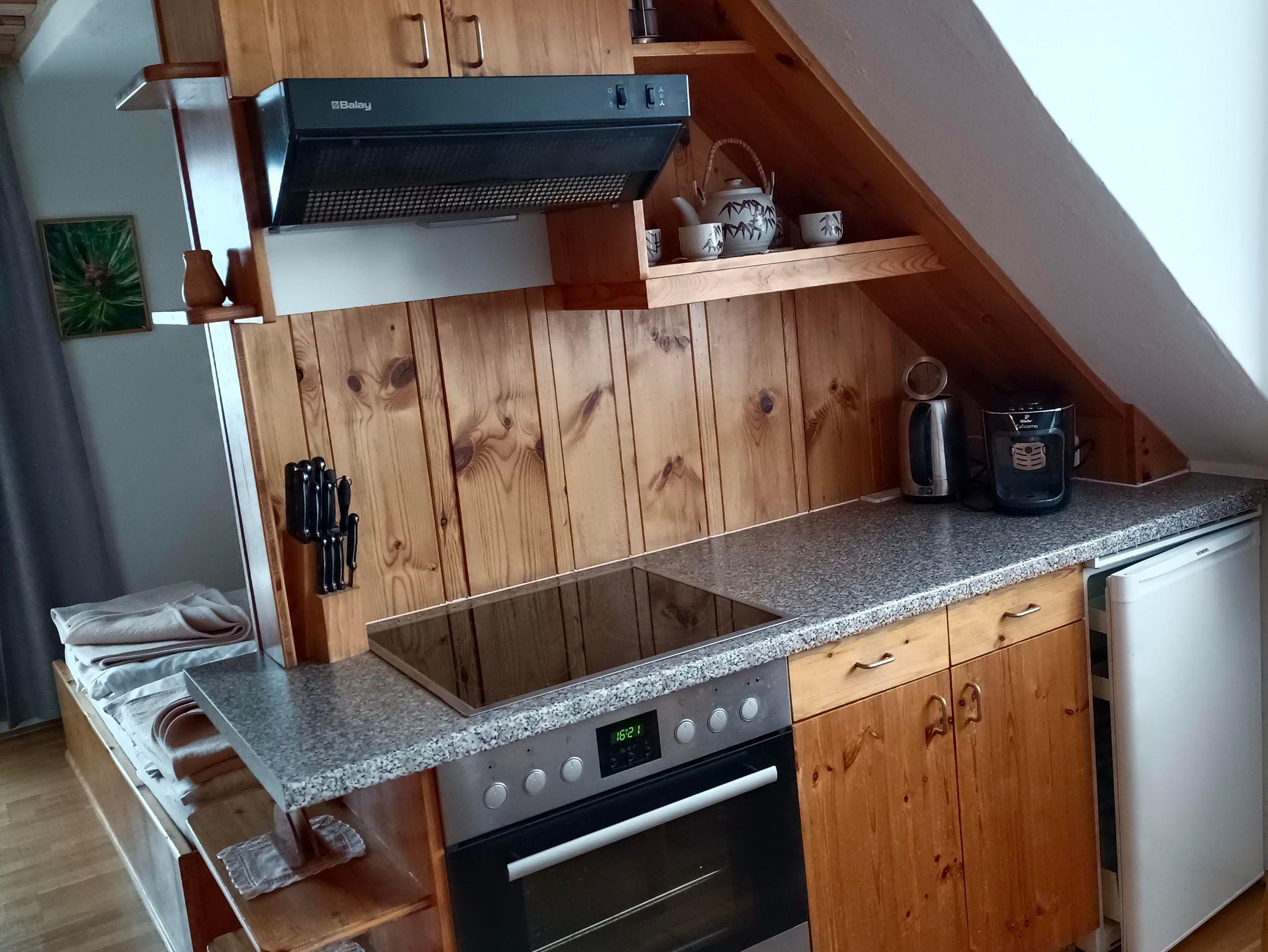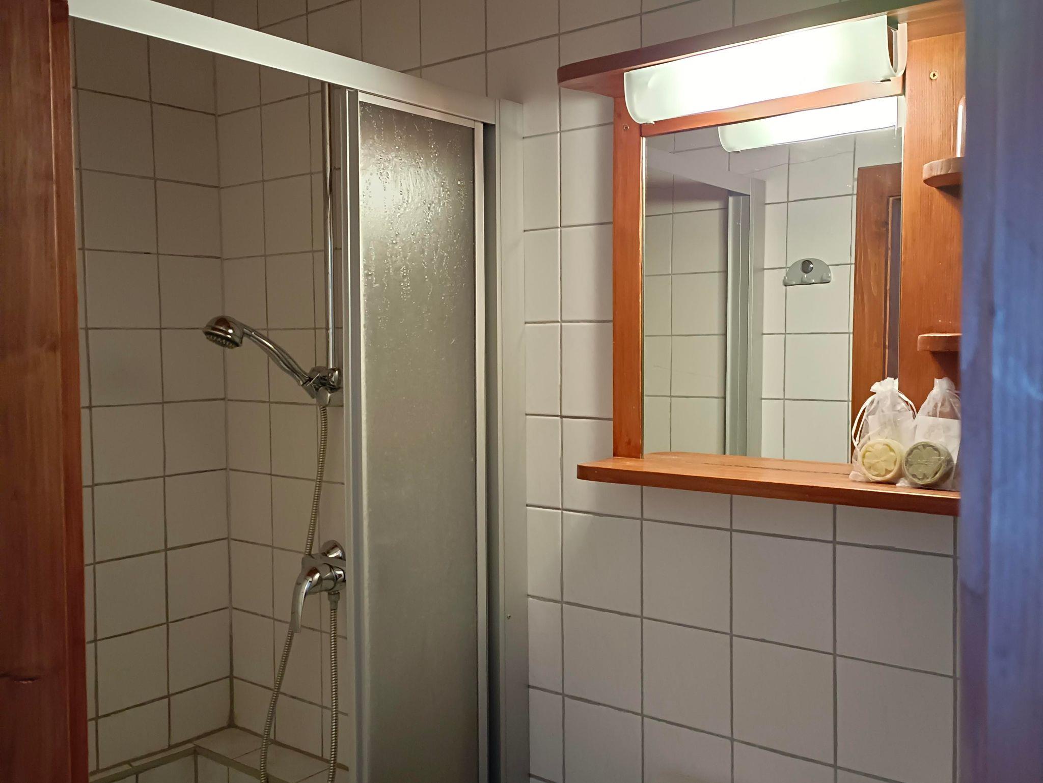 Die Ferienwohnung mit Fichten- und Kiefernholz verfügt über einen Balkon, 2 Duschen, 2 WCS, eine hell gehaltene Wohnküche mit Schlafzimmer, 2. getrenntes Schlafzimmer und Vorraum.