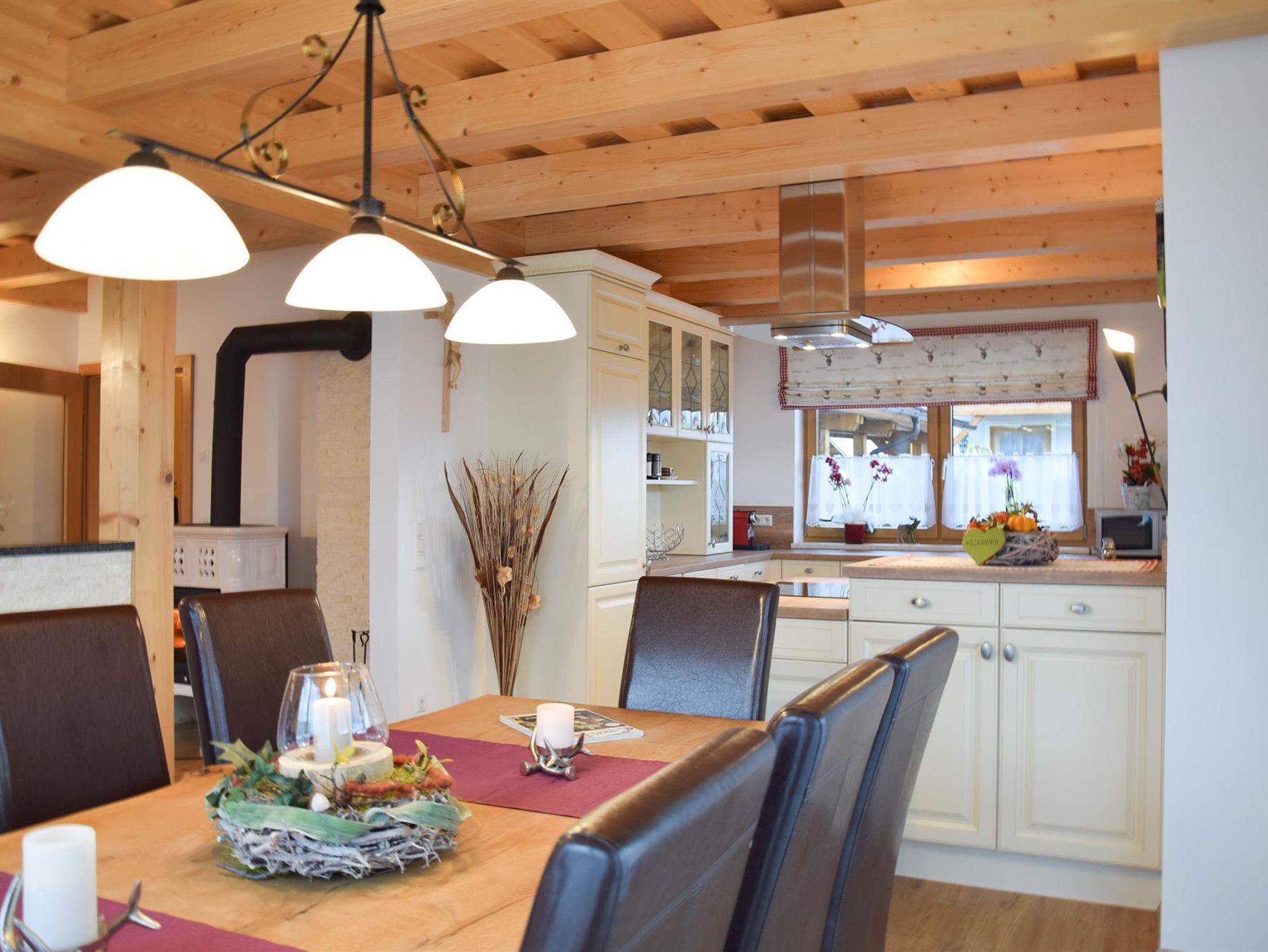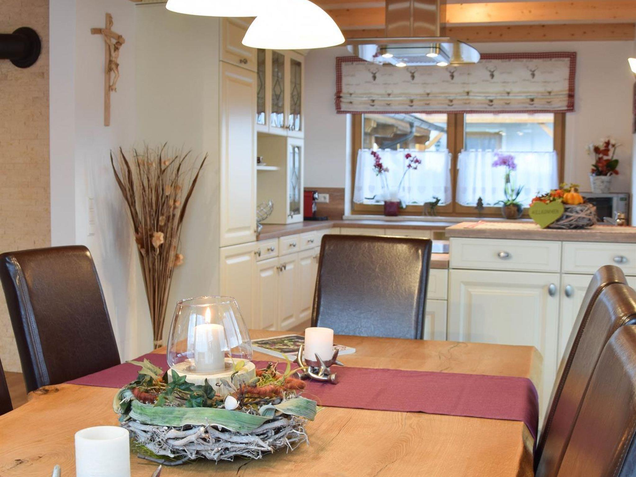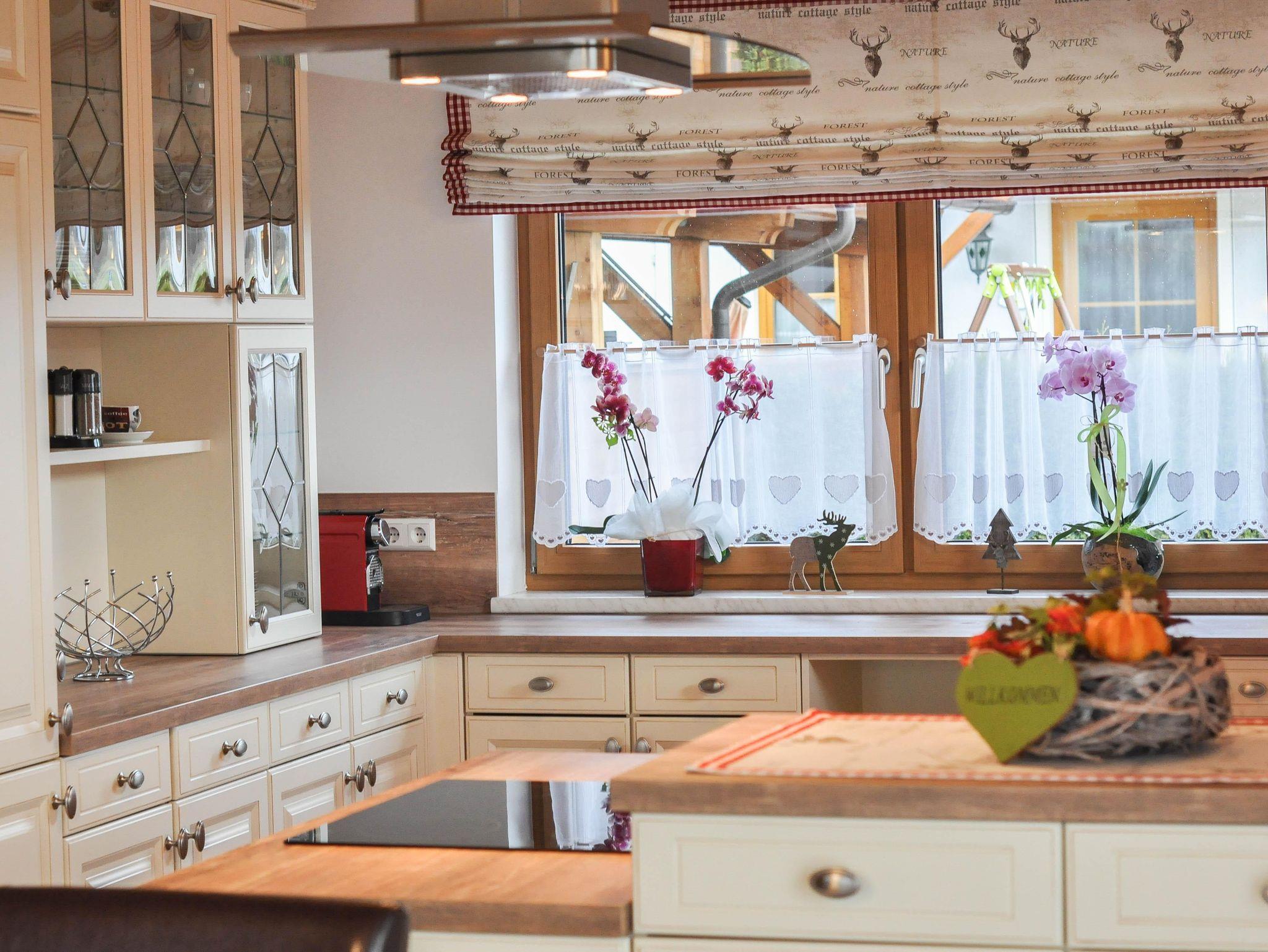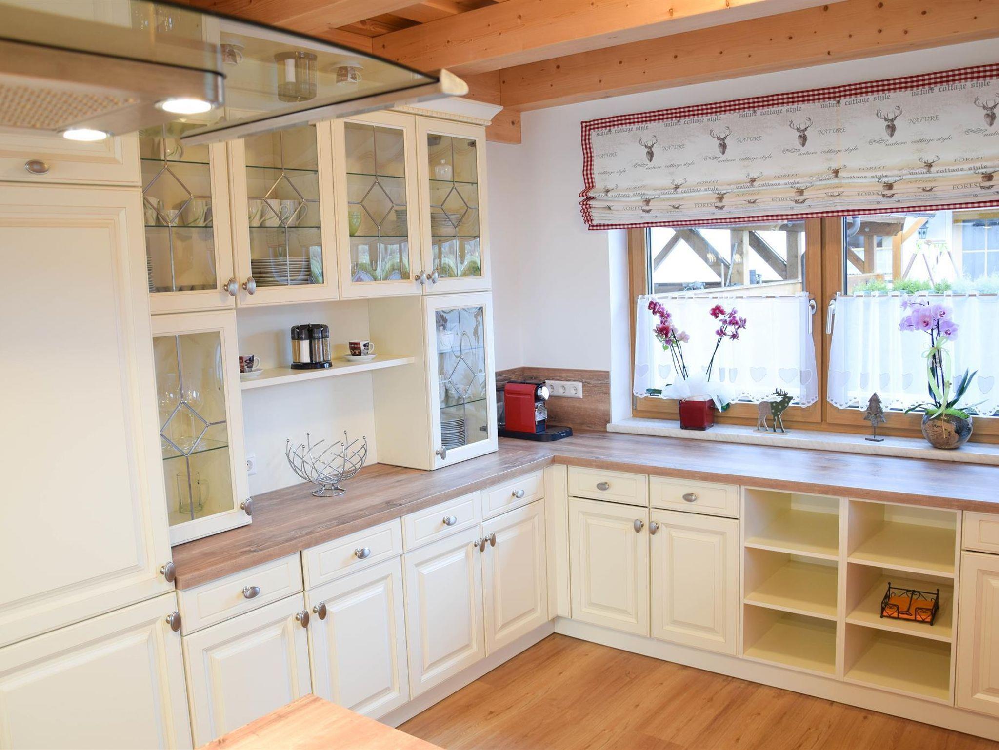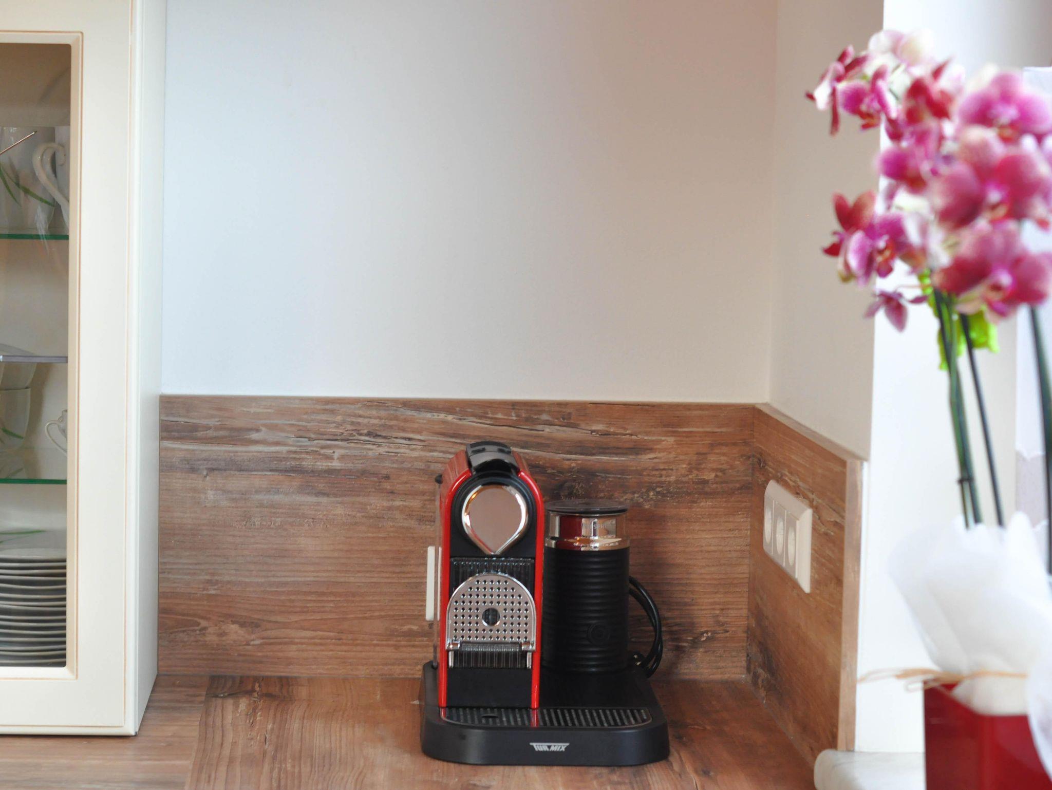 Komplett ausgestattete Küche mit E-Herd mit Cerankochfeld, Backrohr, Kühlschrank mit Gefrierfach, Geschirrspüler, Nespresso Kaffeemaschine, Wasserkocher, Koch- und Essgeschirr