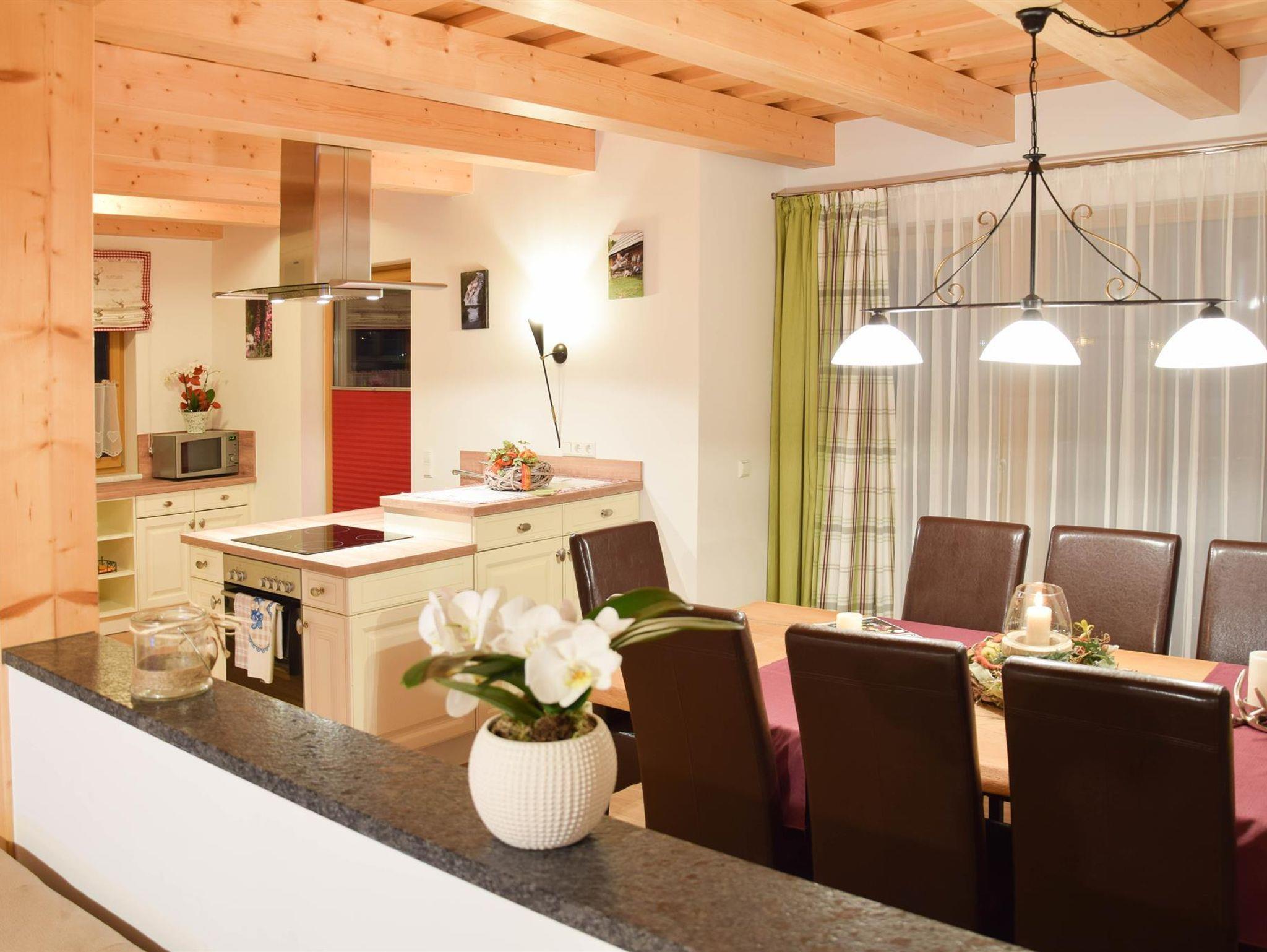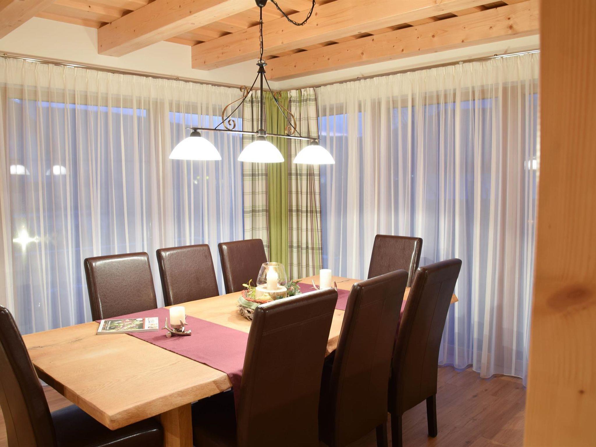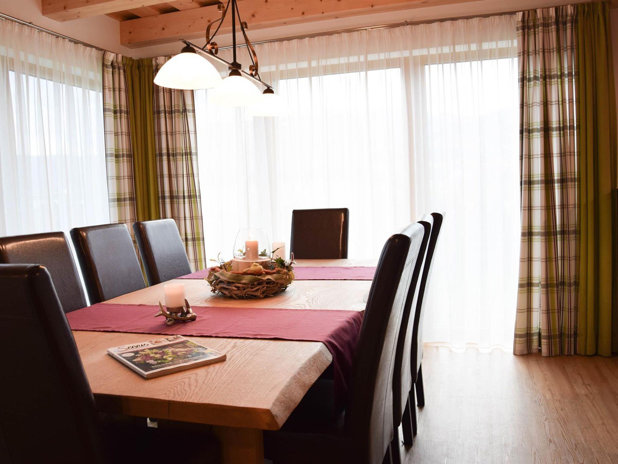 Verglaster Essbereich mit Panoramablick auf die umliegenden Berge