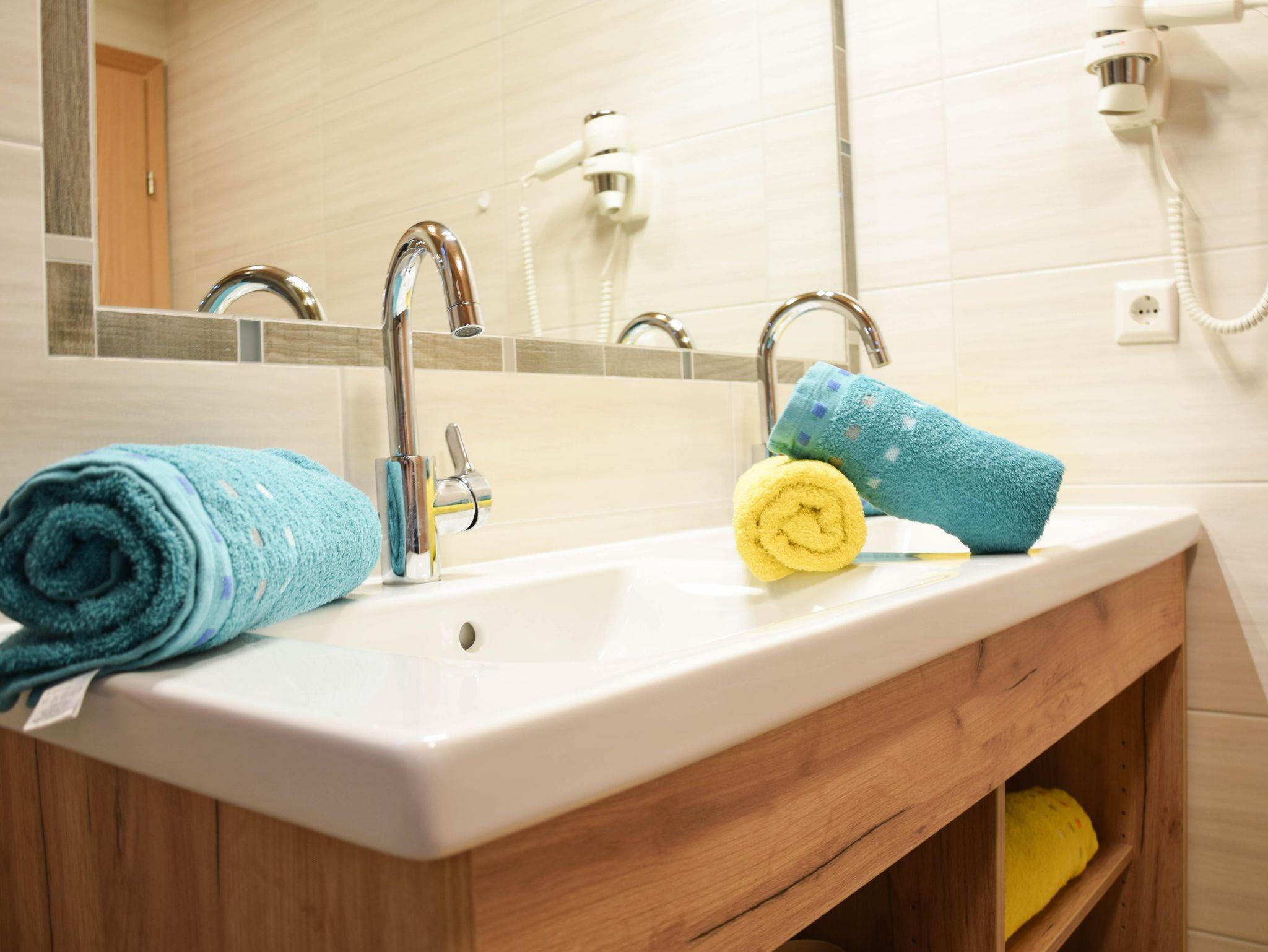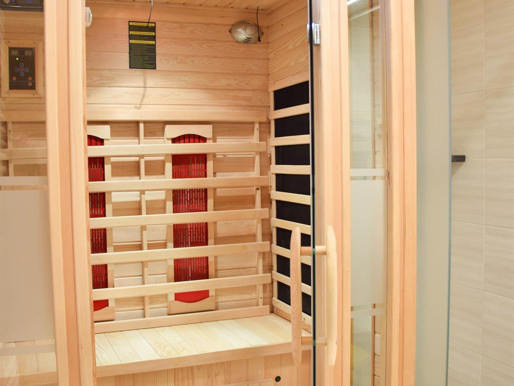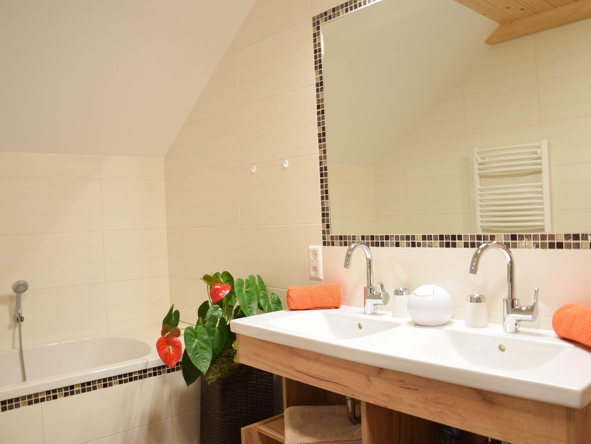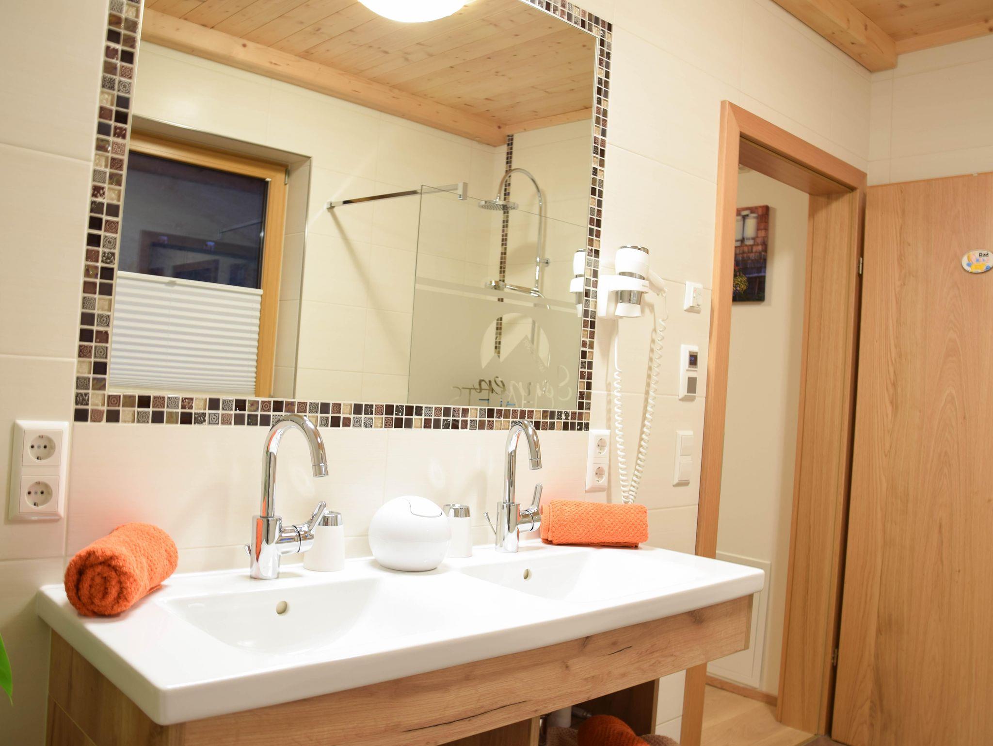 2 Badezimmer; das Bad im Erdgeschoß verfügt über eine Infrarotsauna. Jenes im OG zusätzlich eine Badewanne