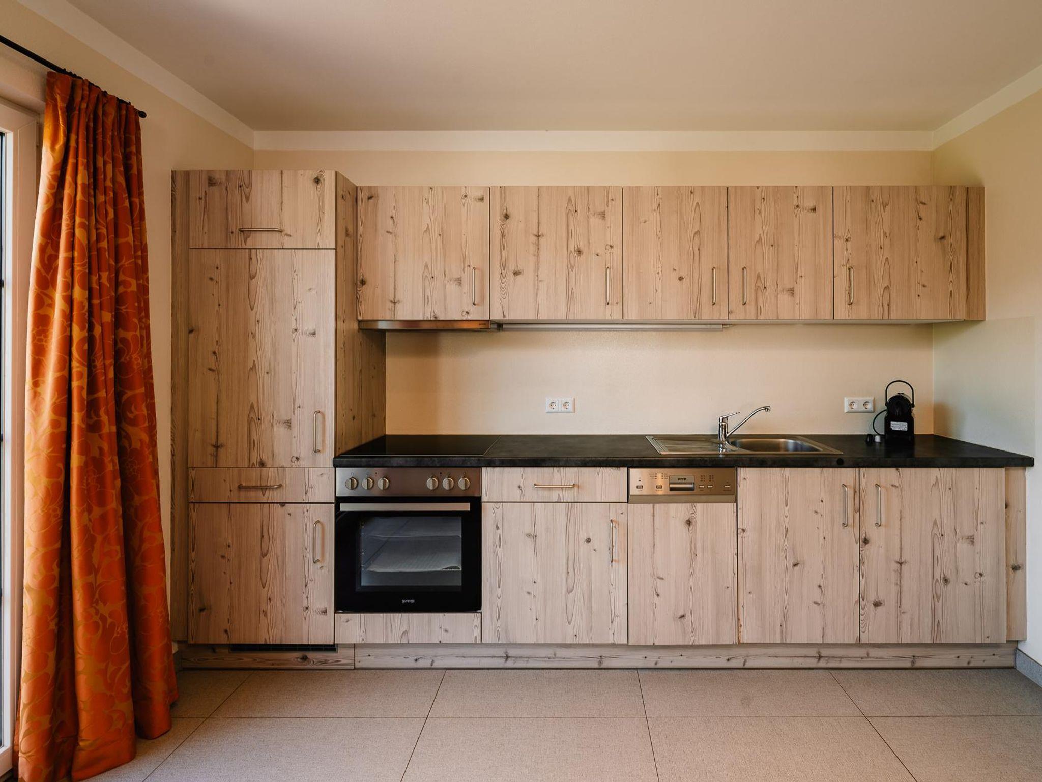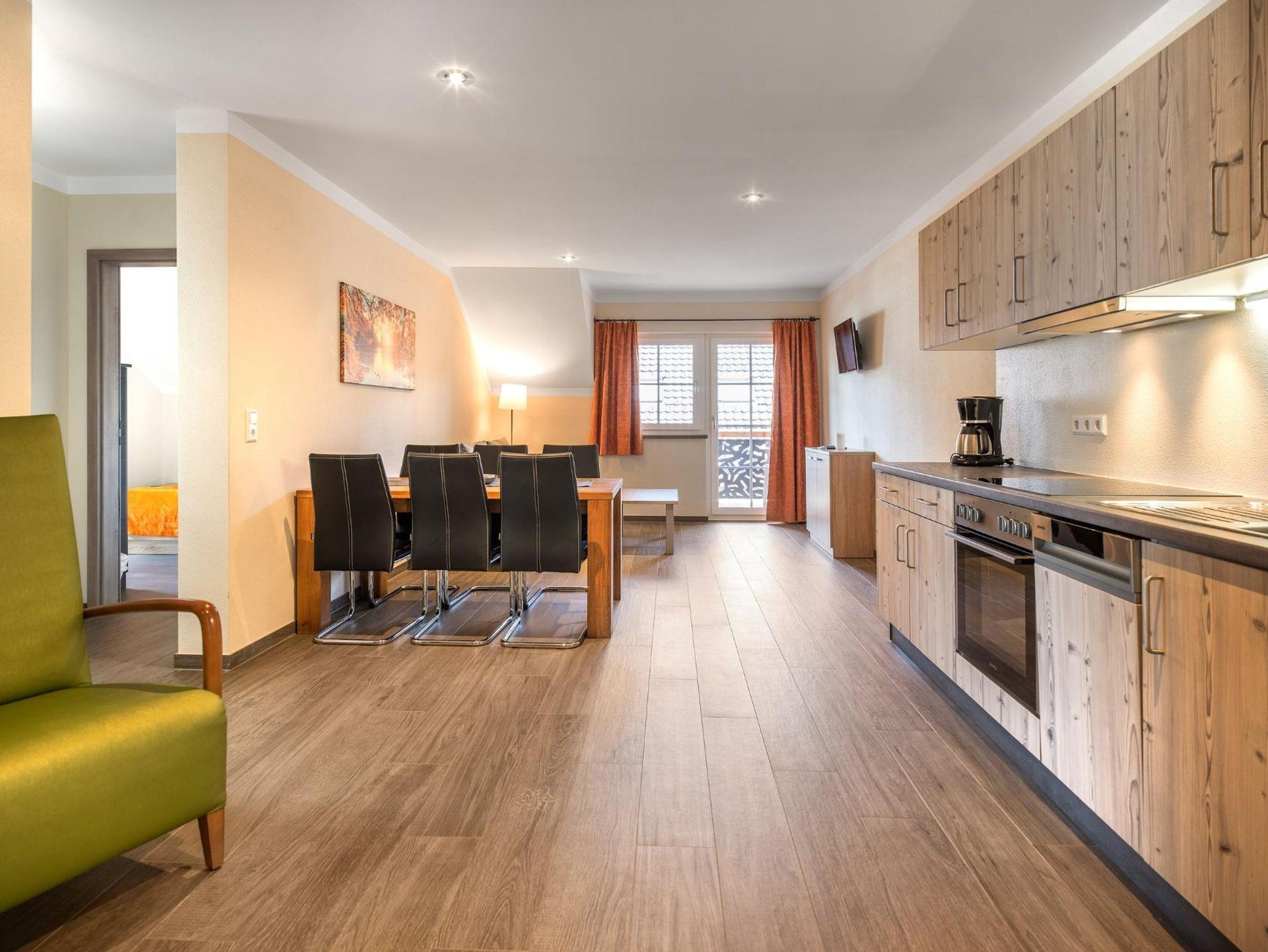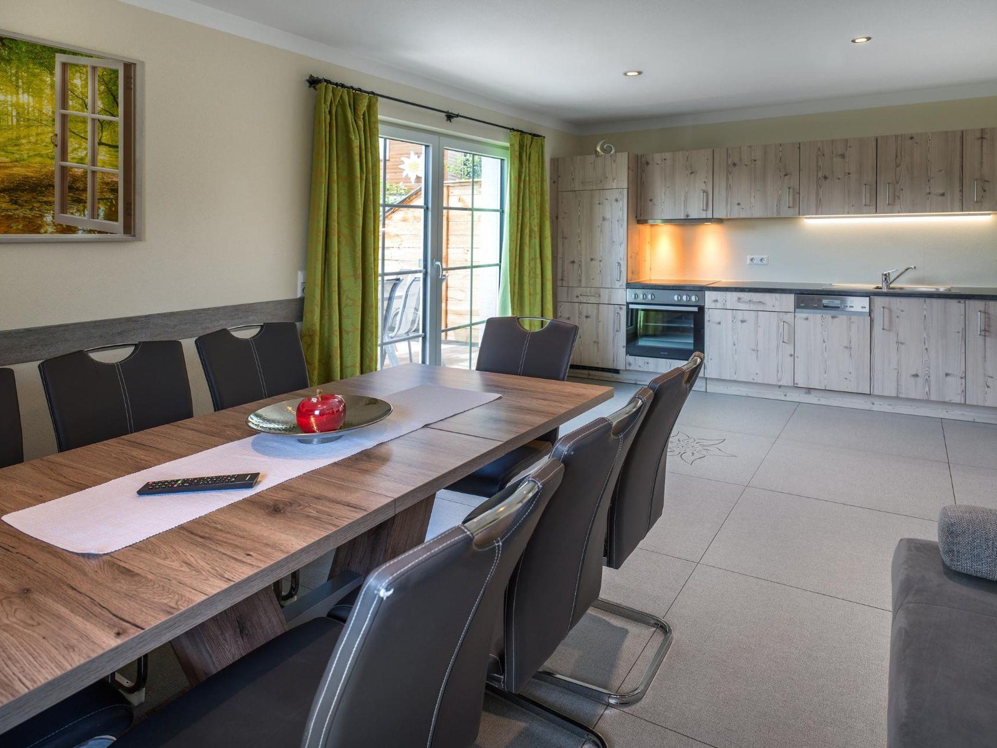eine voll ausgestattete Wohnküche mit Ausziehcouch und eine große Sonnenterrasse mit Gartenabteil.