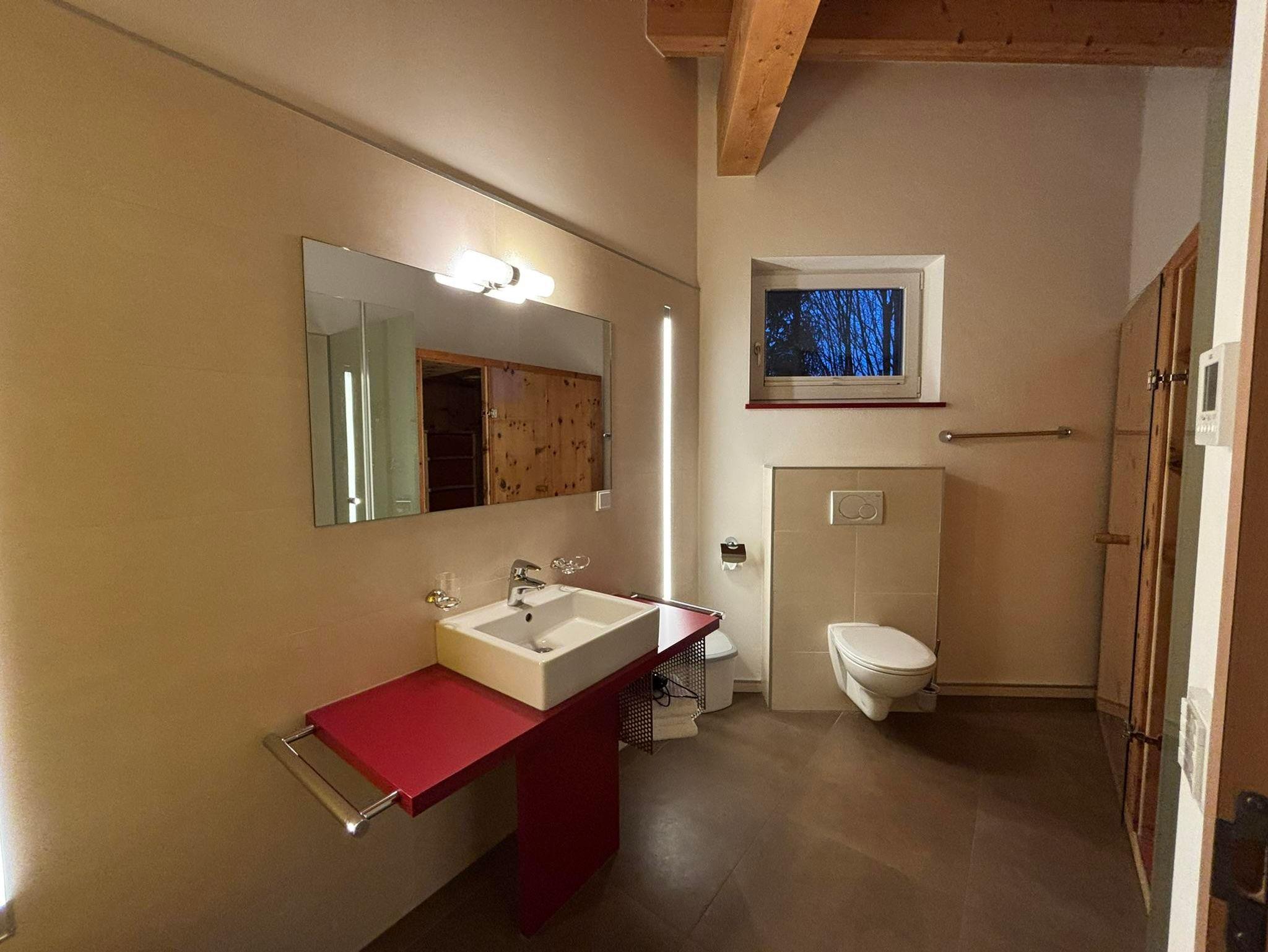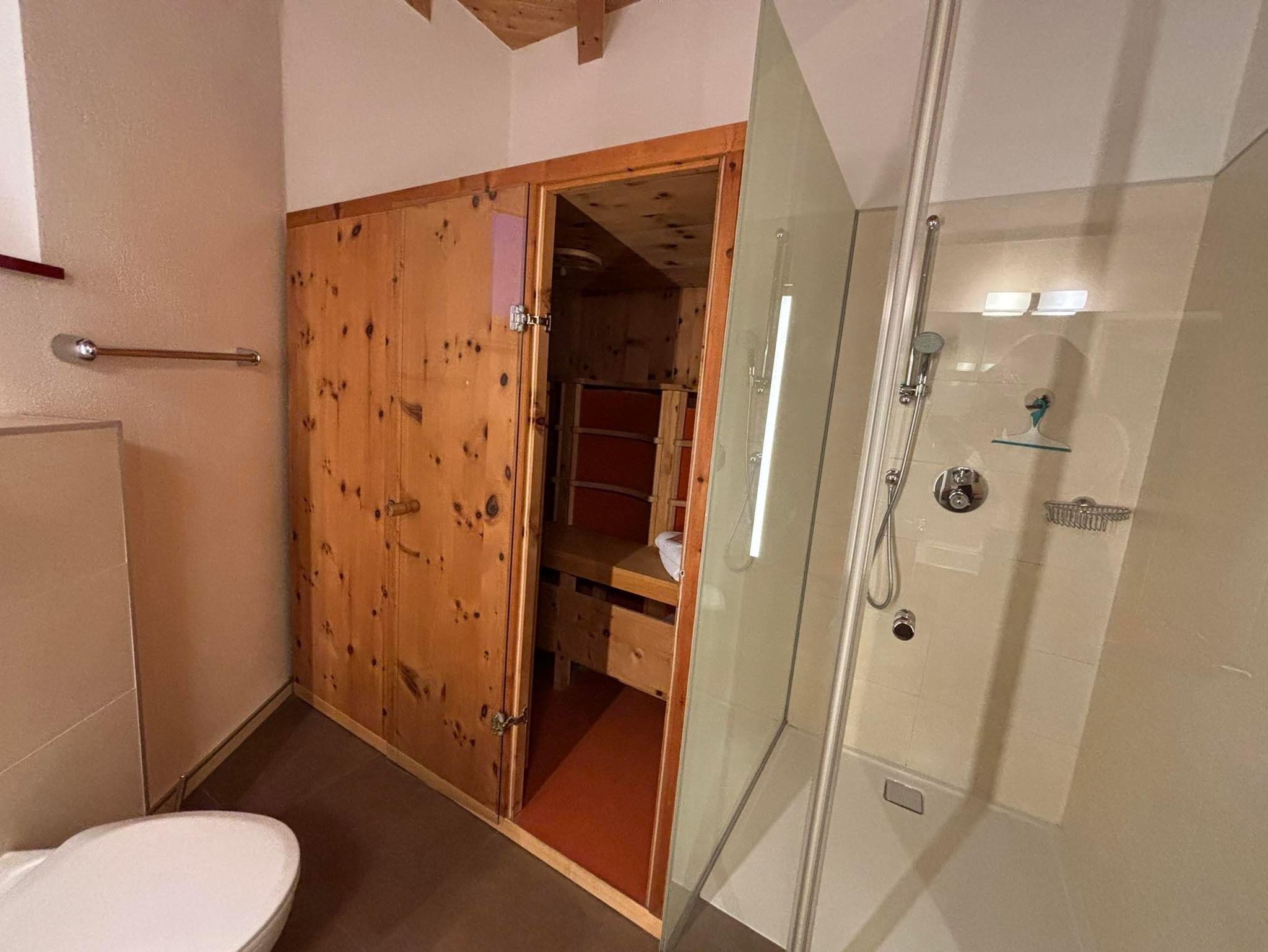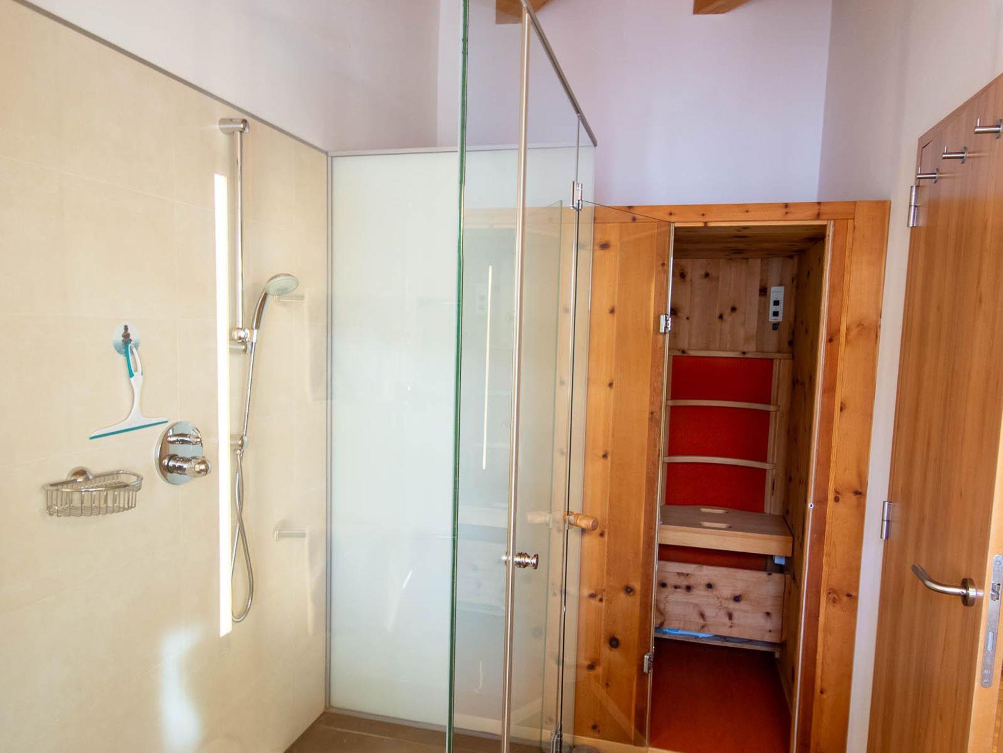 Das großzügige Badezimmer ist mit einer privaten Wellnesskabine ausgestattet und lädt zum Entspannen ein. Ideal geeignet für Paare, Ruhesuchende und Naturliebhaber.