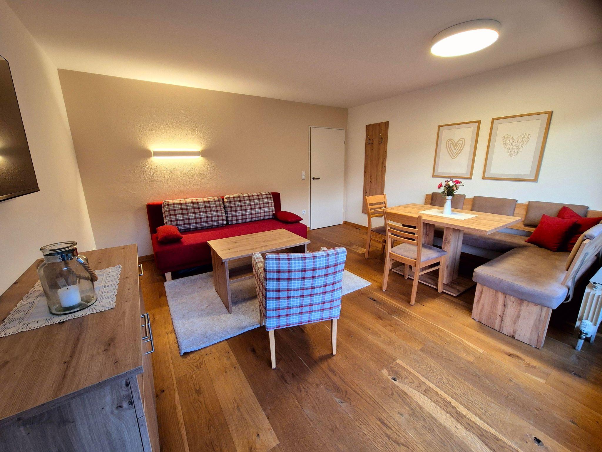 Wohnschlafzimmer mit Doppelcouch, gepolsterter Eßecke und Bauernkomode. Zweibettzimmer mit 2 Fauteuils und Tischchen, Wandvertäfelung. Große Schiebetüre zum Liegebalkon bzw. zur Gartenterasse. Vorraum mit Schrank. Frisch renoviertes Badezimmer mit Dusche, Waschbecken, WC und Heizstrahler. Seperate Küche mit 3-Platten-Herd, Dunstabzug, kompl. Geschirr, Kühlschrank, Geschirrspülmaschine, Mikrowellenherd, Kaffeemaschine. Farb-TV, Safe, Internetanschluss.
