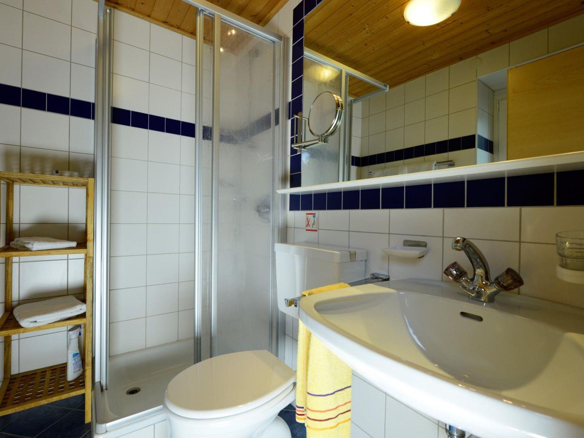 Schlafzimmer mit Doppelbetten, Vorraum, Badezimmer mit Dusche und WC.