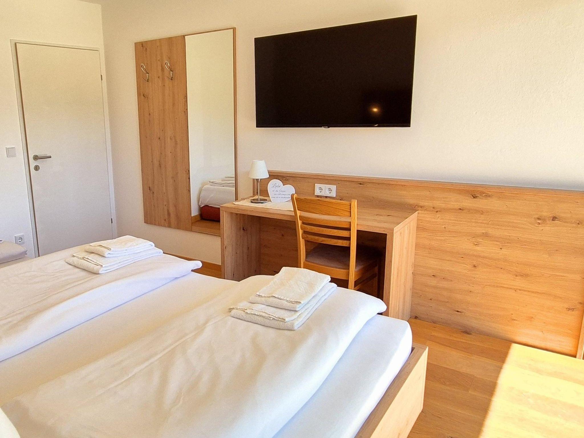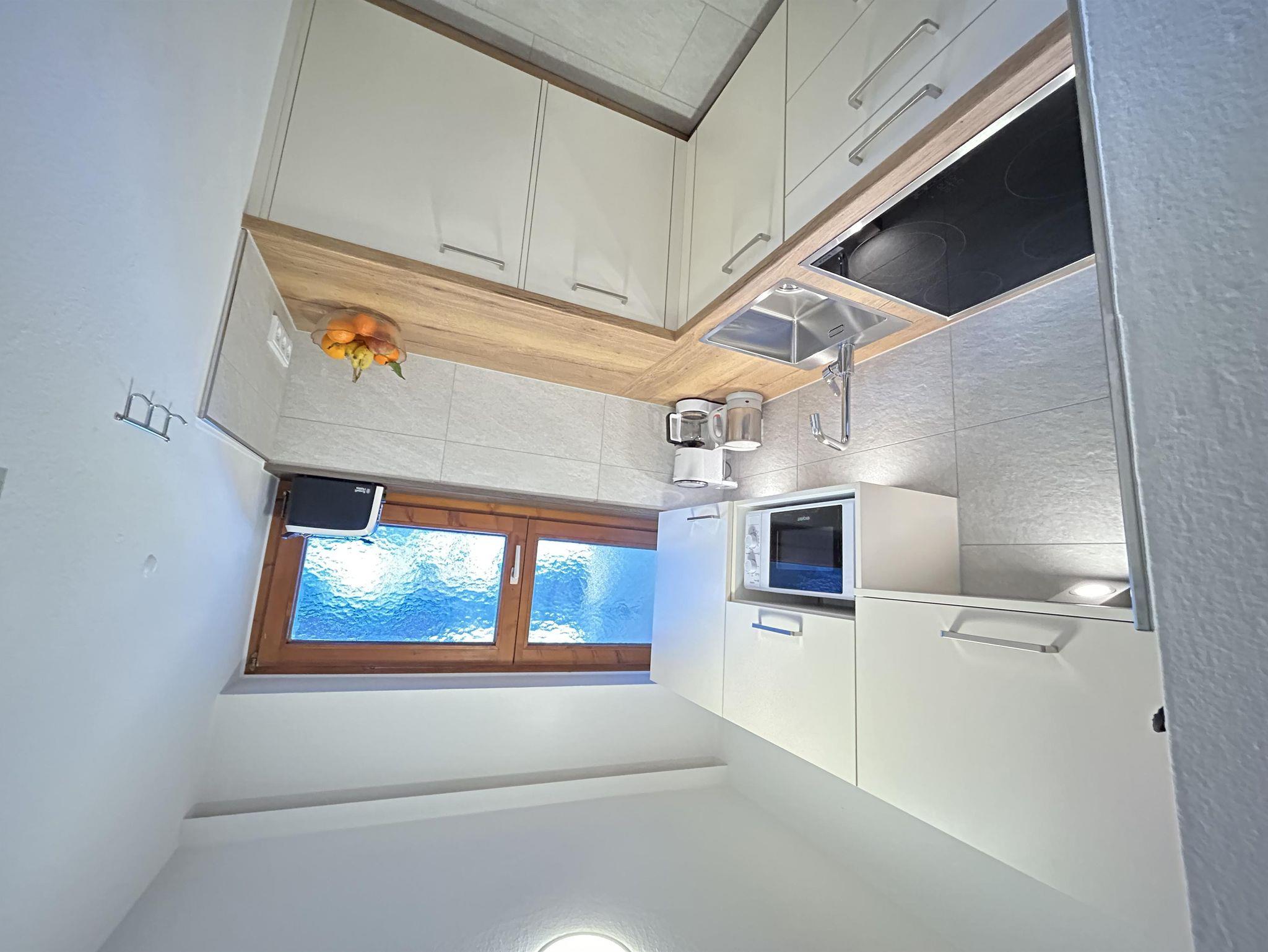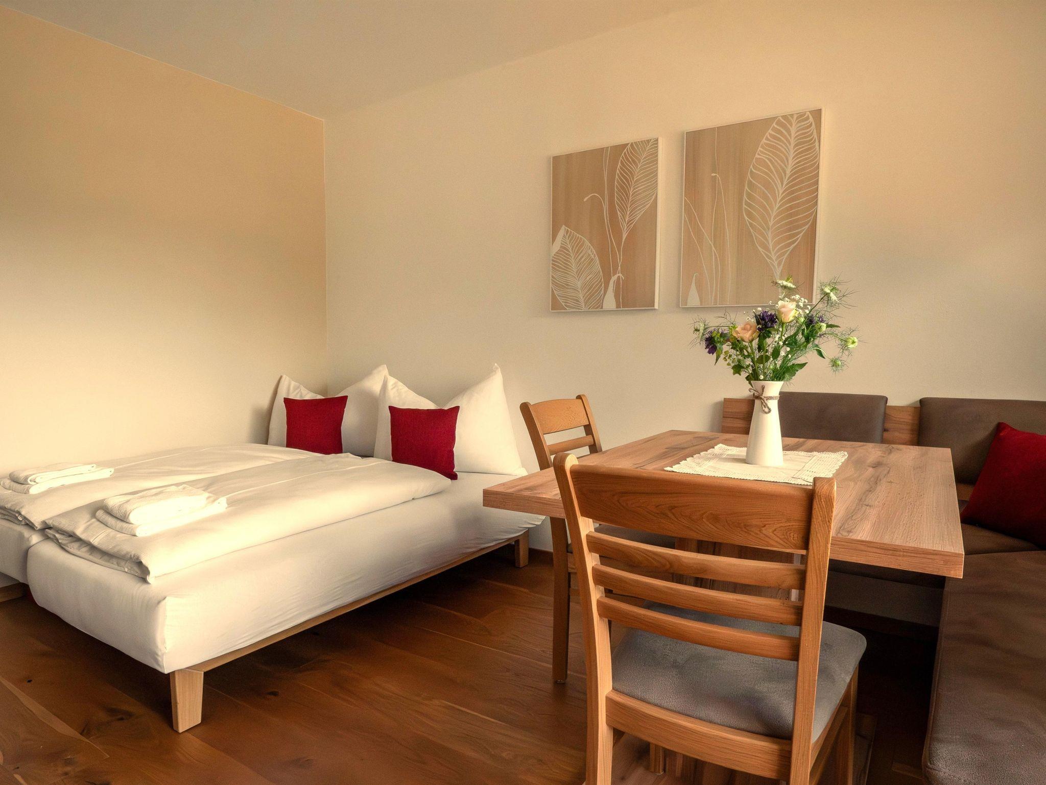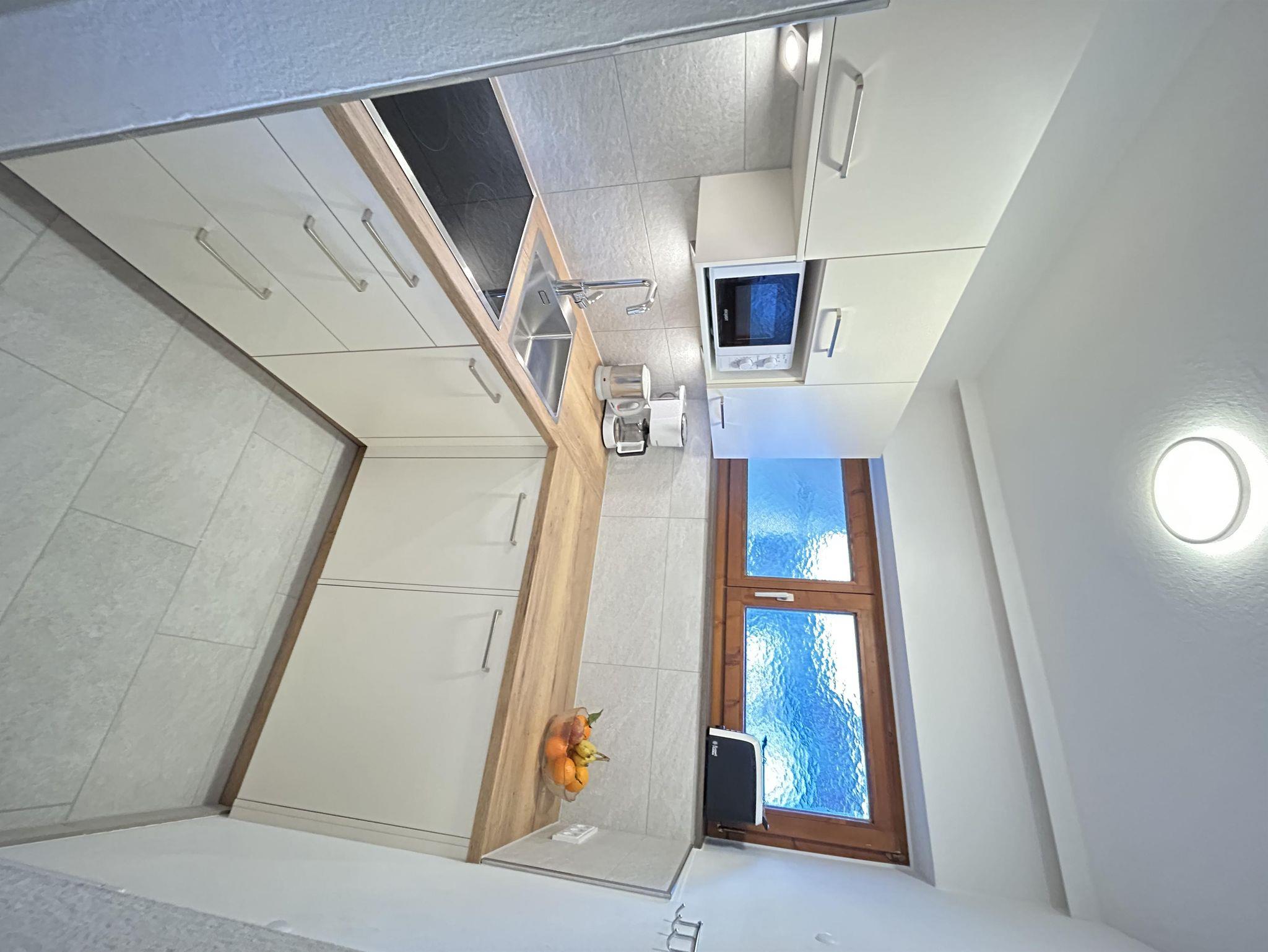 Raumhohe Panoramafenster schaffen eine helle und einladende Wohnatmosphäre. Das Wohnzimmer ist mit einem Doppelschlafsofa und einem gemütlichen Essbereich ausgestattet.Das Schlafzimmer bietet ein komfortables Doppelbett sowie ein Einzelschlafsofa. Zusätzlich stehen ein Sessel und ein Schreibtisch zur Verfügung – ideal zum Entspannen oder Arbeiten. Ein großer Flachbild-TV und High-Speed-WLAN sorgen für zeitgemäßen Komfort. Die raumhohen Fenster sowie die Terrasse erweitern den Wohnraum nach außen und laden zum Verweilen ein. Im Vorzimmer befindet sich eine praktische Garderobe. Die separate, voll ausgestattete Küche verfügt über vier Cerankochfelder, einen Kühlschrank, eine Geschirrspülmaschine, einen Mikrowellenherd, eine Kaffeemaschine, einen Wasserkocher und einen Toaster – perfekt für eine komfortable Selbstversorgung. Das separate Badezimmer ist mit einer modernen Regendusche ausgestattet. Im Keller steht allen Gästen eine gemeinschaftlich nutzbare Waschmaschine mit Münzeinwurf sowie ein Trockner zur Verfügung.