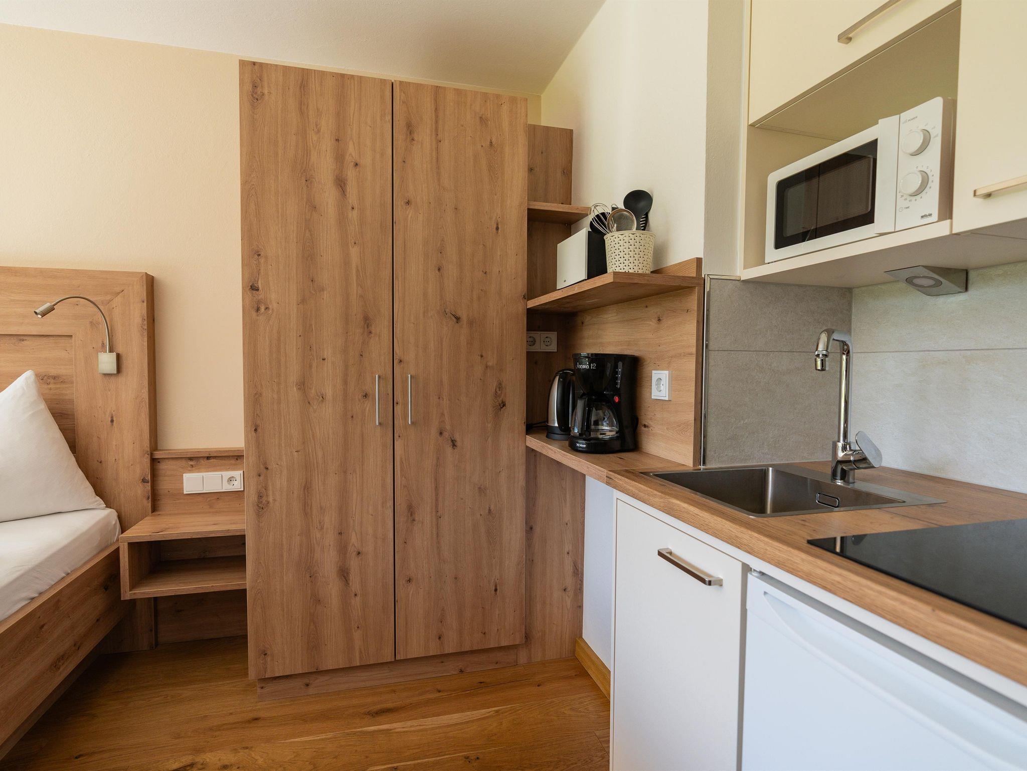 Raumhohe Panoramafenster sorgen für eine helle und freundliche Atmosphäre im kombinierten Schlaf- und Wohnraum. Dieser ist mit einem komfortablen Doppelbett, einem Esstisch mit zwei Stühlen sowie einem großen Flachbild-TV ausgestattet. High-Speed-WLAN steht selbstverständlich kostenfrei zur Verfügung. Die integrierte Küchenzeile bietet alles für eine angenehme Selbstversorgung: zwei Cerankochfelder, Kühlschrank, Mikrowellenherd, Kaffeemaschine, Wasserkocher und Toaster. Das separate Badezimmer verfügt über einen Föhn sowie einen Handtuchtrockner. Abgerundet wird das Angebot durch eine Südostterrasse mit schönem Gartenblick – ideal zum Entspannen und Genießen.