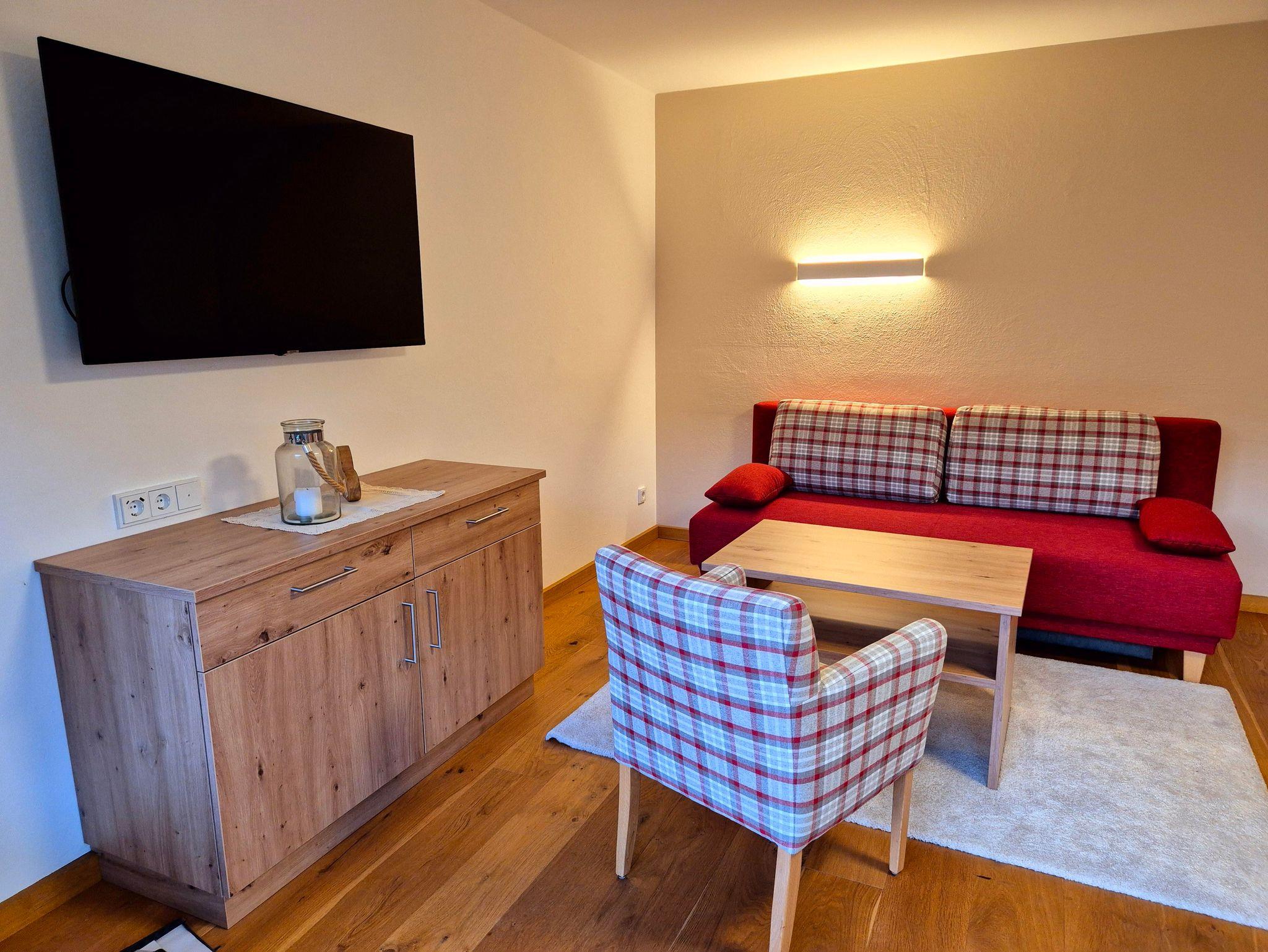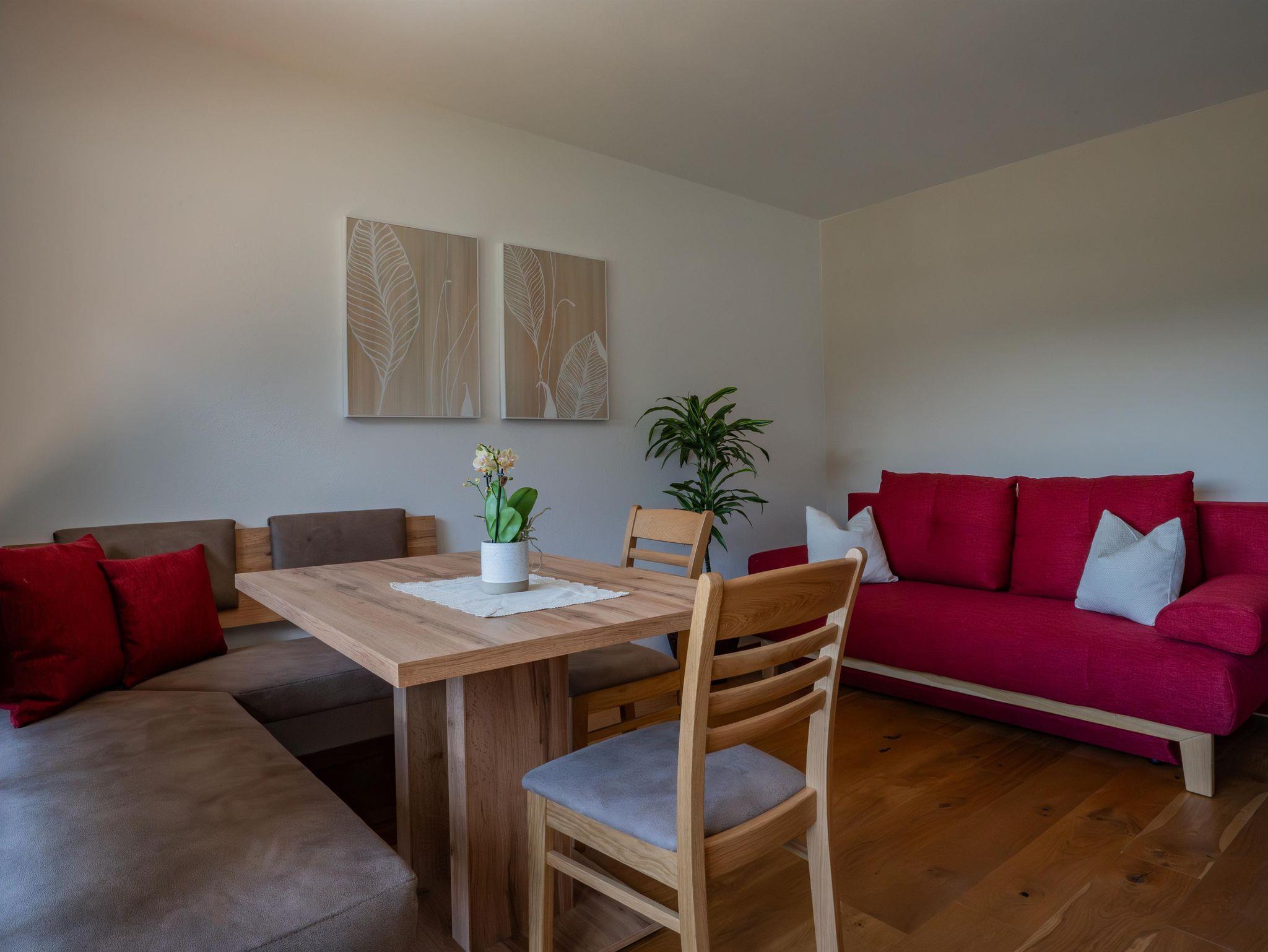 Wohnschlafzimmer mit zwei Couches und Tischchen, gepolsterter Eßecke und Bauernkomode. Dreibettzimmer mit 2 Fauteuils und Tischchen, Wandvertäfelung. Große Schiebetüre zum Liegebalkon bzw. zur Gartenterasse. Vorraum mit Schrank. Frisch renoviertes Badezimmer mit Dusche, Waschbecken, WC und Heizstrahler. Separate Küche mit 3-Platten-Herd, Kühlschrank, Geschirrspülmaschine, Mikrowellenherd, Dunstabzug, kompl. Geschirr, Kaffeemaschine. Farb-TV, Safe, Internetanschluss. Haustiere sind nicht erlaubt!
