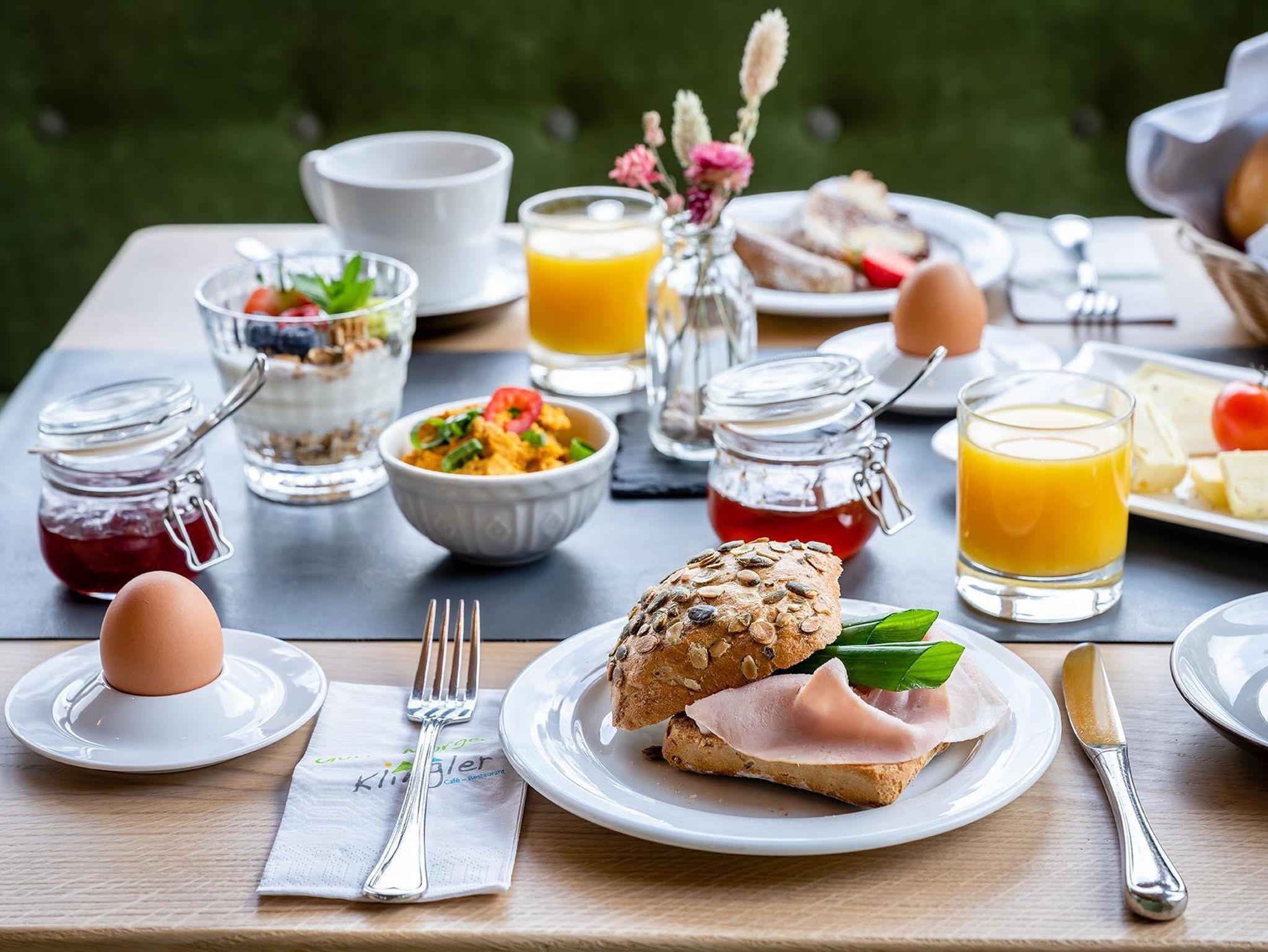 • Frühstücksbuffet mit Seeblick in unserem unterirdisch verbundenen Haupthaus, Hotel Klingler