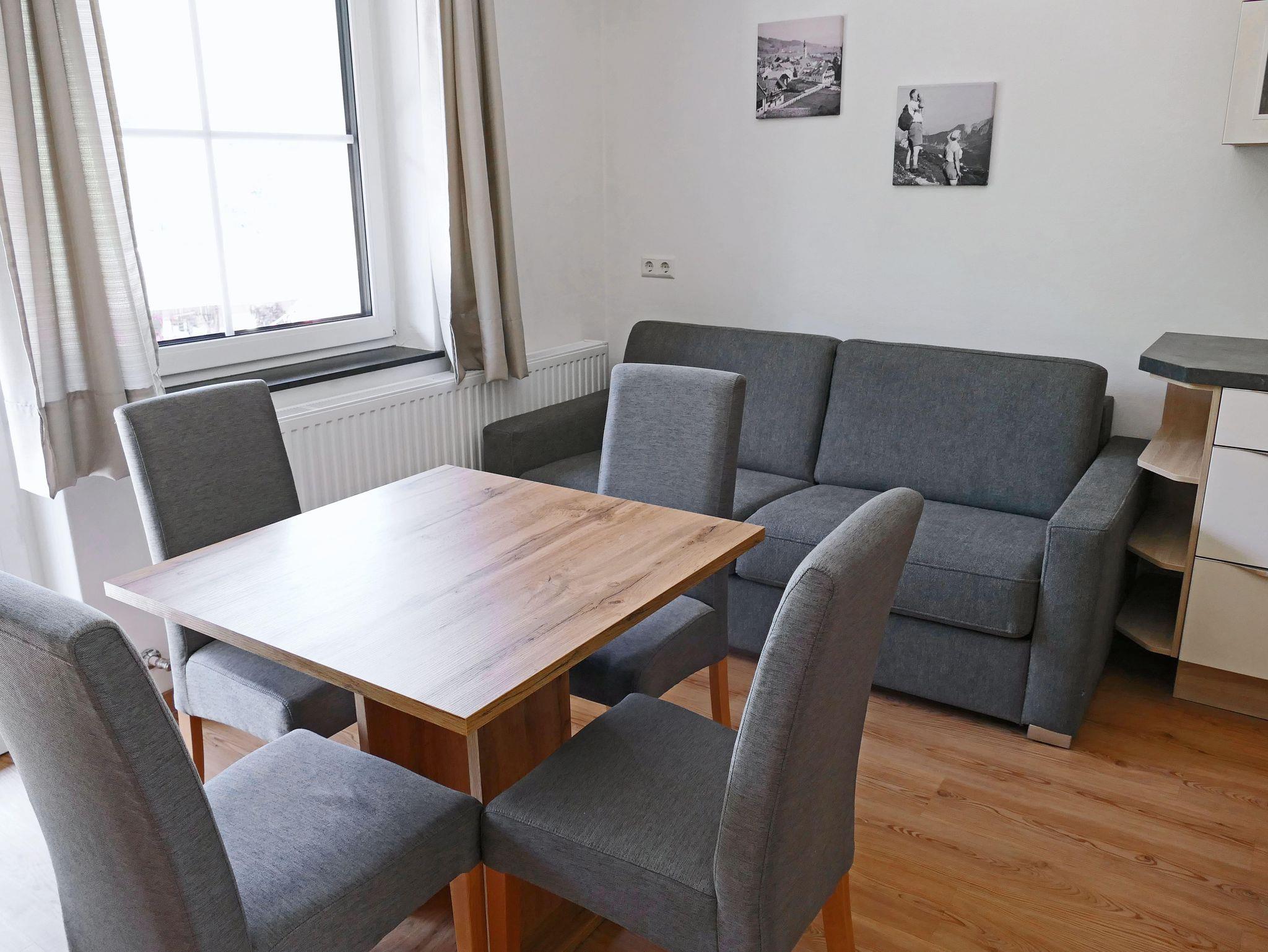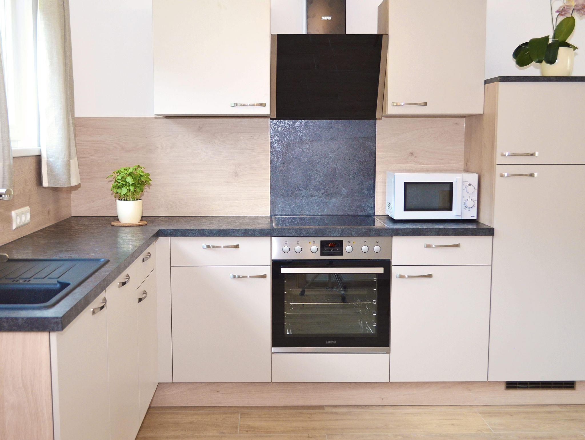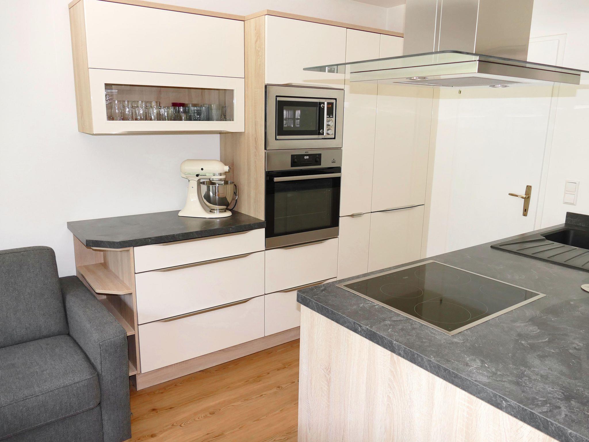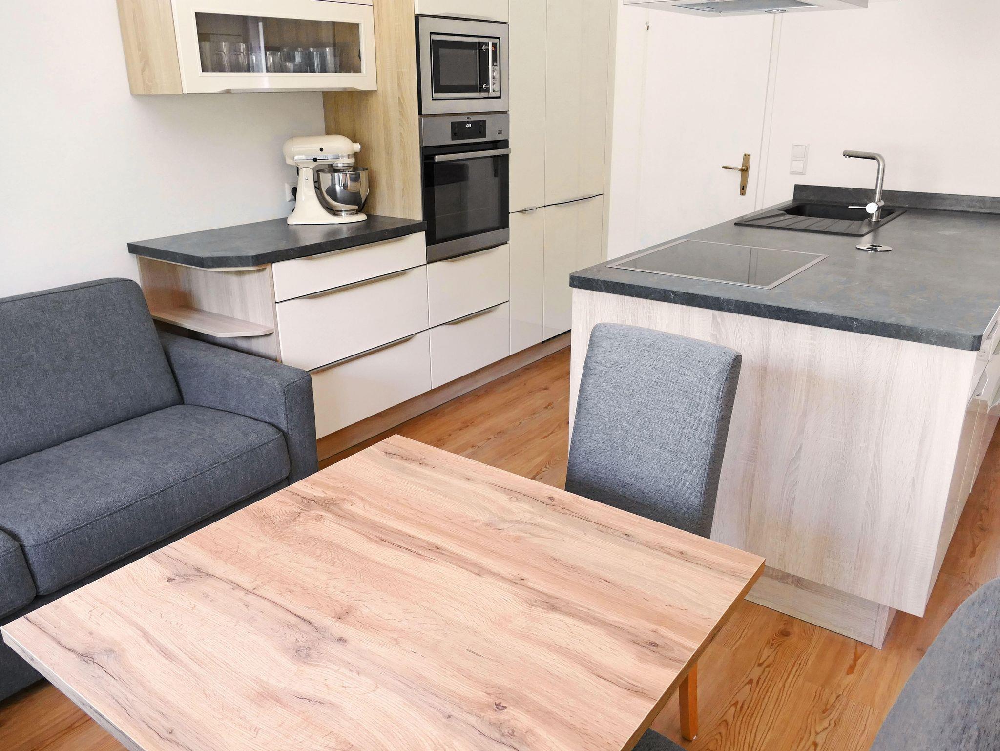 • 1 Wohnküche mit hochwertiger Küche, großem Schlafsofa & Essbereich