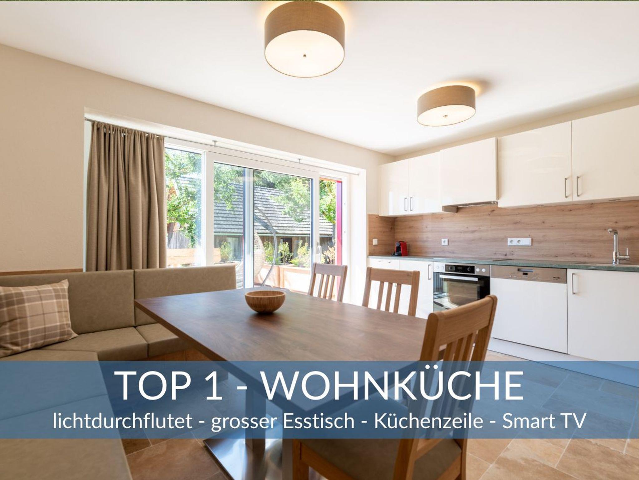 Top 1 Wohnung mit Terrasse und Garten Zaunkönig (EG) Diese Wohnung liegt im Erdgeschoß und besticht durch eine Terrasse in unserem großzügigen Garten. Insgesamt umfasst die Wohnung 65 m2 geteilt in eine hochwertig ausgestattete Wohnküche, 2 Schlafzimmer und ein wunderschönes Badezimmer mit komfort Dusche sowie einem separaten WC. Die Wohnung bietet Platz für bis zu 5 Personen.