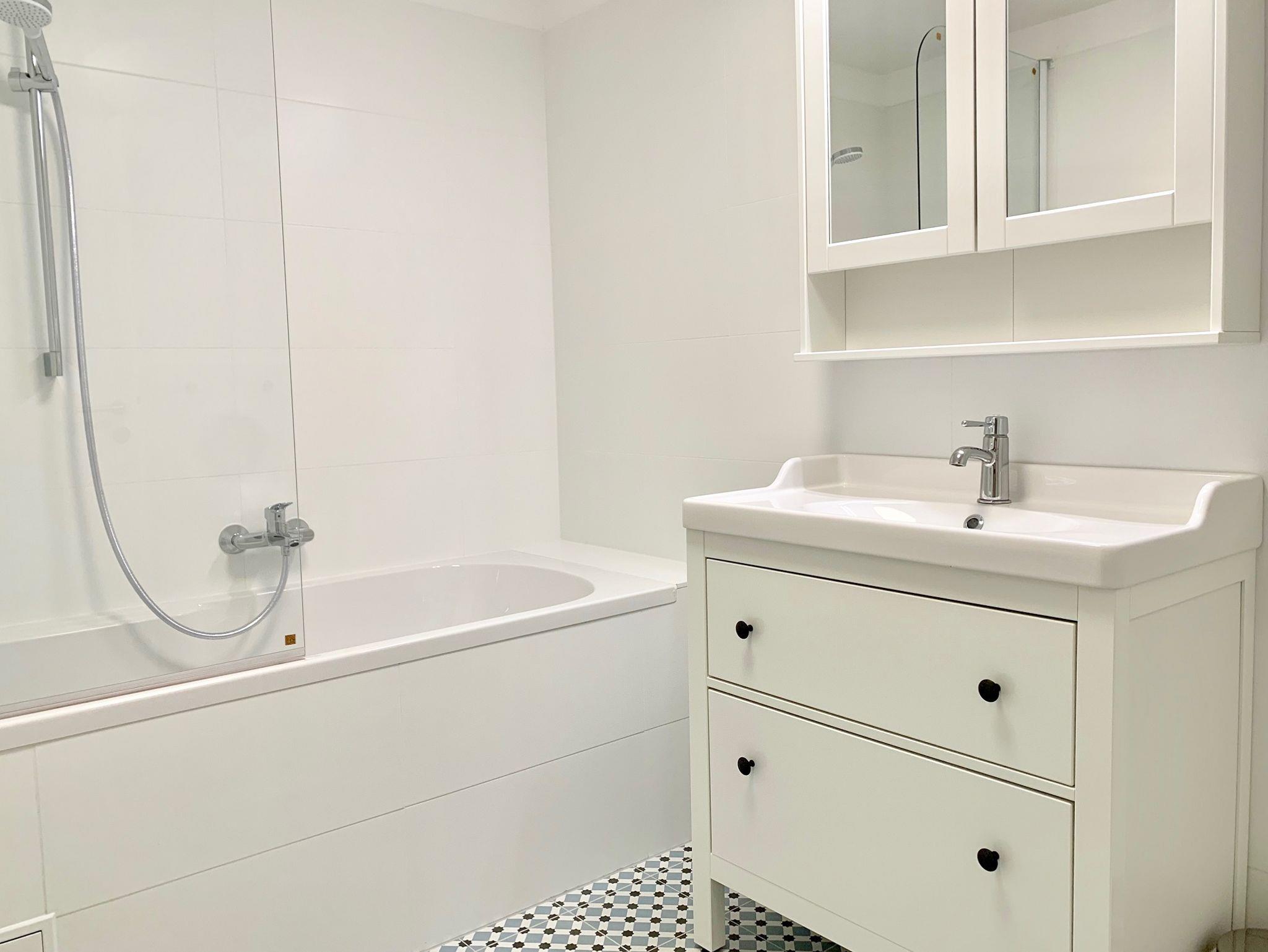 • Badezimmer mit Badewanne, Handtuchtrockner & Fußbodenheizung, separates WC, Waschmaschine, Duschgel & Shampoo