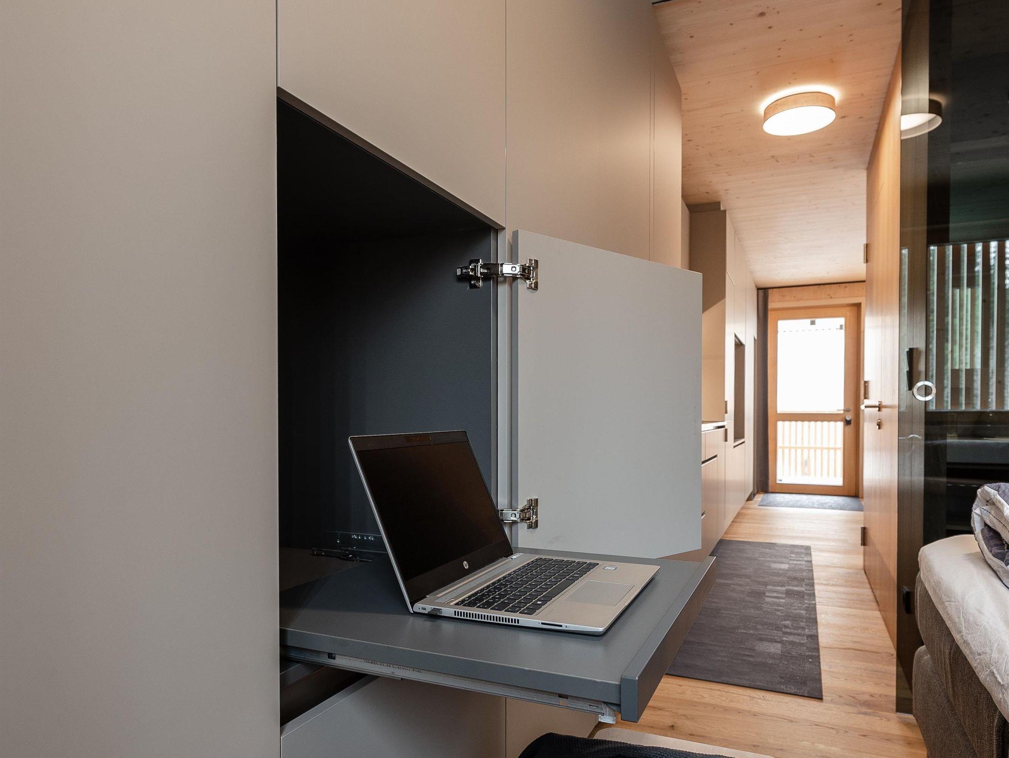 Ein kleiner Arbeitsplatz mit Steckdosen ist ebenfalls vorhanden – ideal für alle, die zwischendurch am Laptop arbeiten möchten.