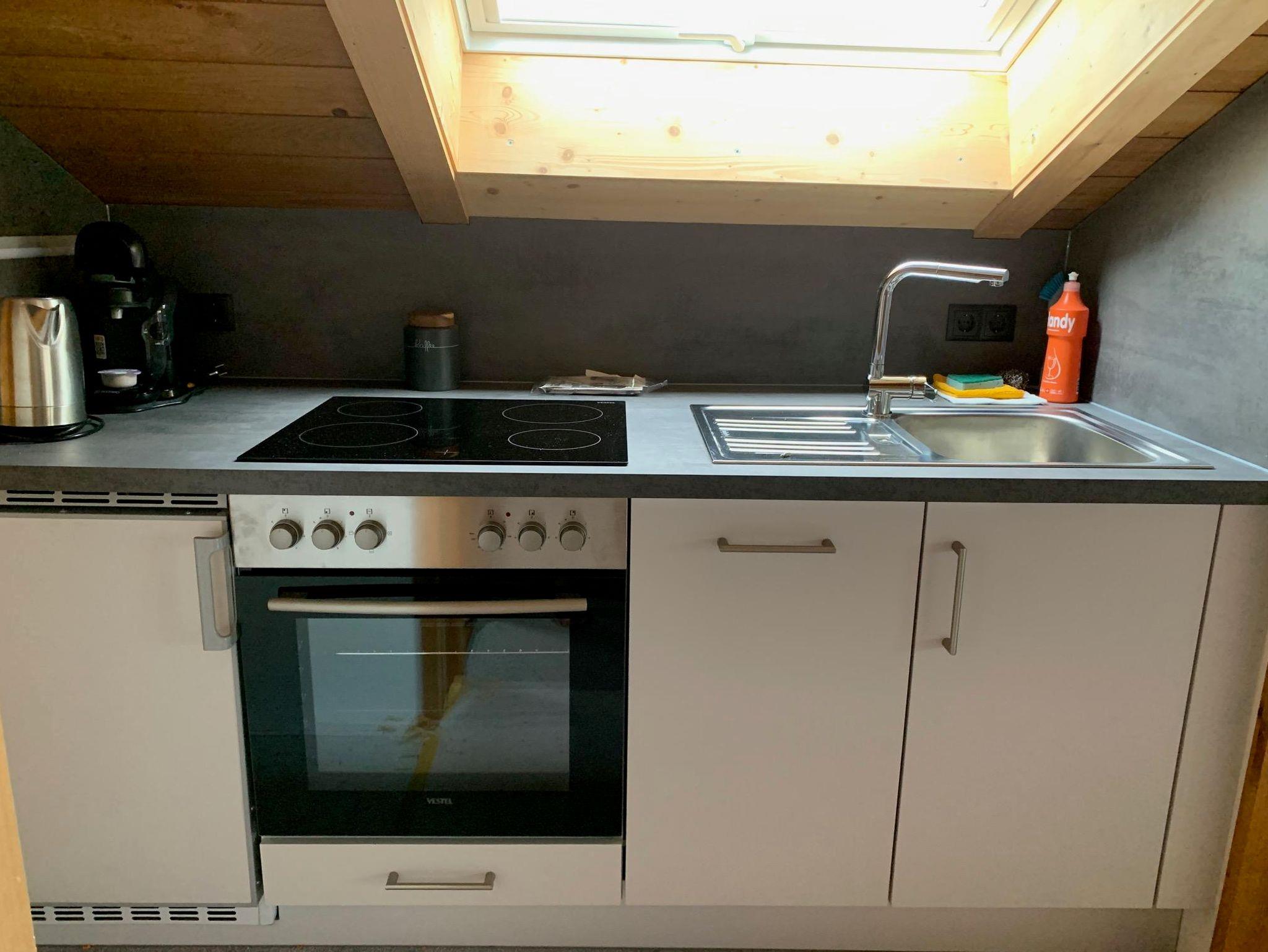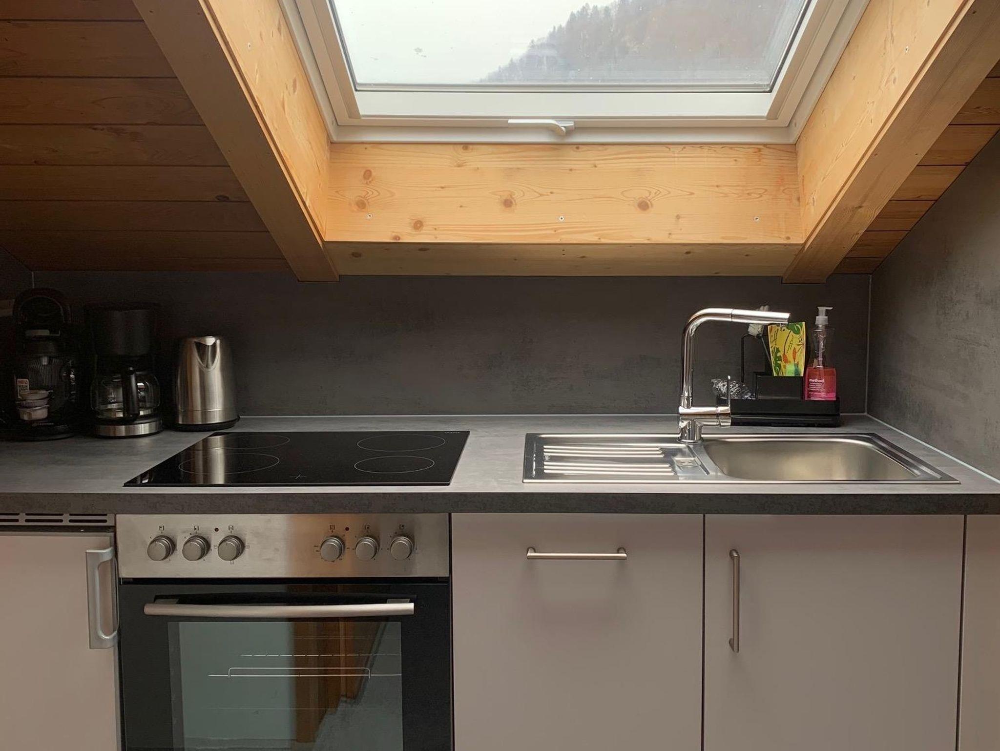 Die voll ausgestattete Küche mit Geschirrspüler, Backofen, Cerankochfeld, Kaffeemaschine und Wasserkocher lässt keine Wünsche offen. Das Badezimmer mit Dusche und WC liegt unter einer charmanten Dachschräge.