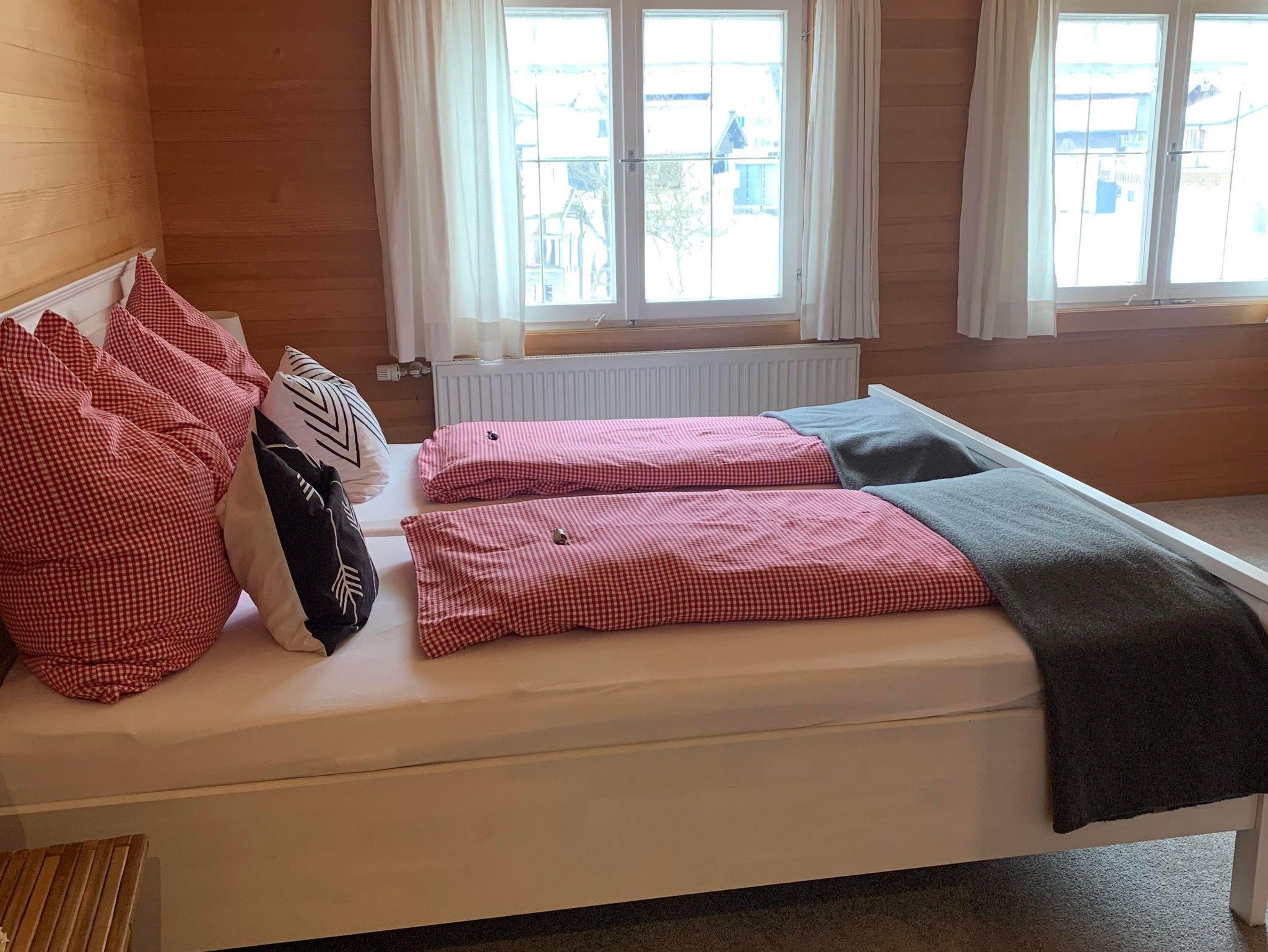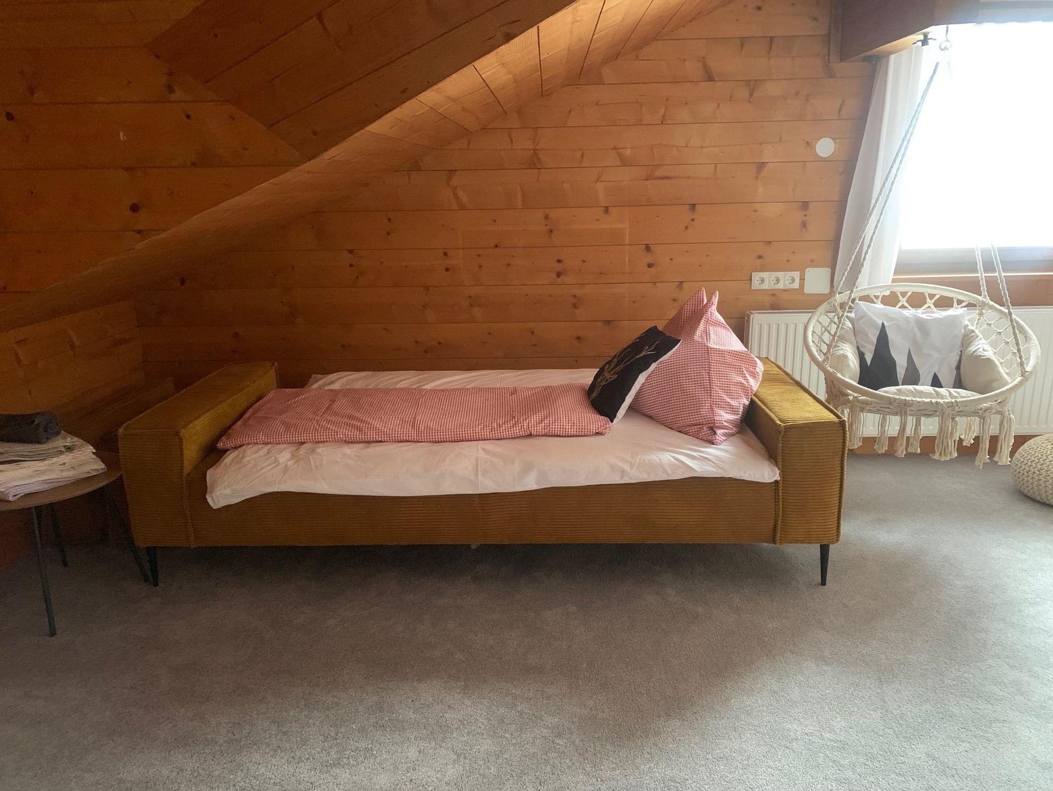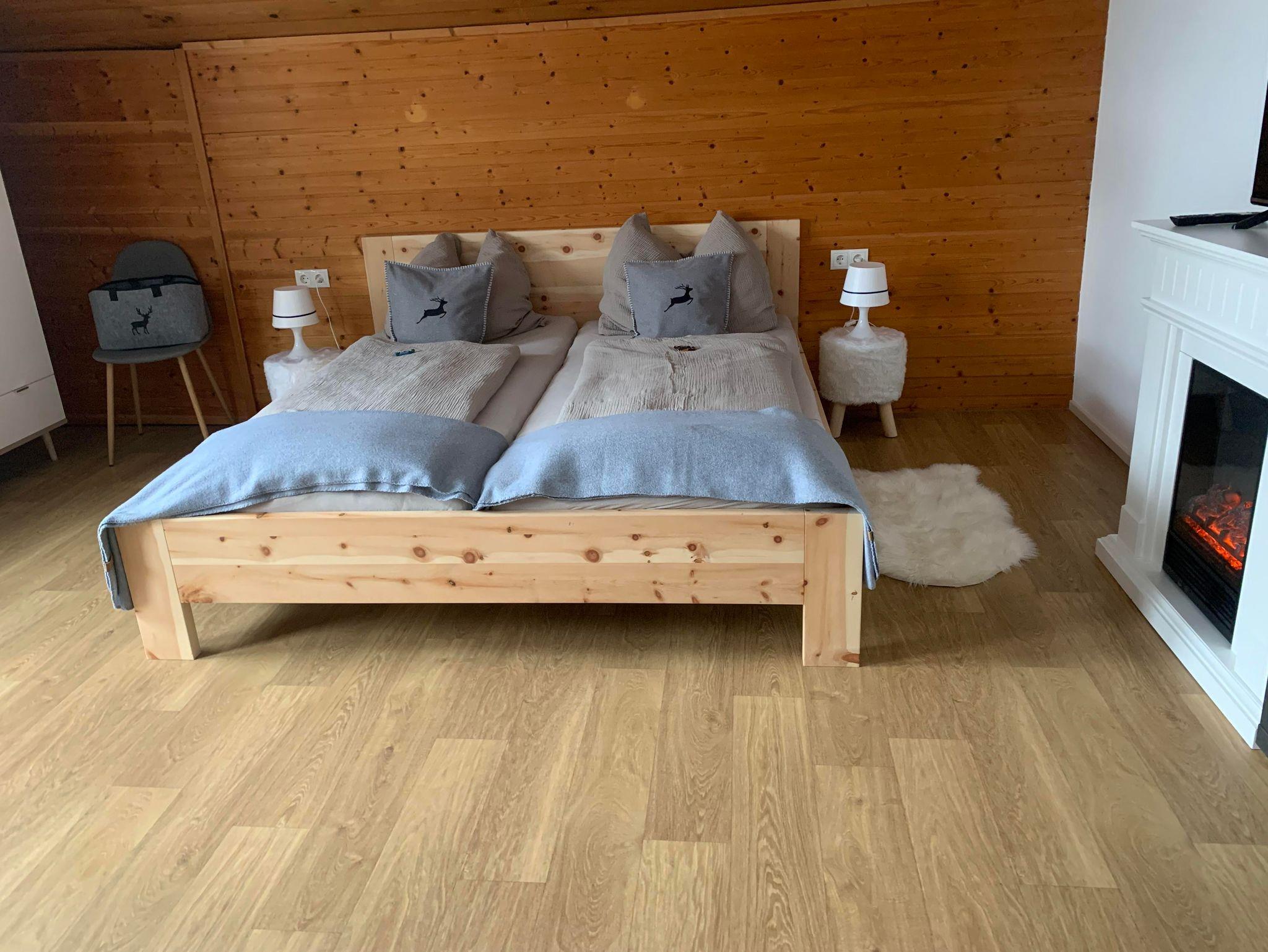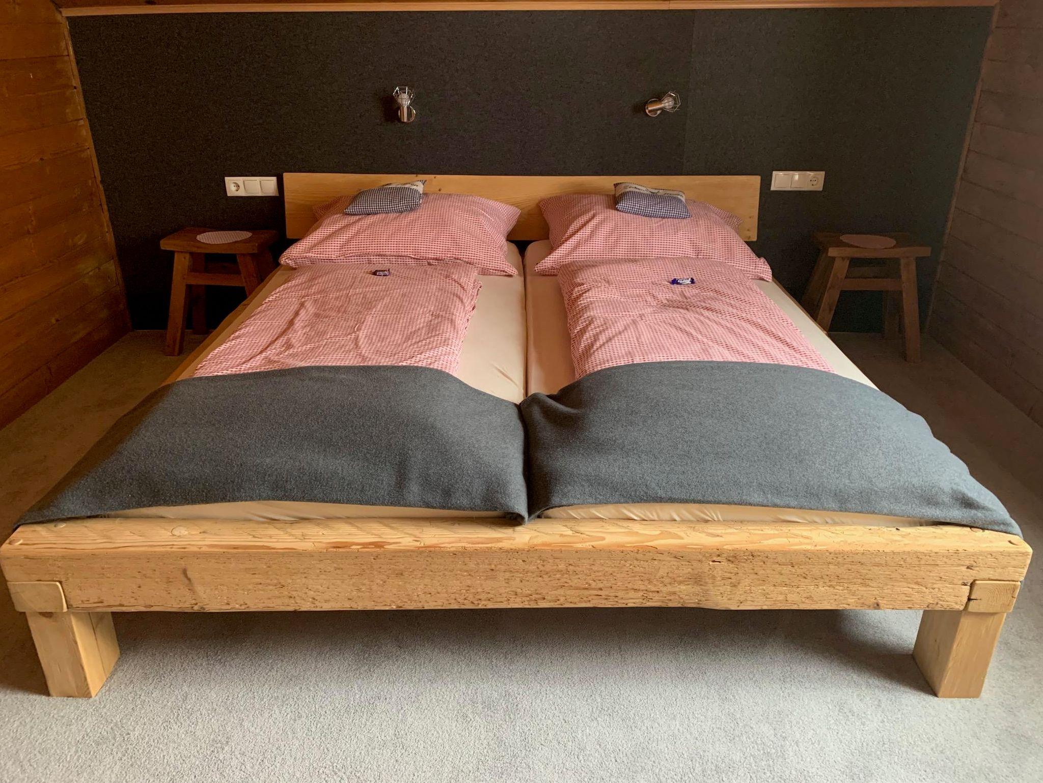 Das 45 m² große, renovierte Apartment im 2. Obergeschoss bietet Platz für 3–4 Personen. Ein Schlafzimmer mit Altholzbett und ein ausziehbares Sofa im großzügigen Wohnzimmer sorgen für Komfort und Flexibilität.