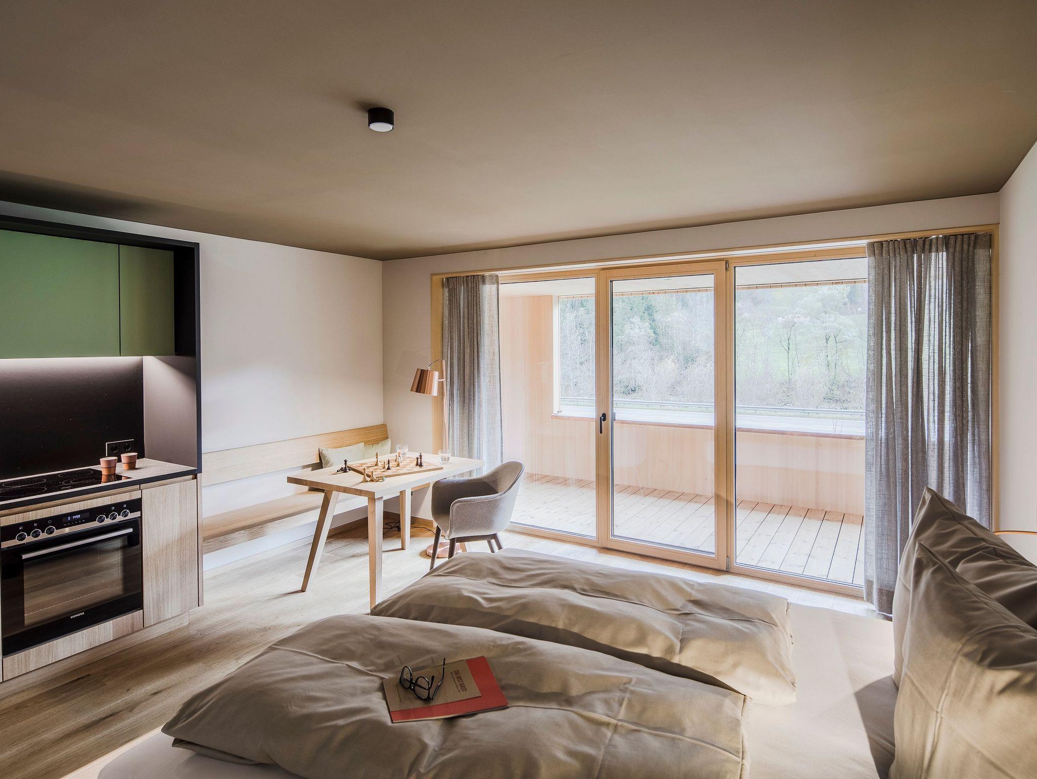 Schlicht, praktisch und hochwertig schön. Diese Vision haben wir mit ausgewählten Naturmaterialien mit den Handwerksbetrieben der Region realisiert. 7 Apartments am Fuße des Gopfberges haben ihre Türen geöffnet für Erholung und vielfältigste Sport- und Bewegungsmöglichkeiten. Allein der Blick auf die Ski- und Wandergebiete vor Ihrem Panoramafenster wird gleich neue Energien freisetzen.