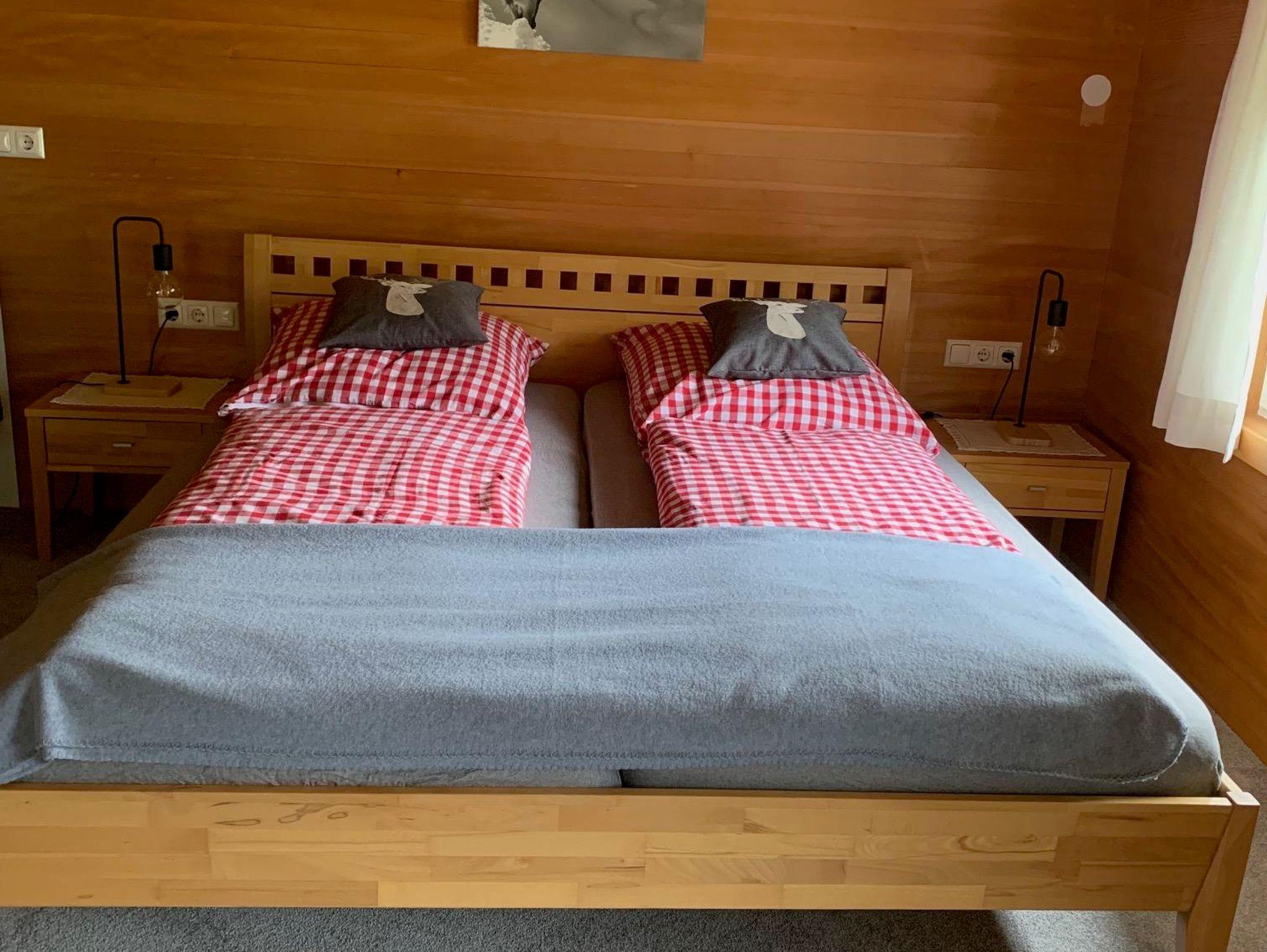 Das renovierte Apartment im 1. Obergeschoss bietet auf 74 m² viel Platz für Familien oder kleinere Gruppen. Es verfügt über ein Doppelzimmer und ein Dreibettzimmer aus Zirbenholz – ideal für 5 Personen. Bei Bedarf bietet das ausziehbare Sofa im Essraum Schlafmöglichkeit für 2 weitere Gäste.