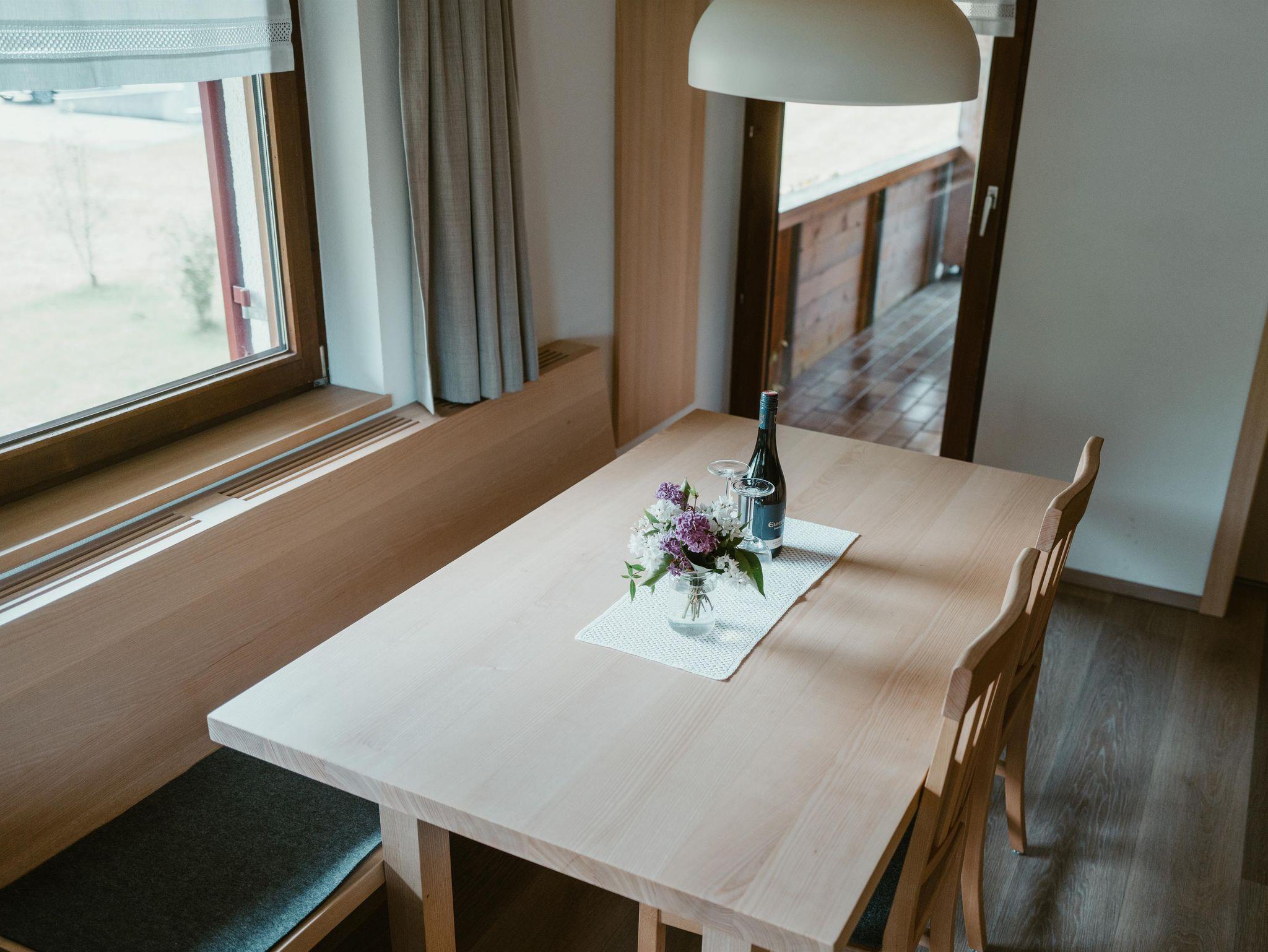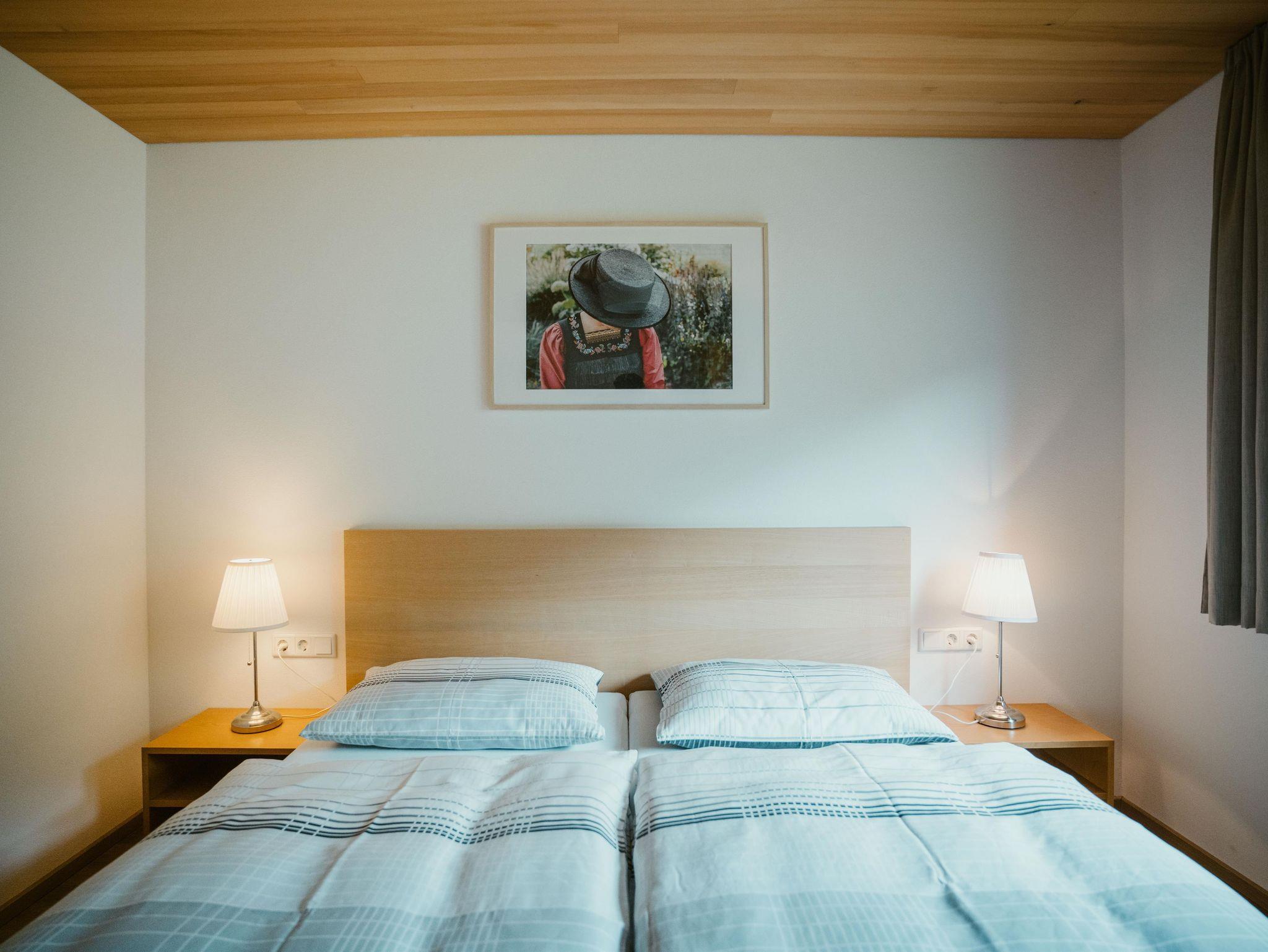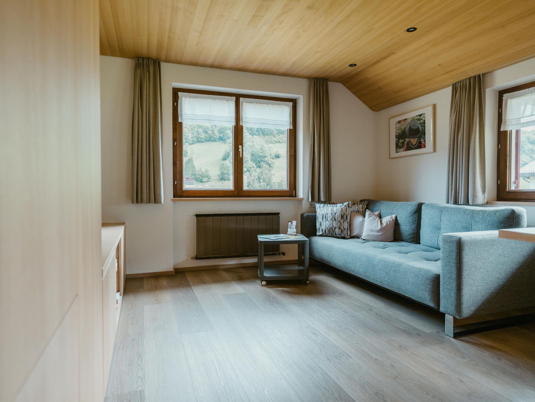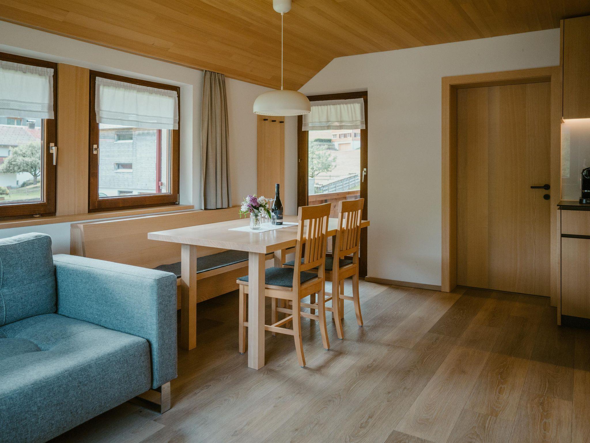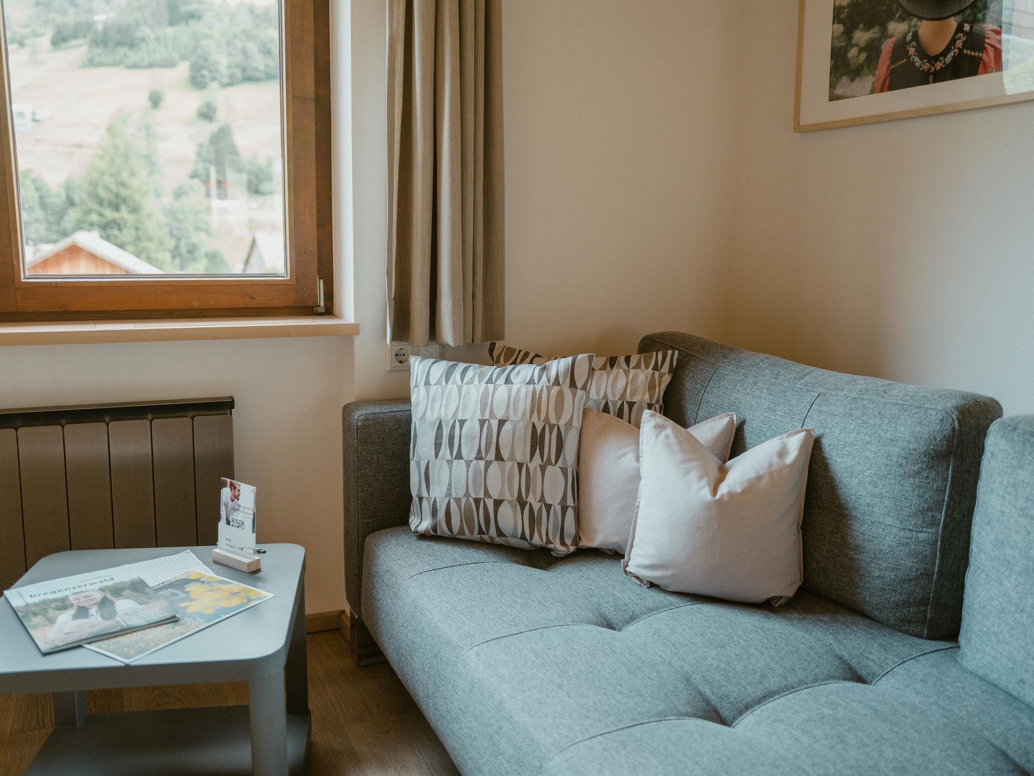 Appartement „Kanisfluh“ für 4 Personen Von unserem Appartement „Kanisfluh“ können Sie den Blick auf die imposante Kanisfluh genießen. Das Appartement verfügt über einen großzügigen Aufenthaltsraum, mit topmoderner Küche, einem gemütlichen Essbereich und einer bequemen Couch. Diese können Sie für entspannte TV-Abende oder als zusätzlichen Schlafbereich nützen (das Sofa ist ausziehbar und bietet eine bequeme Schlafmöglichkeit für zwei Personen).Vom großzügigen Wohnraum gelangt man auch auf einen ostseitig ausgerichteten Balkon mit entsprechenden Sitzmöglichkeiten.Daneben verfügt dieses Appartement natürlich auch über ein helles Schlafzimmer für zwei Personen. Komplementiert wird diese authentische Wohnung durch ein freundliches Badezimmer mit Toilette und beheizten Handtuchhaltern. Die geschmackvolle Ausstattung macht es noch einfacher in der Bregenzerwälder Bergwelt abzuschalten. Das Tür an Tür liegende Doppelzimmer Rossstelle kann gerne dazugebucht werden.