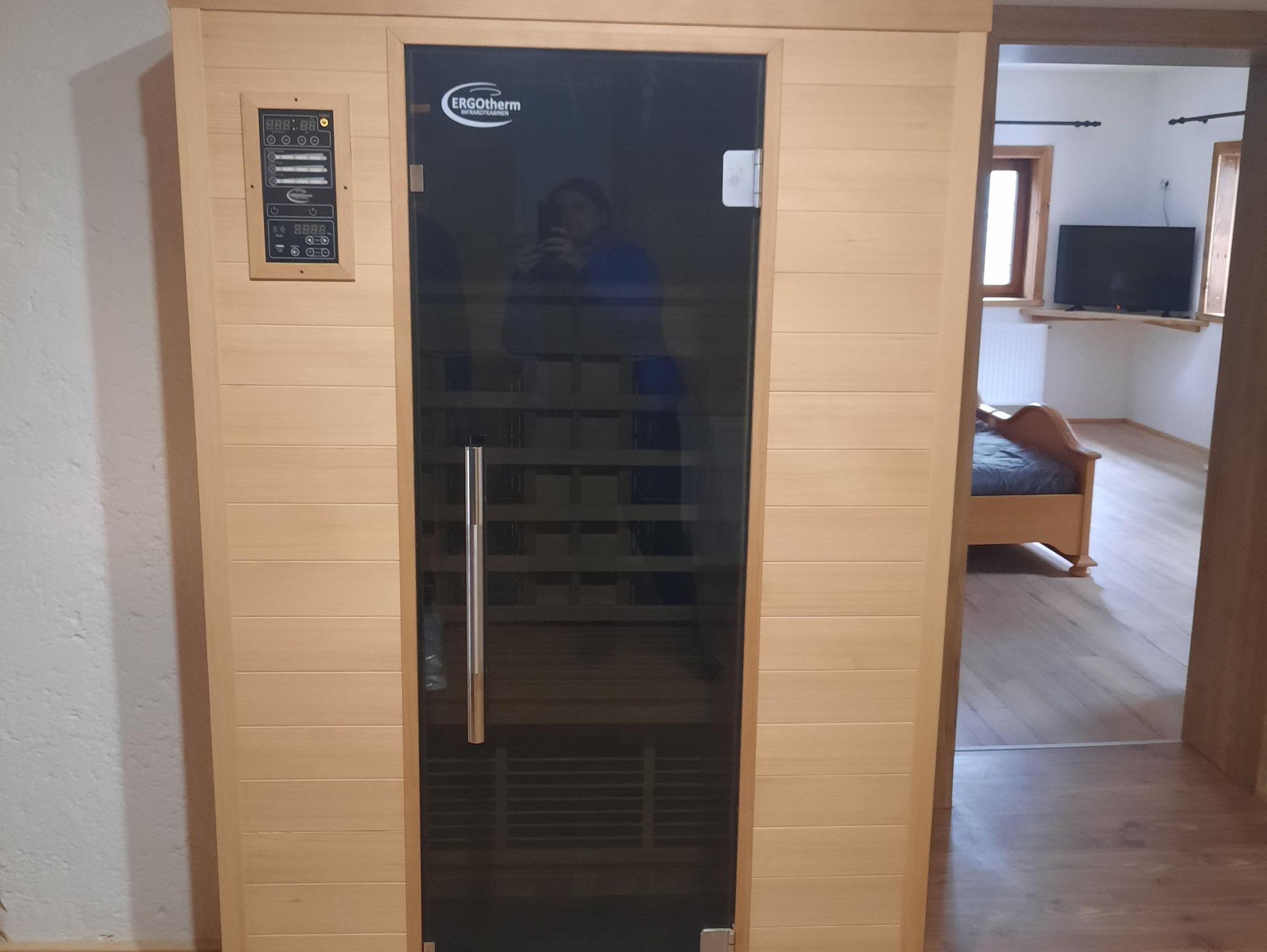 Eine Infrarotkabine, die Platz für zwei Personen bietet und eine entspannte Atmosphäre für Ruhe und Regeneration schafft.
