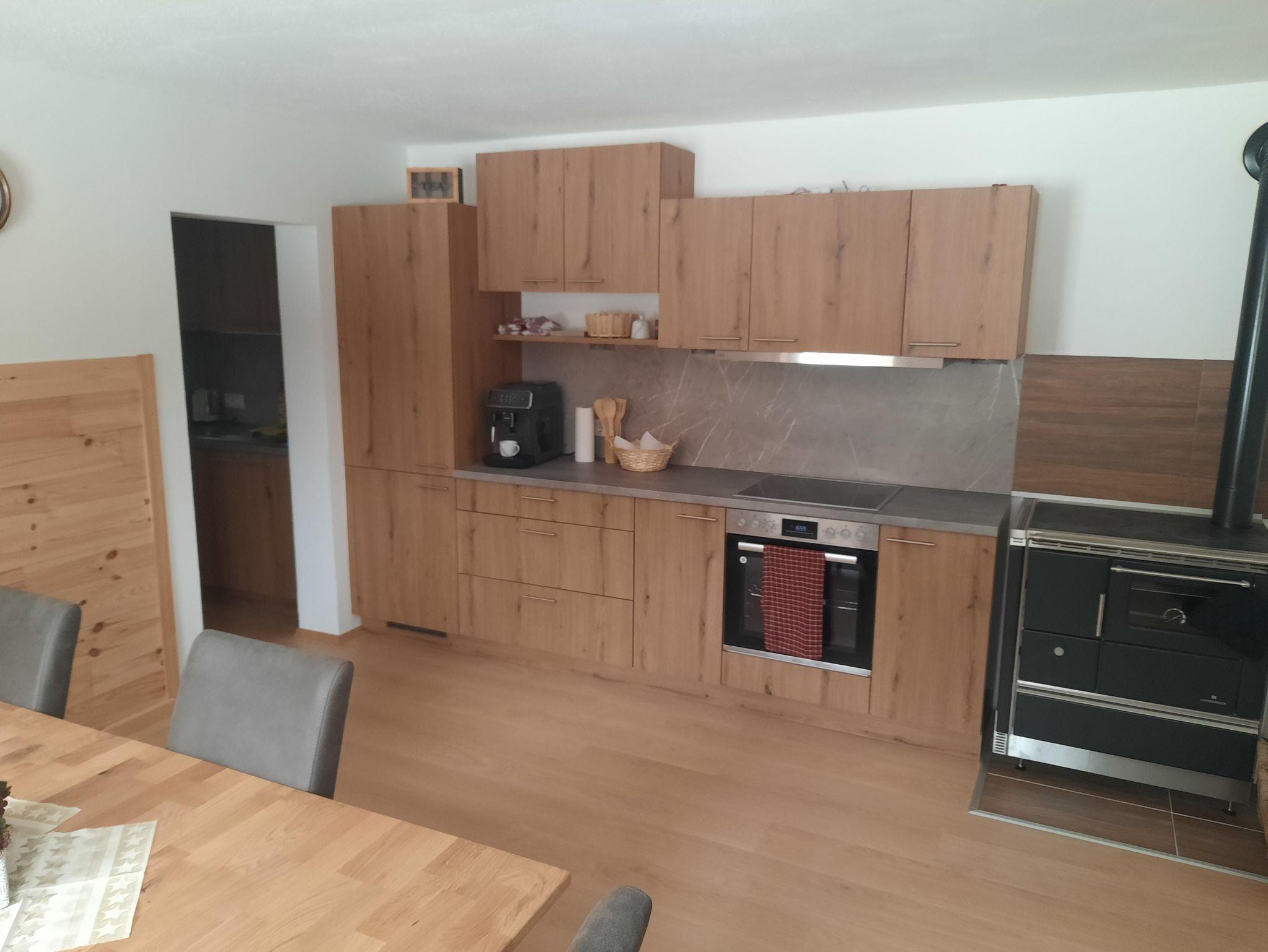 Eine voll ausgestattete Küche mit Elektroherd inklusive Backofen, traditionellem Holzherd, Kühl- und Gefrierschrank, Geschirrspüler und allem notwendigen Geschirr.