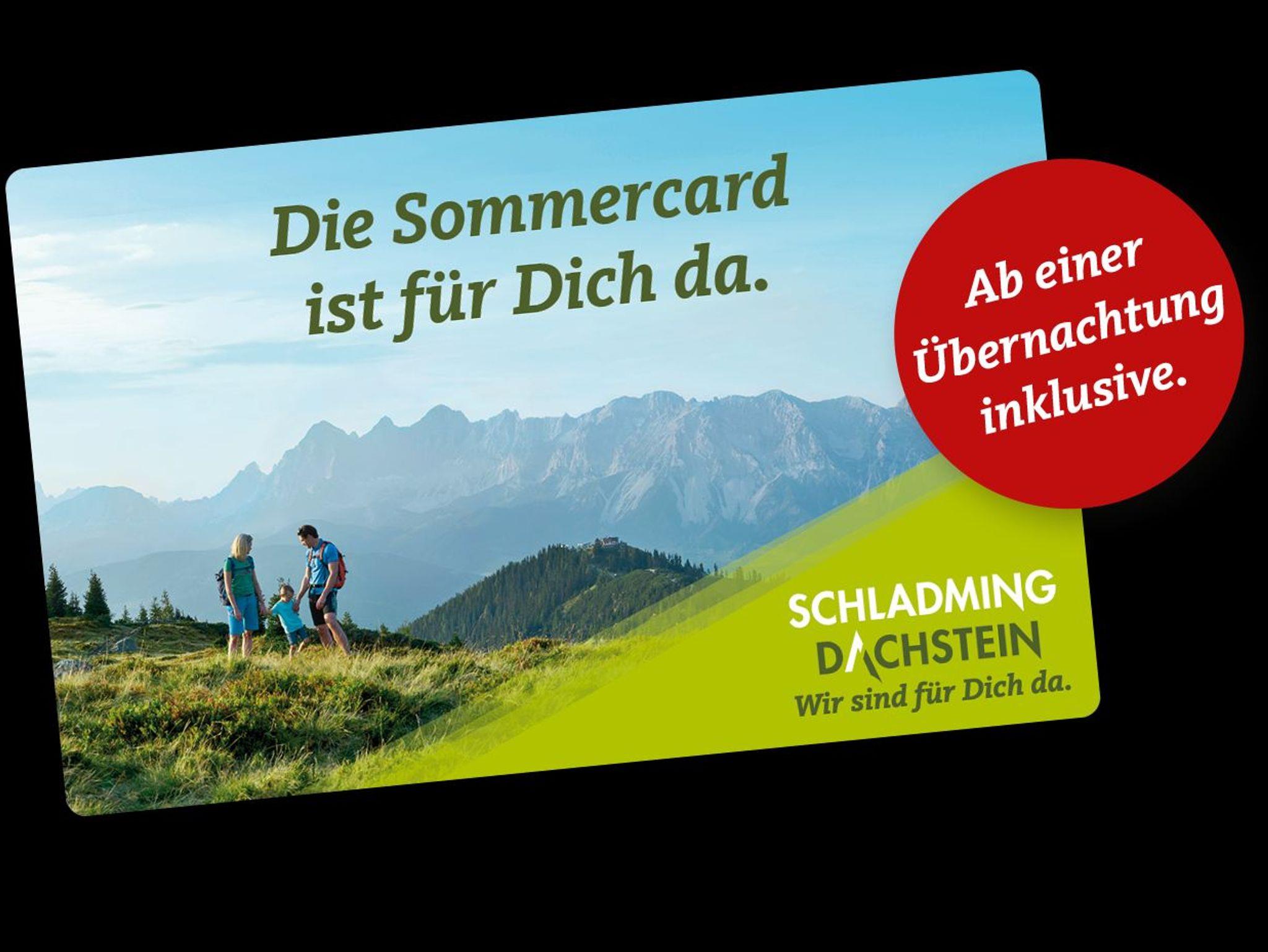 Im Sommer begeistert unsere Lage mit zahlreichen Aktivitäten. Ab einer Übernachtung erhalten Sie bei uns die Schladming-Dachstein Sommercard. Damit können Sie über 100 kostenlose Urlaubserlebnisse und viele weitere Bonusleistungen genießen und erleben. Außerdem können Sie täglich eine Berg- & Talfahrt Ihrer Wahl in Anspruch nehmen.