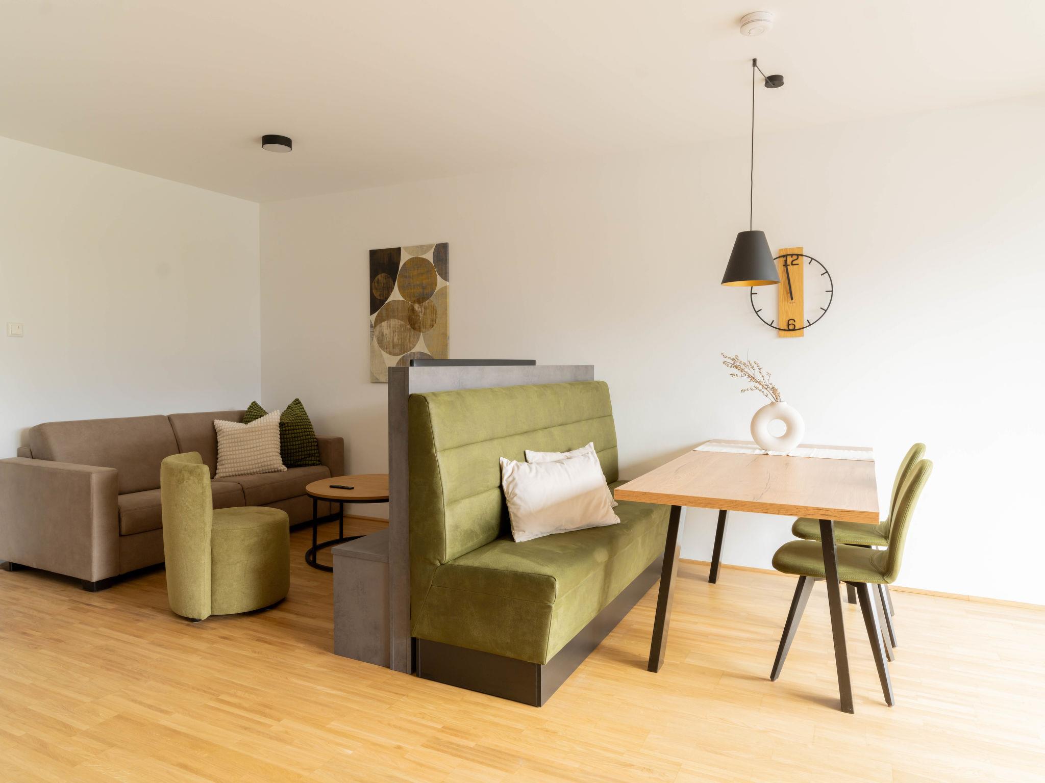 "be calm", 2-room apartment 53 m2, on the upper ground floor. Modern and stylish furnishings: entrance hall. 1 double bedroom with satellite TV and flat screen. Large kitchen-/living room (oven, dishwasher, 4 ceramic glass hob hotplates, toaster, electric coffee machine, Capsules for coffee machine (Nespresso) extra) with 1 double sofabed (1 x 160 cm, length 200 cm), dining table and satellite TV (flat screen), electric shutters. Exit to the balcony. Shower/WC. Heating. Parquet floors. Balcony 7 m2, south facing position. Balcony furniture. Beautiful view of the mountains. Facilities: hair dryer. Internet (WiFi, extra). Garage (1 car), height 210 cm. Please note: non-smokers only. Smoke alarm.