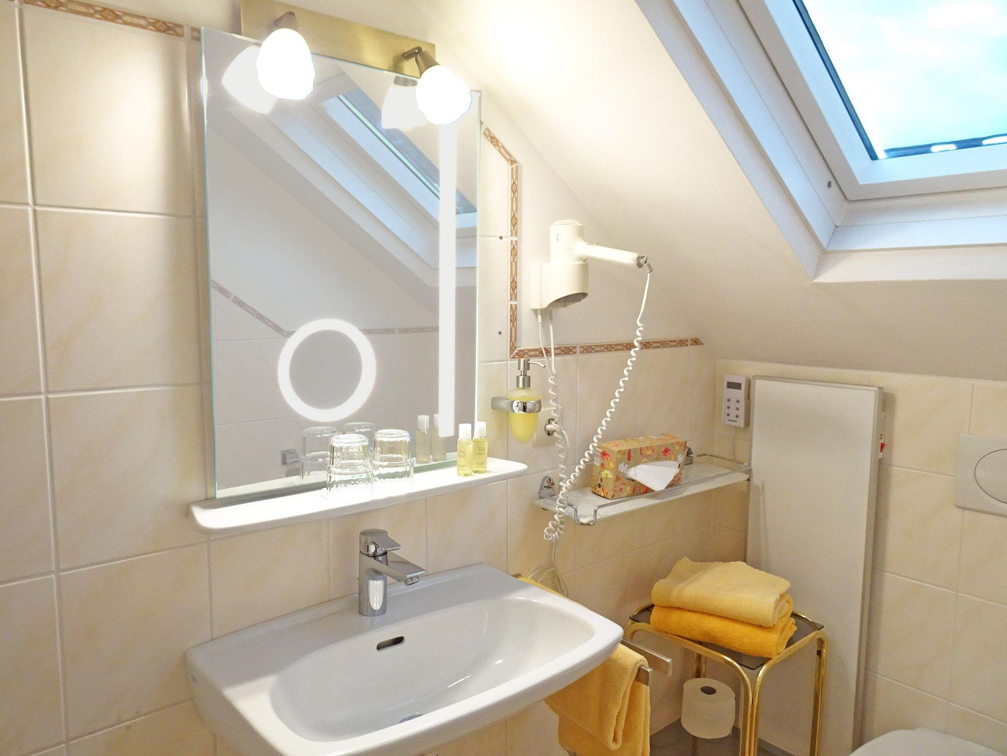 Verfliestes Bad mit Fön, Hand-/Badetüchern, Seifenspender, Kosmetiktüchern.