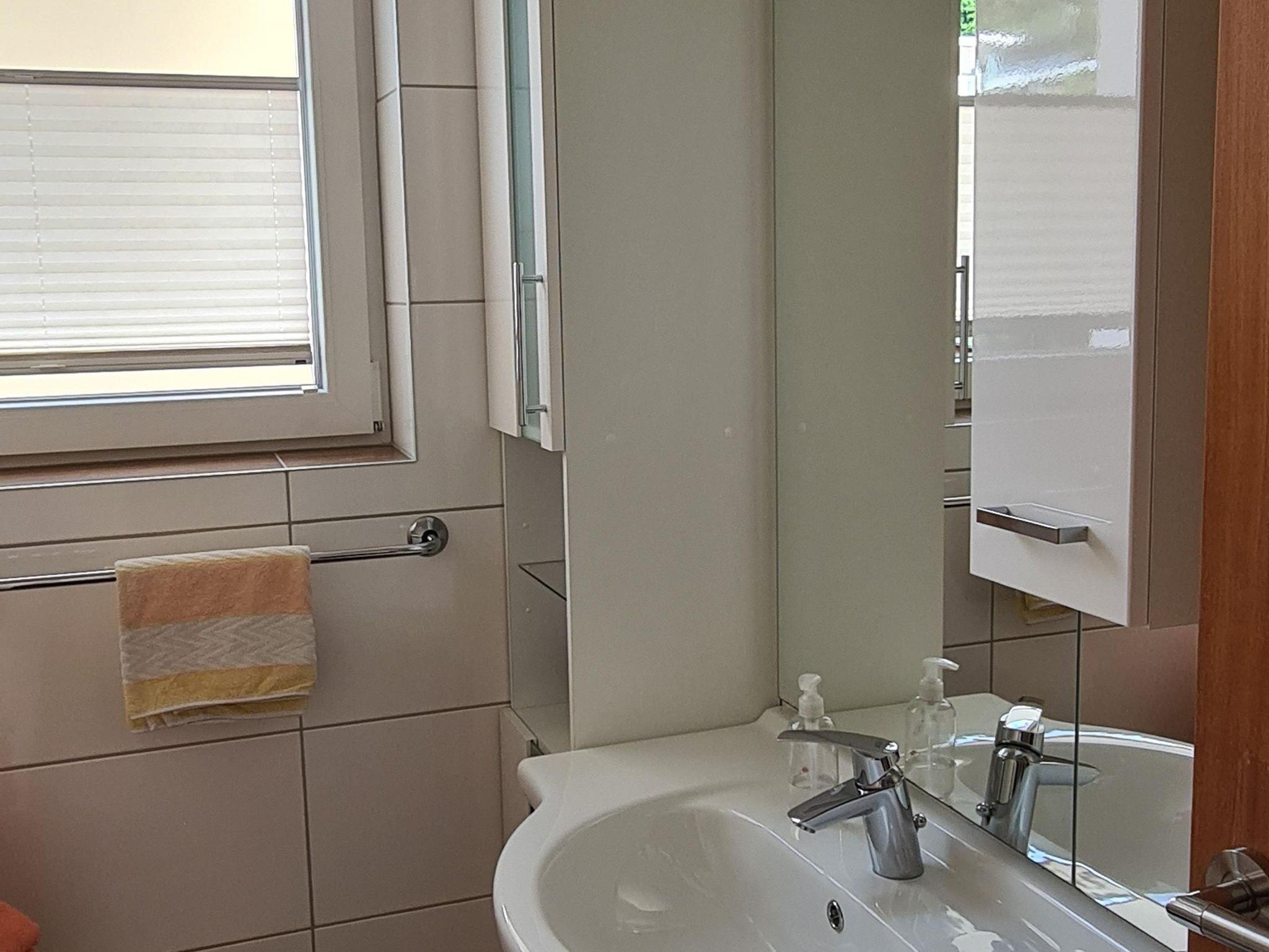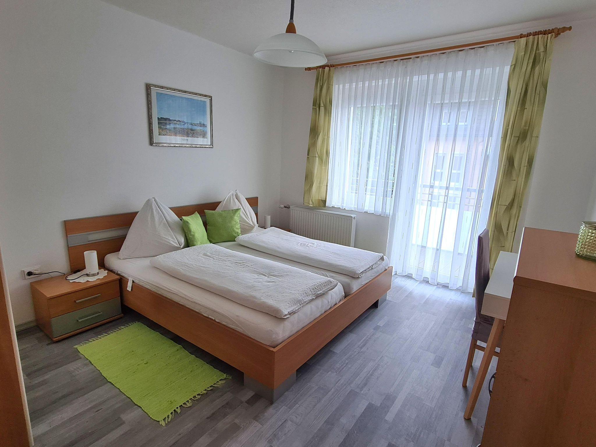 1 Schlafzimmer und das Wohnzimmer liegen südseitig mit Balkon (Seeblick), das 2. Schlafzimmer und die Küche sind nordseitig gelegen (ruhig mit Blick auf die Terrasse mit dem großen Tannenbaum).