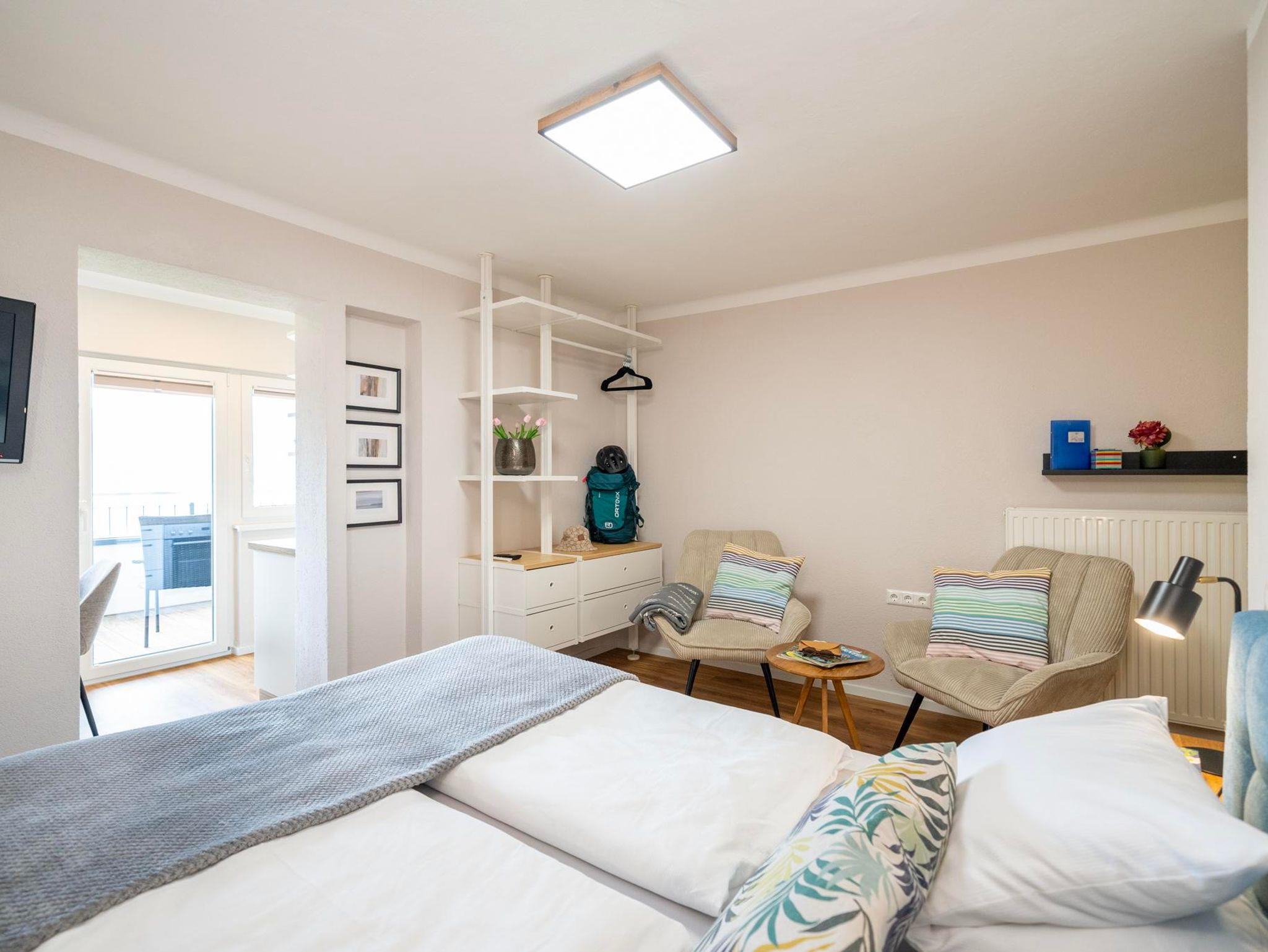 Die 60 m² große Ferienwohnung Seemöwe bietet zwei gemütliche Schlafzimmer sowie eine helle Essecke und einen einladenden Wohnbereich mit wunderschönem Blick auf den See. Der großzügige 20 m² große Balkon lädt dazu ein, den Tag bei einem entspannten Frühstück oder einem Glas am Abend ausklingen zu lassen.