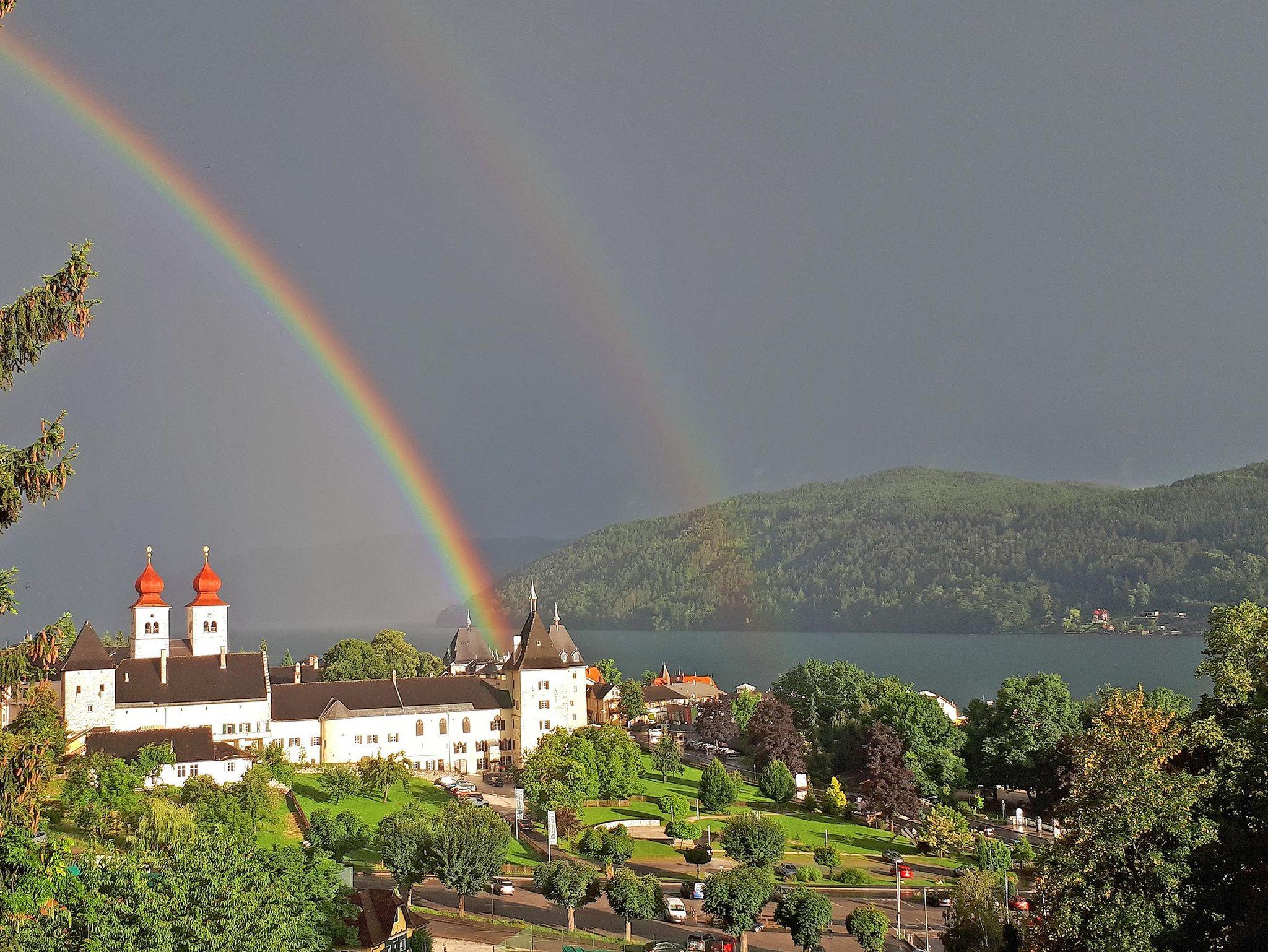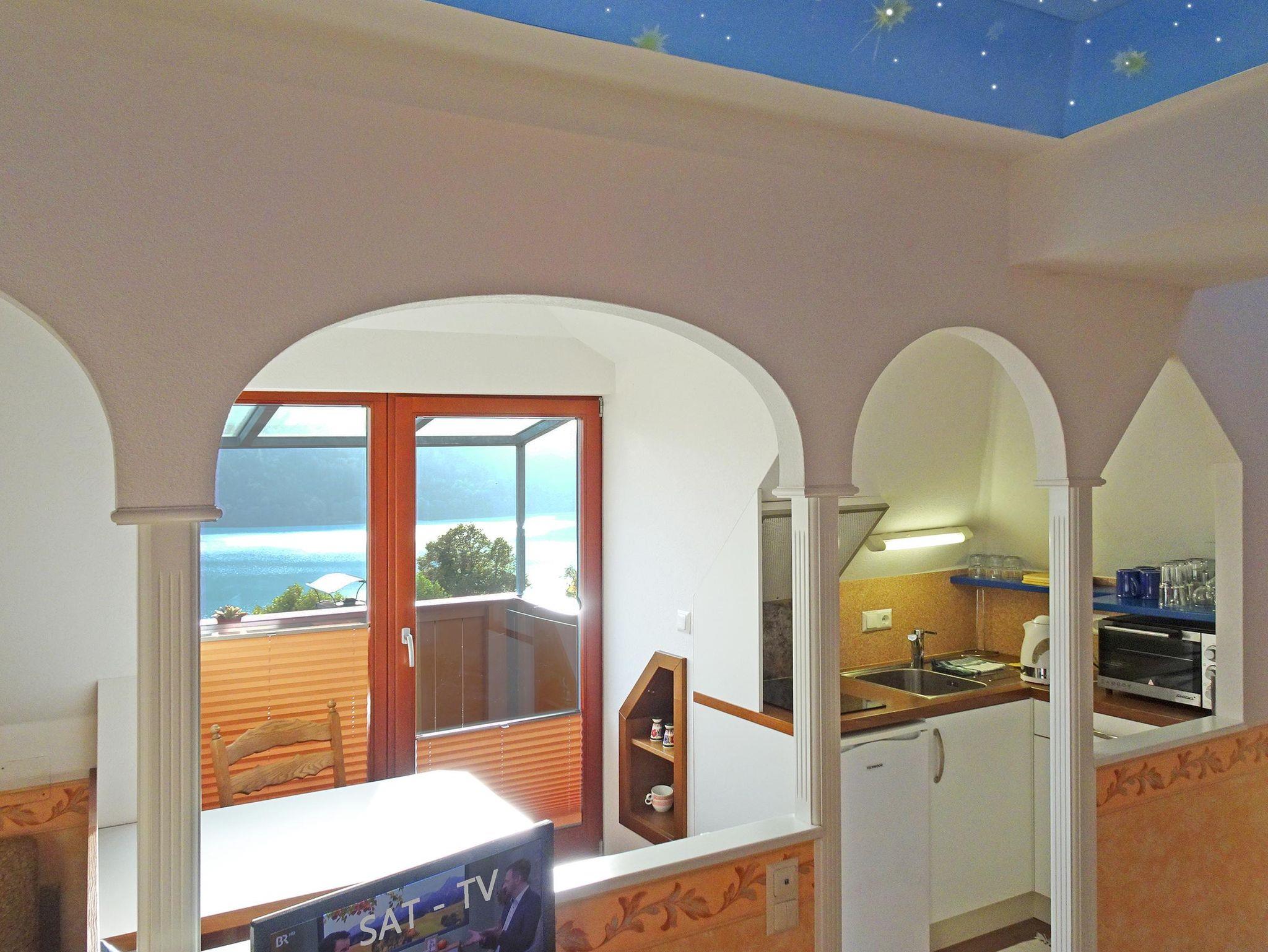 Gemütliches und gediegen eingerichtetes Doppelzimmer oder 3-Bettzimmer mit Couchliege, Kitchenette und Essecke. Möblierter Balkon (2,6m ²) mit Blick auf das malerische Ortsbild, den See in seiner gesamten Länge von 12 km und die Berglandschaft Oberkärntens – einfach fantastisch! Ausstattung: Doppelbett und optisch abtrennbares Extrabett. Nutzbar auch für einen dritten Erwachsenen zum Kinderpreis. Küchenzeile mit Kühlschrank, Kochplatte, Mini-Backofen, Wasserkocher und Spüle. Geschirr und Besteck vorhanden. Ohne Teppichboden und Vorhang als Allergikerzimmer geeignet. SAT-TV und LED Sternenhimmel. Verfliestes Bad mit Fön, Hand-/Badetüchern, Seifenspender, Kosmetiktüchern. Nichtraucher – Zimmer, Aschenbecher am Balkon. Lage: Im 4. Stock, Richtung Süd. Zentralheizung. BESONDERHEIT: Im 3.Stock des Treppenhauses treten Sie ins luftige Freie und steigen über eine Außentreppe ein paar Stufen ins „Sternenzelt“ unterm Turmdach hoch. Da kein Lift vorhanden, ist es für Menschen mit Treppensteig-Problemen nicht zu empfehlen! Die markante Raumform mit Mansarden und Gaupen zieht Sie in ihren Bann. Trotz Dachschräge ist der Raum groß und hoch genug, auch die Dachisolierung entspricht hohem Standard. Und wenn Sie vom bequemen Doppelbett aus den Blick in die Turmspitze gleiten lassen, können Sie wirklich die Sterne leuchten sehen… AUF ANFRAGE: Halbpension (nicht in unserem Haus, Partner Restaurant in 500 Metern Entfernung), oder auch ohne Verpflegung. Keine Haustiere!