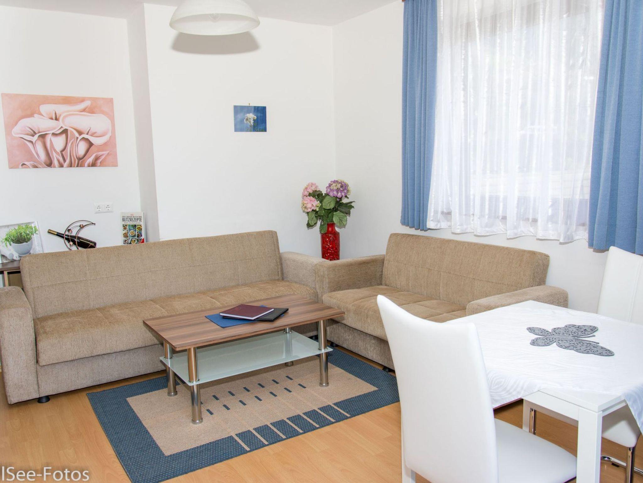 Die Küche ist komplett eingerichtet mit Geschirrspüler, Microwellenherd, Minibackofen, E-Herd, Kühlschrank, Kaffeemaschine und Geschirr. Bettwäsche und Handtücher sind vorhanden. Im gemütlichen Wohnzimmer steht ein SAT-TV- Gerät zur Verfügung.