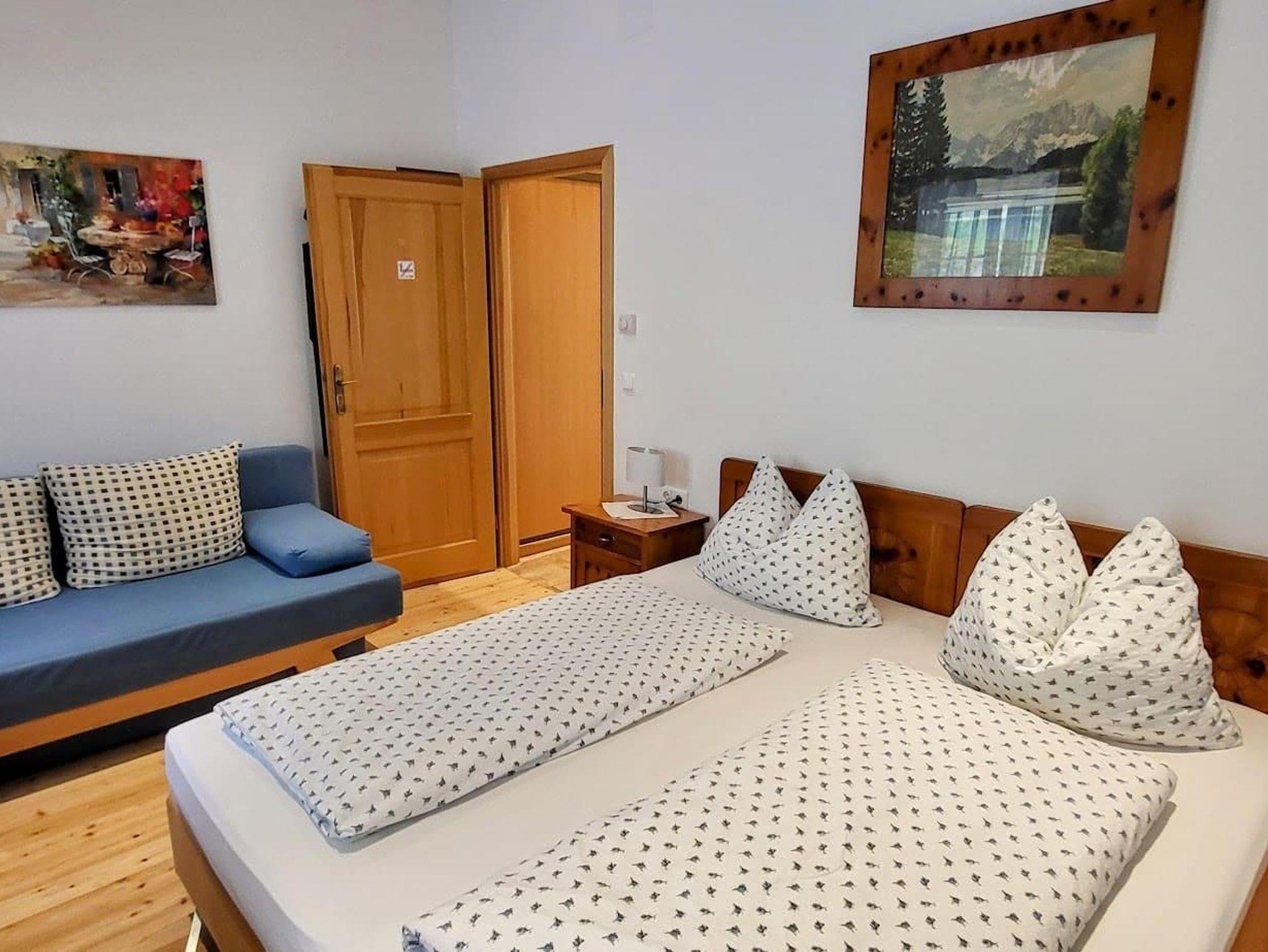 Das Familienzimmer hat ein Wohnzimmer mit Balkon und Seeblick, SAT TV und Kühlschrank, ein Schlafzimmer mit Doppelbett und extra Couch, ein Schlafzimmer mit zwei getrennten Betten, ein neu renoviertes Badezimmer mit Dusche, WC und zwei Waschbecken, Kühlschrank und WLAN. Größe ca 36m².
