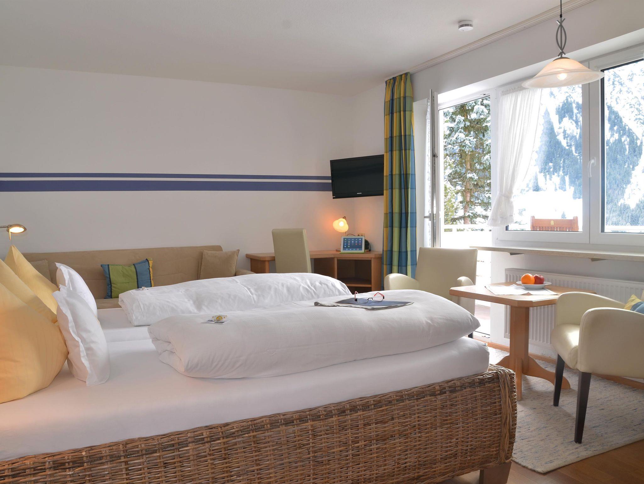 Doppelzimmer mit Doppelbett, Couch, Sitzecke, Schreibtisch, Kühlschrank,digitalisiertem Flachbildschirm, Telefon und Radio. Garderobenvorraum mit Schrank und Safe, Badezimmer mit Dusche/WC, Fön. Süd-Balkon mit grandioser Bergpanorama-Sicht oder Sonnen-Terrasse mit grandiosem Berg-Panoramablick, Liegewiese, Liegestühle und diverse Sitzgelegenheiten Mit Schlafcouch für 3.Person.