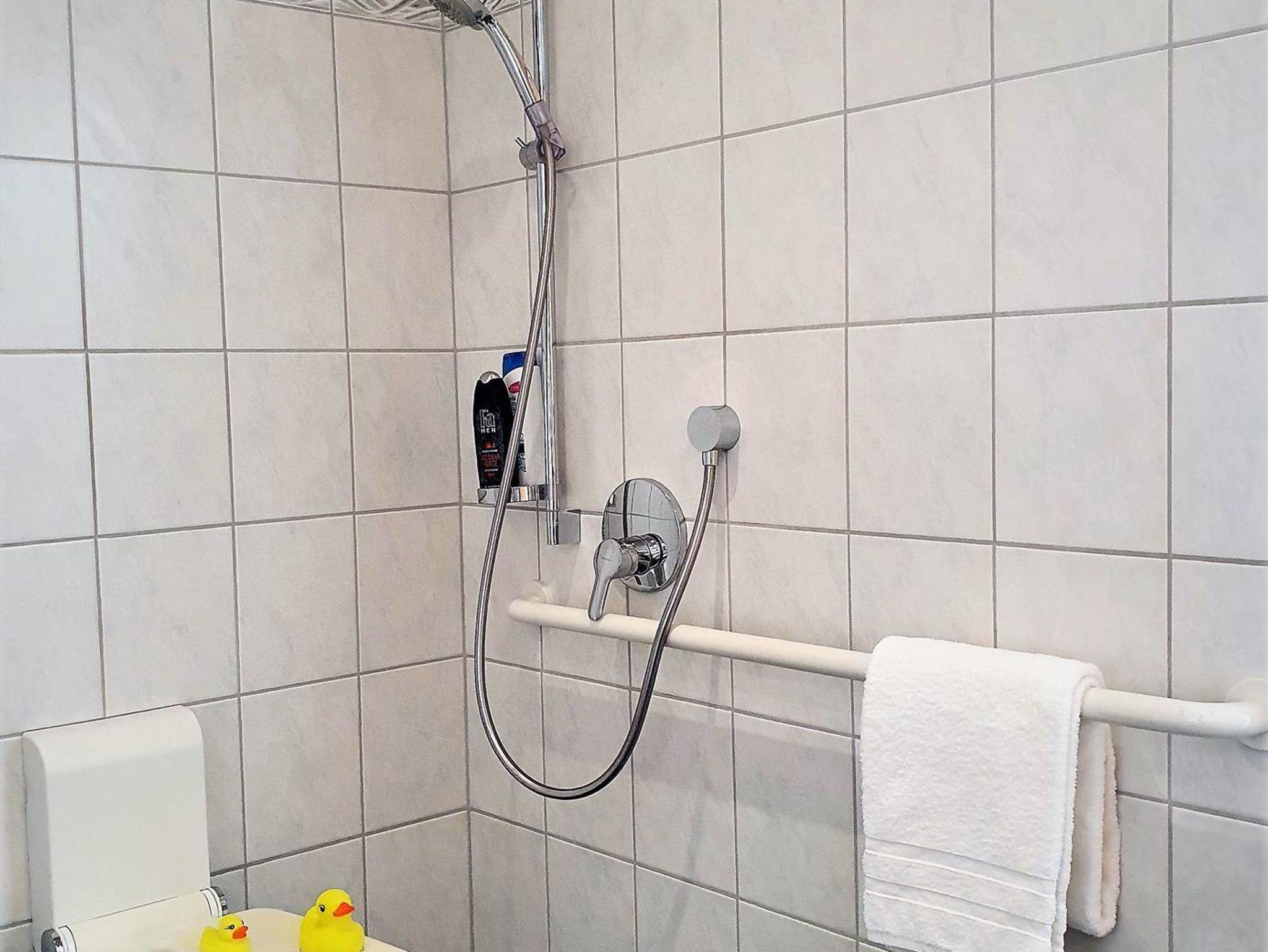 * breite bodenebene Dusche, automatisches WC, Waschbecken