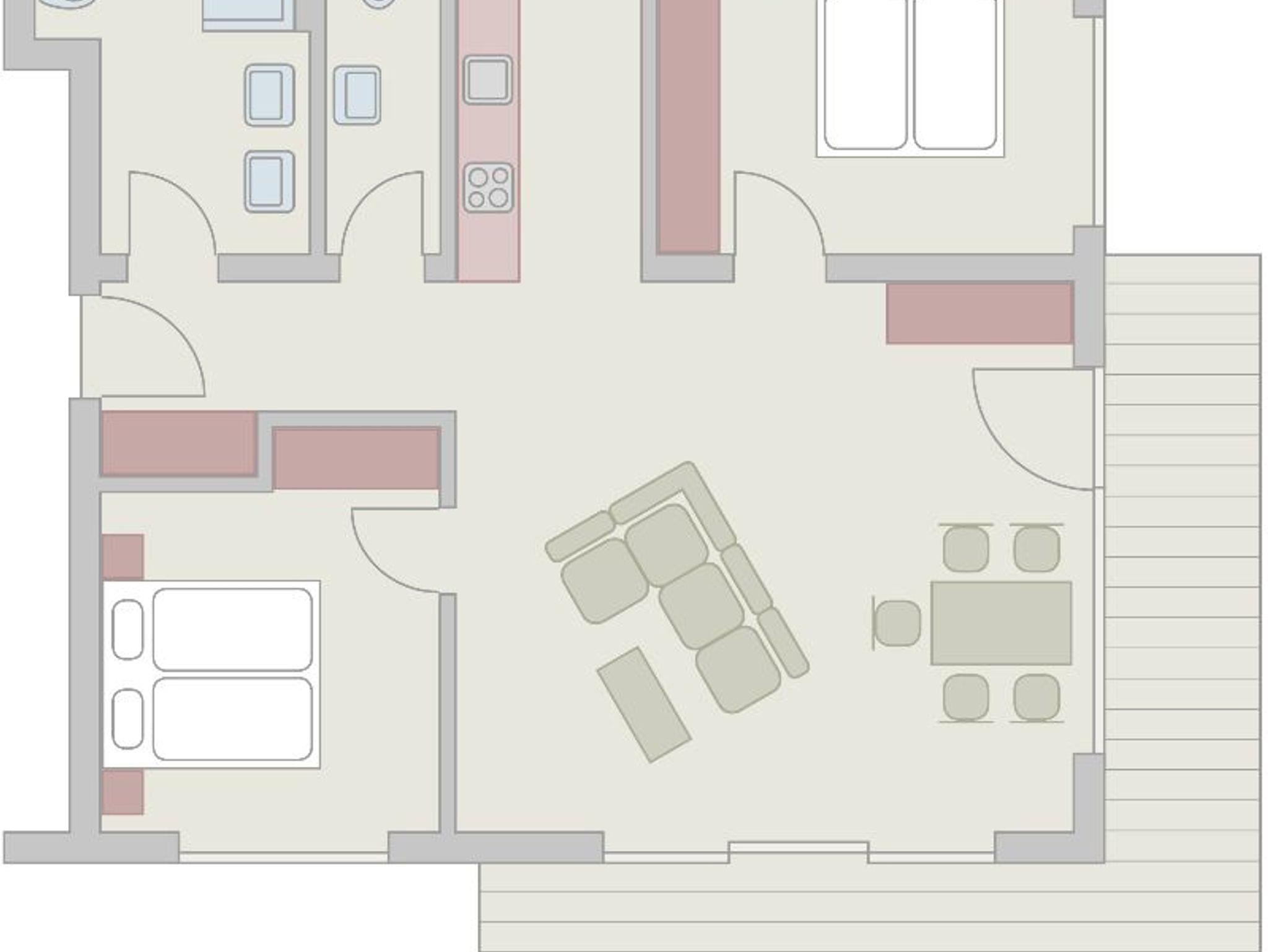 Die Ferienwohnung Hammerspitze liegt im Erdgeschoss der Walser Lodge. Die Wohnung verfügt über einen offenen Wohn-/ Küchen-/ Essbereich. Die Terrasse eignet sich wunderbar für Kinder und Sonnenbäder. Nach einem schönen Tag genießen Sie sehr gute Doppelbetten ohne Fußbegrenzung und extralange Deckbetten (220 cm). Das moderne helle Badezimmer bietet Dusche, WC und Doppelwaschbecken, zusätzlich gibt es ein separates WC. Entspannung bietet der Saunabereich mit Panorama-Ruheraum.