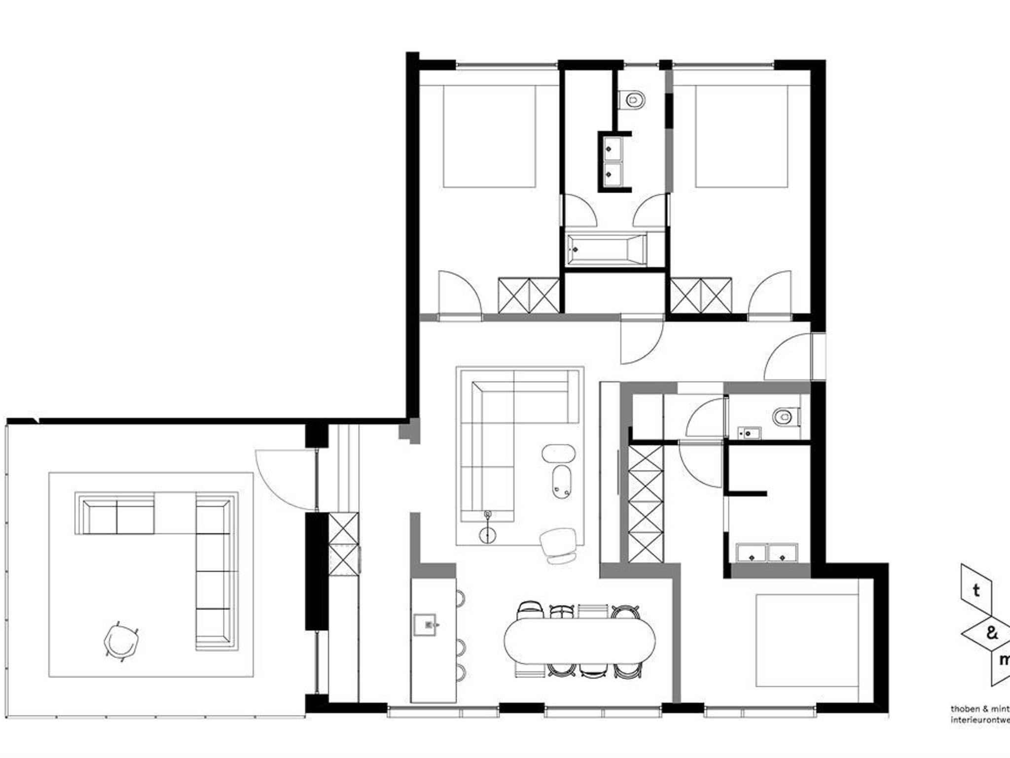 Das großzügige Apartment von ca. 100 m2 ist geeignet für 6 Personen und verfügt über 3 Schlafzimmer, 2 Badezimmer, 1 zusätzliches WC, eine moderne Küche mit Kochinsel und ein großes Wohnzimmer sowie eine große Dachterrasse.