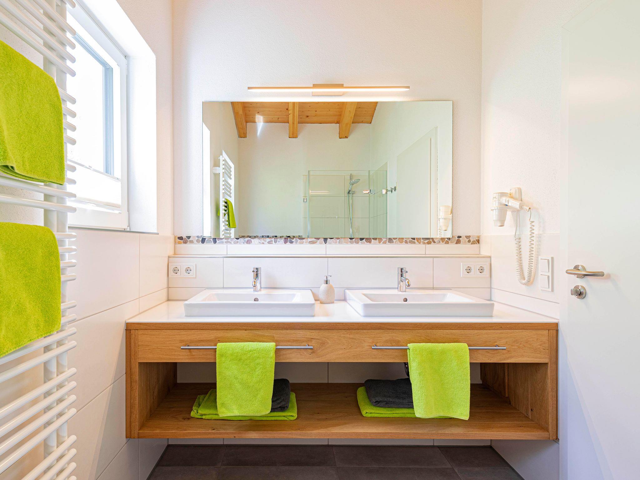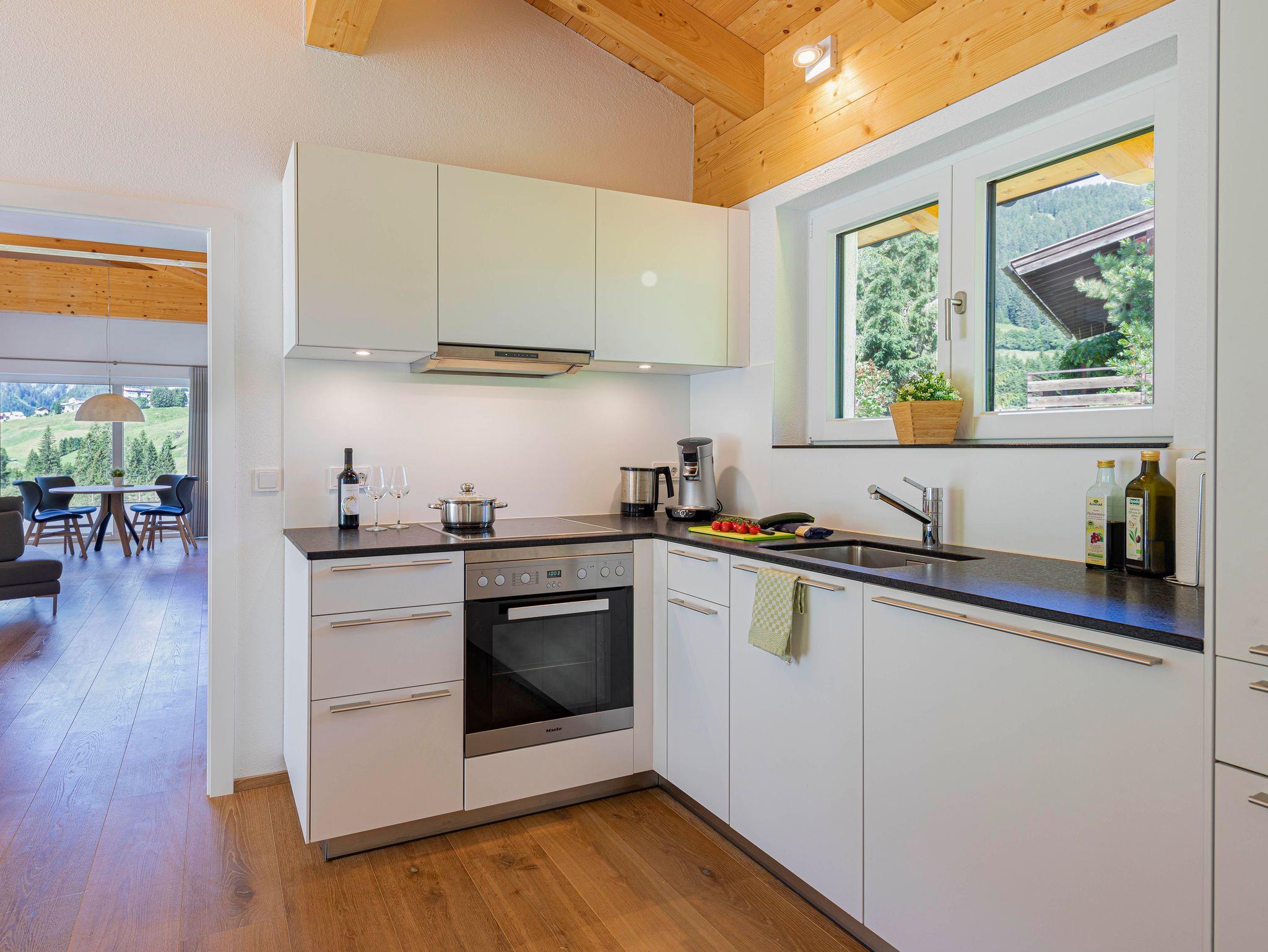 Das moderne helle Badezimmer mit Fenstern bietet Dusche, WC und Doppelwaschbecken und die Küche lädt mit Ihrer sehr guten Ausstattung auch zum Selber-Kochen ein.