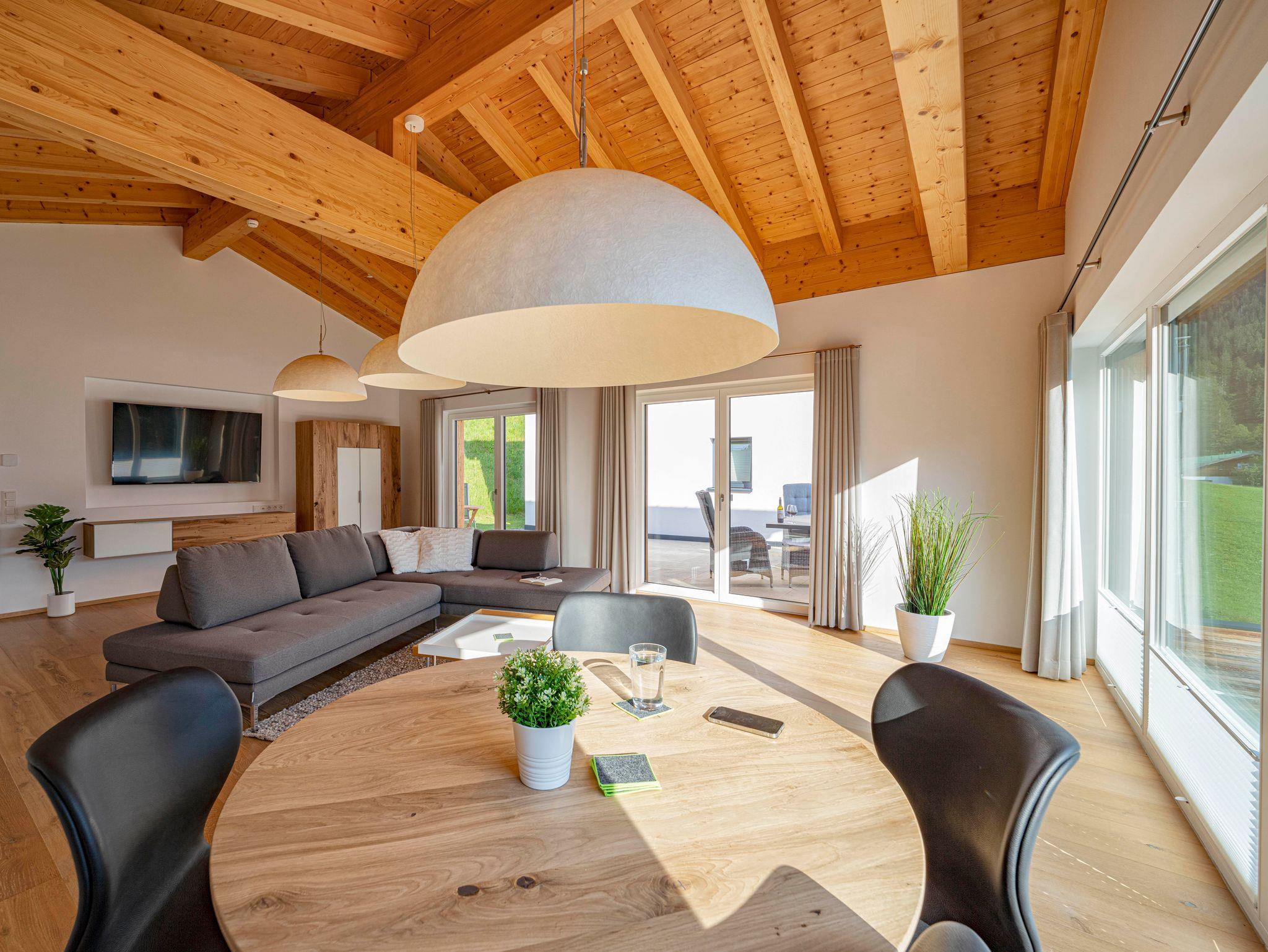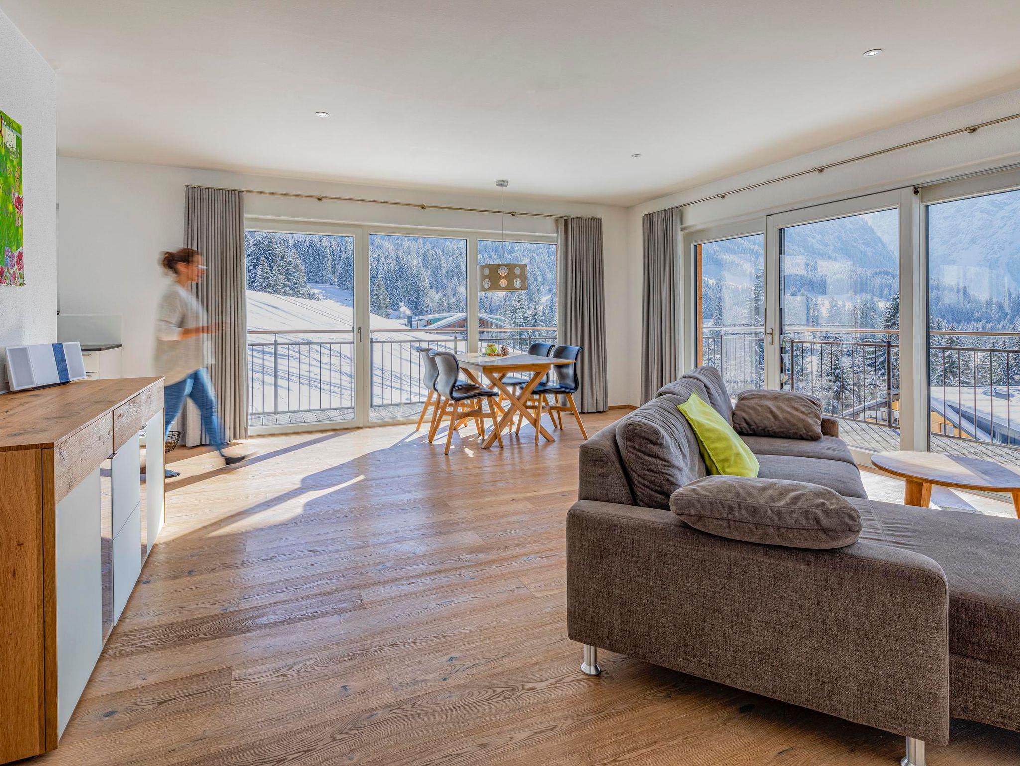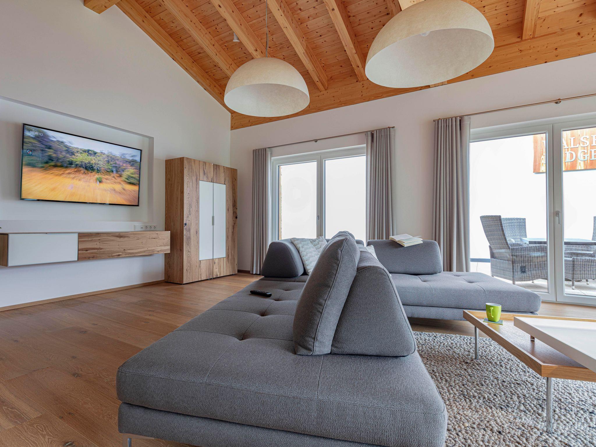 Die Wohnung bietet einen luxuriös großen Wohnraum, von dem aus Sie das phantastische Bergpanorama durch bodentiefe, sehr große Fenster genießen können - aber auch bei einem „Heim-Kino-Abend“ mit dem 70 Zoll (178 in der Diagonalen) großen Fernseher entspannen können.