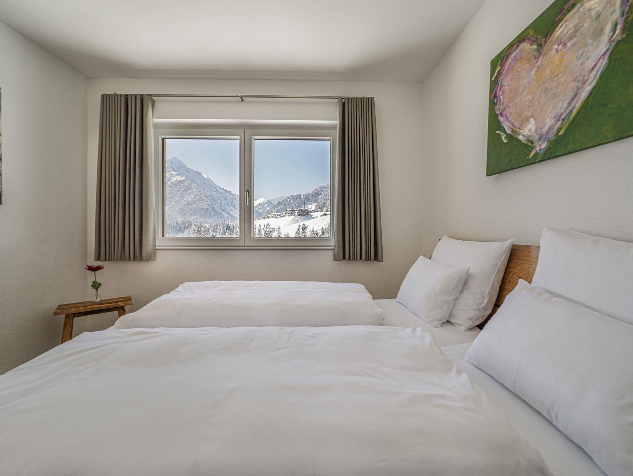 Die Ferienwohnung Zwölferkopf liegt im DG der Walser Lodge und lädt Sie ein, im hellen Wohn-/Küchen-/Essbereich mit den bodentiefen Fenstern das atemberaubende Bergpanorama zu genießen. Der große Eckbalkon davor lädt zum Sonnenbaden ein. Genießen Sie die hochwertigen fußrandlosen Doppelbetten mit extralangen Deckbetten (220 cm). Es gibt ein modernes Bad mit Dusche, WC und Doppelwaschbecken, dazu noch ein separates WC. Entspannen Sie im Saunabereich mit schönem Panorama-Ruheraum!