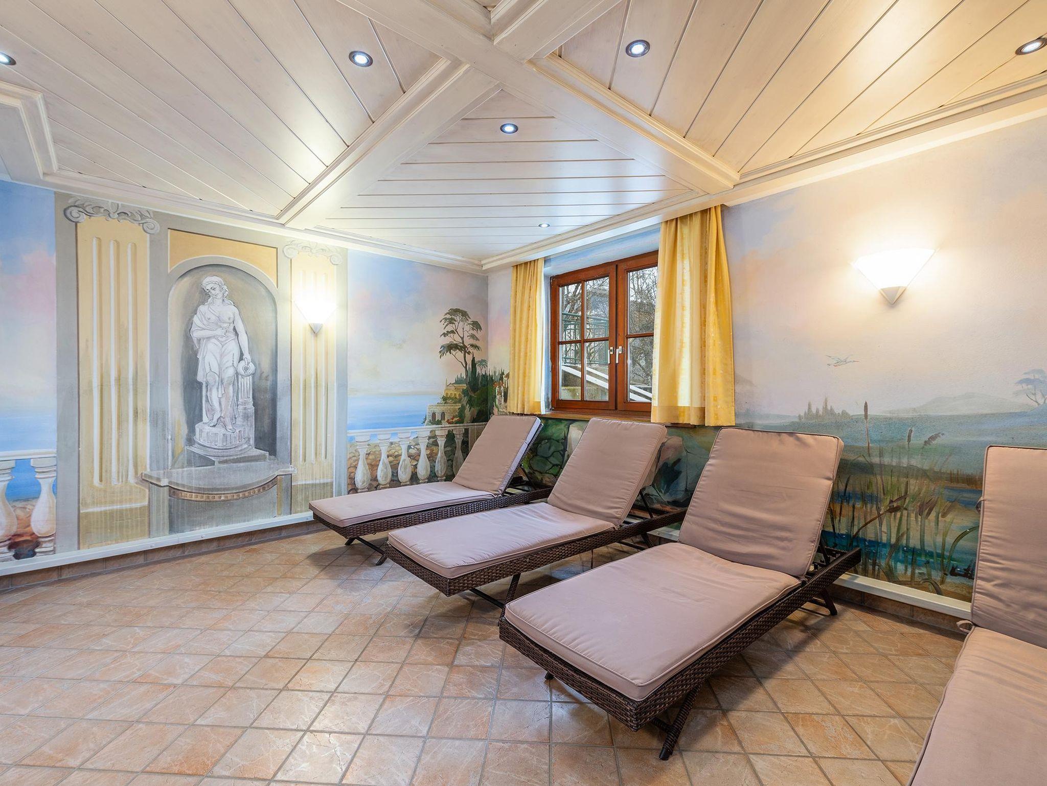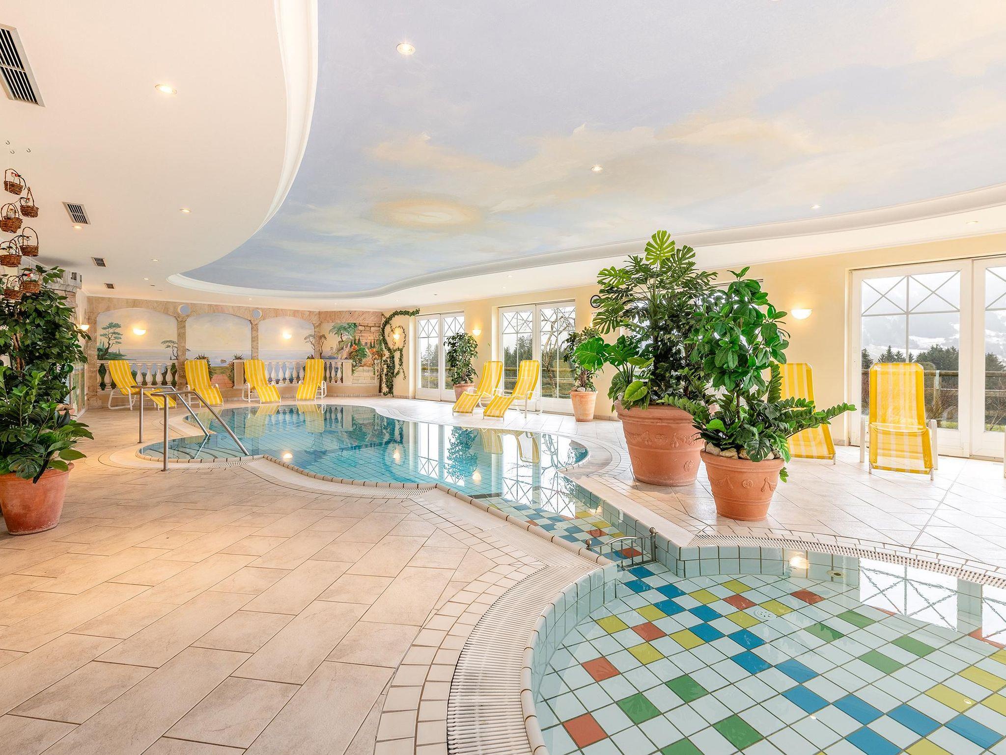 • Hallenbad mit abgetrenntem Wellnessbereich: Ein beheiztes Hallenbad läd zum Entspannen nach dem Wandern oder Schi fahren ein. Ergänzt wird dieses durch einen separaten modernen Wellnessbereich mit verschiedenen Saunen & Infrarotkabinen sowie einem Ruheraum. Für die Kleinen gibt es ein abgetrenntes Kinderbecken mit Rutsche sowie einen großzügigen Kinderspielplatz.