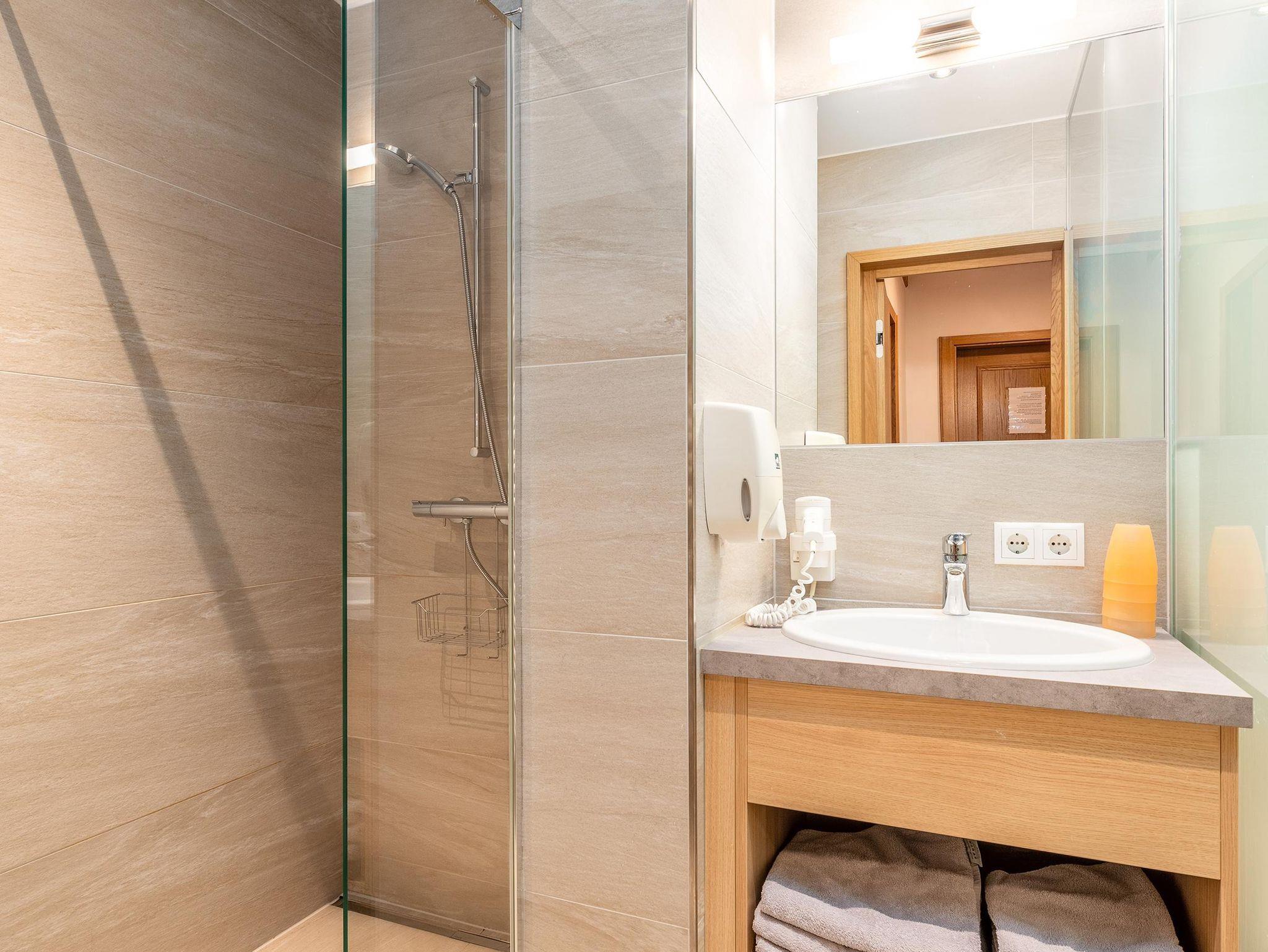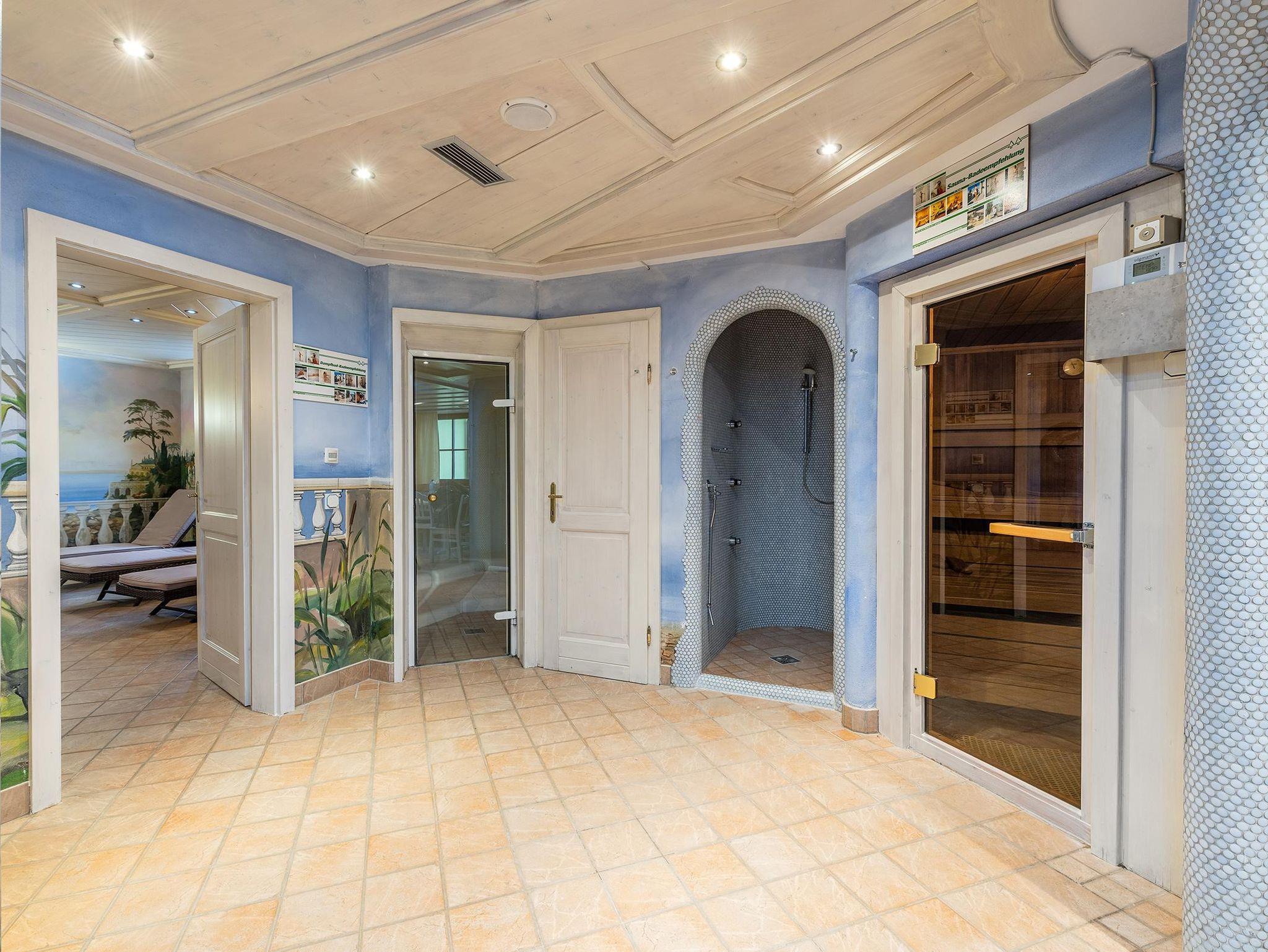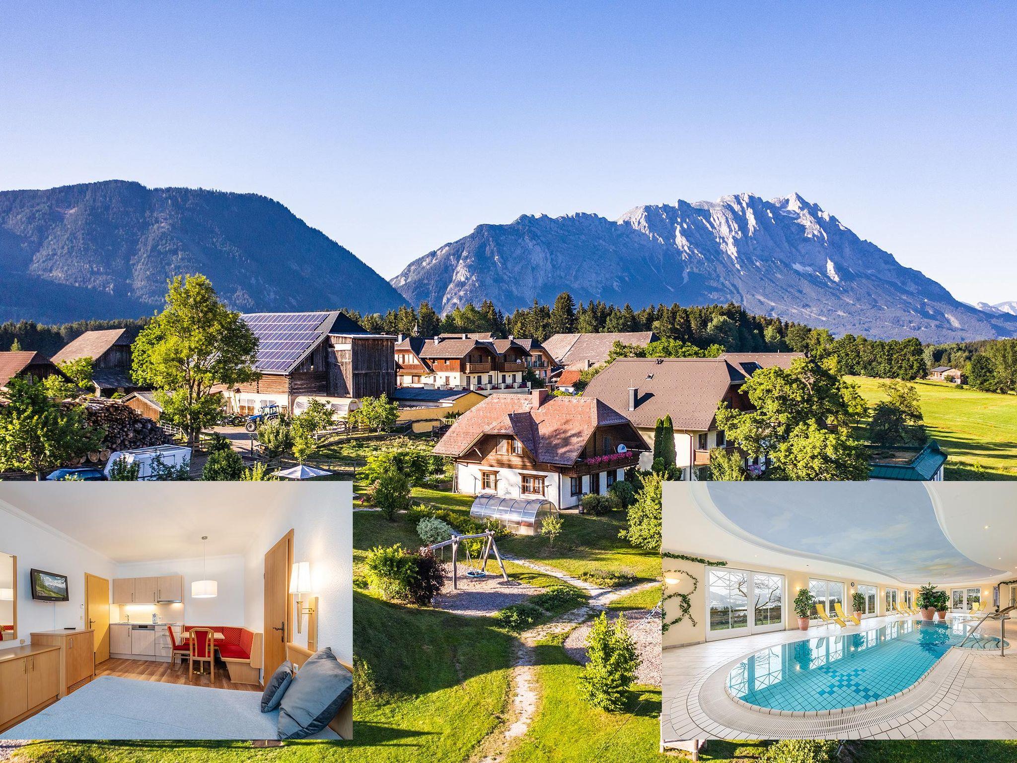 • Hallenbad mit abgetrenntem Wellnessbereich: Ein beheiztes Hallenbad läd zum Entspannen nach dem Wandern oder Schi fahren ein. Ergänzt wird dieses durch einen separaten modernen Wellnessbereich mit verschiedenen Saunen & Infrarotkabinen sowie einem Ruheraum. Für die Kleinen gibt es ein abgetrenntes Kinderbecken mit Rutsche sowie einen großzügigen Kinderspielplatz.