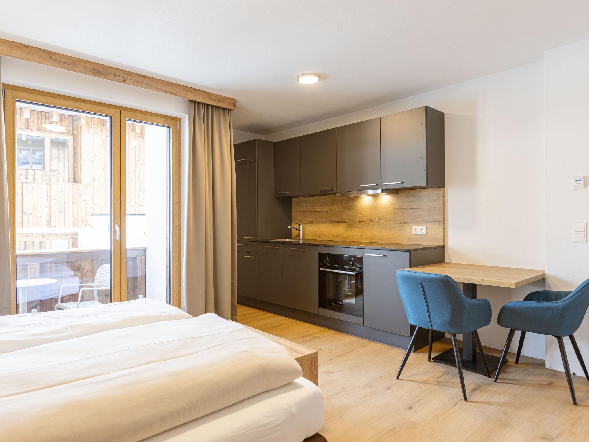 "Studio für 2 Personen", 1-room apartment 24 m2. Bright, modern furnishings: living/sleeping room with 1 double bed, dining table and satellite TV (flat screen). Open kitchen (dishwasher, 4 ceramic glass hob hotplates, toaster, kettle, microwave, electric coffee machine). Shower/WC. Heating. Balcony. Balcony furniture. Beautiful panoramic view of the mountains. Facilities: Internet (WiFi, free). Please note: non-smokers only. The property is one of a type of property or apartment. 50613-0018308-2024